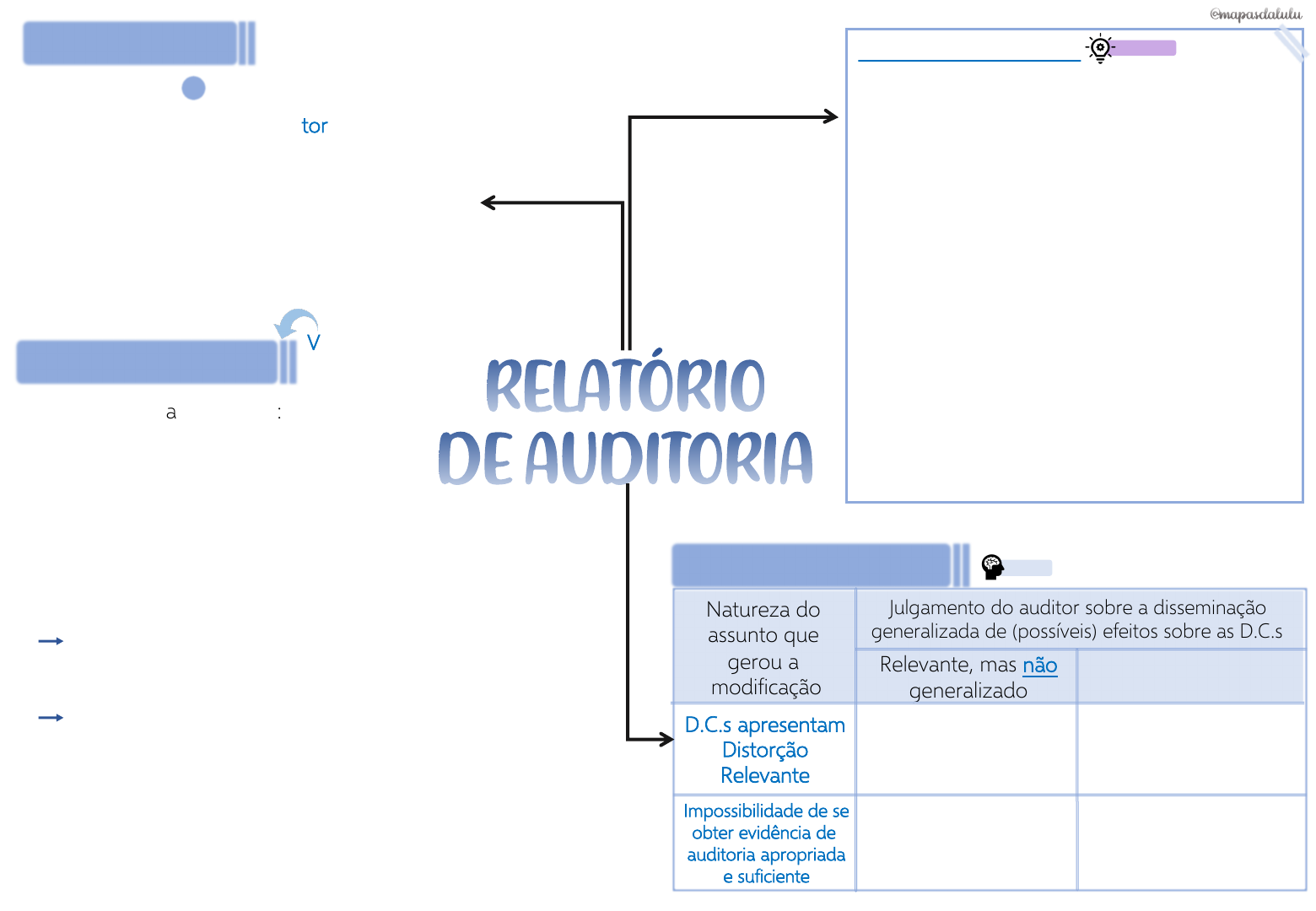 ESTRUTURA DO RELATÓRIO Título e destinatário 1. Opinião (sempre a primeira) 2. Base para opinião (sempre a segunda) Ordem facultativa: 3. Incerteza relevante relacionada à continuidade operacional 4. Principais assuntos de auditoria 5. Outras informações que acompanham as DCs e o relatório do auditor 6. Responsabilidades da administração 7. Responsabilidades do auditor pela auditoria das DCs 4. Parágrafo de Ênfase Nome do sócio/responsável, assinatura, endereço e data. ● Não modificada : ● Quando o auditor conclui que as D.C.s foram elaboradas, em todos os aspectos relevantes, de acordo com a estrutura de relatório financeiro aplicável ● Modificada: ● Quando o auditor: Concluir que as D.C.s apresentam distorção relevante. Não conseguir obter evidência de auditoria apropriada e suficiente para concluir que as D.C.s não apresentam distorção relevante. ● Tipos: ● Com ressalva ● Adversa ● Abstenção de opinião ● Anteriormente “parecer de auditoria” ● Apresenta a opinião do auditor ● Data posterior à da obtenção da evidência de auditoria apropriada/suficiente. ● Nome do sócio do trabalho ou responsável técnico deve ser incluído. ● Deve ser escrito. relatório de auditoria ASPECTOS GERAIS OPINIÃO DO AUDITOR OPINIÃO MODIFICADA ( )= sua conclusão ( )“Limpa” ( )Está tudo OK! DECORE! Vem no início do relatório D.C.s apresentam Distorção Relevante Impossibilidade de se obter evidência de auditoria apropriada e suficiente Natureza do assunto que gerou a modificação Julgamento do auditor sobre a disseminação generalizada de (possíveis) efeitos sobre as D.C.s Relevante, mas não generalizado = ( ) Opinião Adversa Opinião com ressalva Relevante e generalizado Opinião com ressalva Abstenção de opinião com base na evidência de auditoria obtida NOVIDADE! relatório de auditoria COMUNICAÇÕES ADICIONAIS= = PARÁGRAFO DE ÊNFASE PARÁGRAFO DE OUTROS ASSUNTOS ( )que descreva de forma completa o assunto + ● Referente a um assunto apropriadamente apresentado/ divulgado nas D.Cs que, de acordo com o julgamento do auditor, é de tal importância que é fundamental para o entendimento pelos usuários. ● Sua inclusão não afeta a opinião, nem substitui uma opinião modificada. ● Desde que: ● Como resultado desse assunto, não fosse exigido que o auditor modificasse sua opinião ● O assunto não seja “principal assunto de auditoria” ● Circunstâncias para seu uso: ● Incerteza relativa ao desfecho futuro de litígio excepcional/ação regulatória ● Aplicação antecipada de nova norma contábil antes de sua vigência ● Catástrofe com efeito significativo sobre a posição financeira/patrimonial ● O auditor deve incluir uma referência clara ao assunto enfatizado nota explicativa. ● Referente a um assunto não apresentado ou divulgado nas D.C.s que, de acordo com o julgamento do auditor, é de tal importância que é fundamental para o entendimento pelos usuários: ● Da auditoria ● Da responsabilidade do auditor ● Do relatório de auditoria ● Desde que: ● Não seja proibido por lei/regulamento ● O assunto não seja “principal assunto de auditoria”