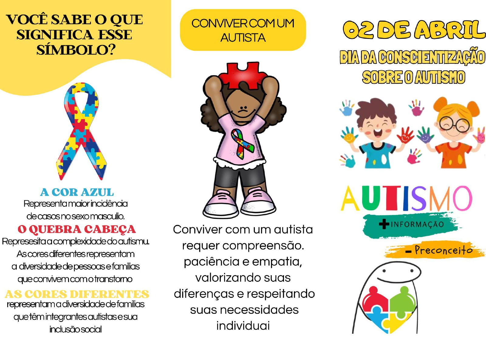 <p>VOCÊ SABE O QUE CONVIVERCOMUM SIGNIFICA ESSE ABRIL AUTISTA SÍMBOLO? SOBREOAUTISMO A COR AZUL AUTISMO INFORMAÇÃO QUEBRA CABEÇA Conviver com um autista Represesita a complexidade do autismu. requer compreensão. - Preconceito Ascores diferentes representam a diversidade de pessoas e familias paciência e empatia, queconvivem como transtorno valorizando suas AS CORES DIFERENTES diferenças e respeitando representamadiversidade de familias suas necessidades quetêm integrantes autistas e sua inclusãosocial individuai</p><p>0 QUE É 0 TRASNTORNO SINAIS IMPORTANTE TODAS AS CRIANÇAS DE ALERTA PARA AUTISTAS POSSUI DE ASPECTRO AUTISTA? ALTERAÇÕES NO CEREBRO: AUTISMO: Autismo Transtorno do Espectro Autista (TEA) é uma condição neurológica ANDAR NA PONTA ESTEREOTIPIAS DOS que afeta desenvolvimento, especialmente nas áreas da ALGUMAS CARACTERISTICAS comunicação, interação social e DE PESSOAS COM TEA: comportamento. Caracteriza-se por dificuldades na comunicação, DIFICULDADE NA COMUNICAÇÃO padrões de comportamento DIFICULDADE EM ENTENDER AS EMOÇÕES repetitivos e interesses restritos. É uma condição altamente POUCA INTERAÇÃO SOCIAL Individualizada, variando de leve a grave, e não tem cura, mas DIFICULDADE DE CONCENTRAÇÃO Watervenções precoces podem ajudar a melhorar a qualidade de PREFERE BRINCAR ATRASO vida ALTERAÇÕES DE COMPORTAMENTO SOZINHO NA FALA</p>