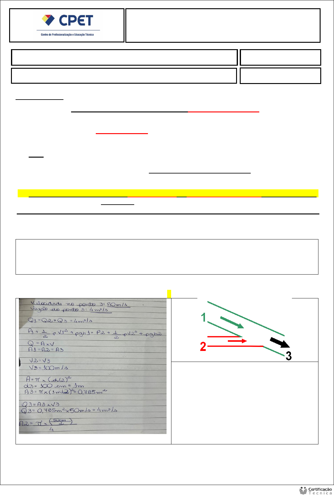 <p>Hidráulica Conceitos Essenciais</p><p>Aluno (a): Ana Carolina de Amorim Data: 23/08/2024</p><p>Hidráulica Conceitos Essenciais</p><p>Avaliação Prática Final</p><p>This content is RESTRICTED.</p><p>INSTRUÇÕES:</p><p>POR FAVOR, LEIA AS INSTRUÇÕES:</p><p>❖ Preencha os dados no Cabeçalho para sua identificação;</p><p>❖ Esta Avaliação contém 02 (duas) questões, totalizando 10 (dez) pontos;</p><p>❖ Leia com atenção os enunciados e faça o que se pede;</p><p>❖ As respostas devem ser digitadas abaixo de cada pergunta;</p><p>❖ NÃO serão aceitas respostas e textos retirados da íntegra Internet, assim como imagens (desde que</p><p>seja pedida). A interpretação e execução fazem parte do processo.</p><p>❖ Ao terminar grave o arquivo com o nome APF Disciplina – Nome do Aluno;</p><p>❖ Só serão aceitas as extensões .docx (M.S. Word) ou .PDF;</p><p>❖ Envie o arquivo pelo sistema no local indicado;</p><p>❖ Atividades enviadas “em branco”, plagiadas de sites ou repetidas de outros alunos, terão notas ZERO.</p><p>❖ Verifiquem no campo de comentário o feedback dado pelo tutor.</p><p>❖ Em caso de dúvidas consulte o seu Tutor.</p><p>1) Apresente as principais diferenças entre a equação da continuidade e a equação de Ber-</p><p>noulli.</p><p>A equação da continuidade expressa a conservação de massa do fluido, ou seja, o fato básico de</p><p>que massa não pode ser criada nem destruída, a equação de Bernoulli expressa a conservação</p><p>da energia do fluido, respeitando o modelo de fluido que utilizamos.</p><p>2) Diante do escoamento em regime permanente que ocorre na tubulação representada pela imagem</p><p>abaixo, calcule a velocidade e a vazão no ponto 3.</p><p>3) Dados: Q1 = 4 m³/s; d2 = 50 cm; V2 = 100</p><p>m/s; d3 = 100 cm.</p>