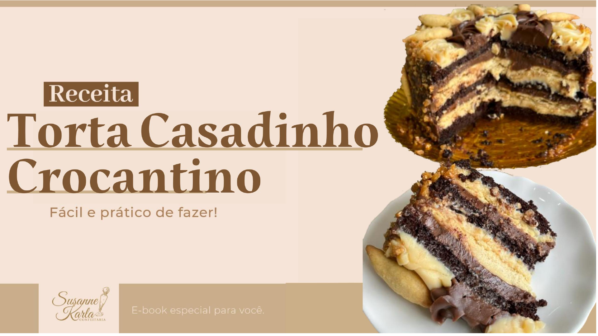 <p>Susanne</p><p>Karla</p><p>Olá!</p><p>Sou Susanne Karla, chef confeiteira da “Susanne Karla</p><p>Confeitaria”, comecei na confeitaria há 20 anos, sem nenhum</p><p>recurso financeiro e com pouco conhecimento, mas em</p><p>compensação tinha muita determinação, criatividade e muito</p><p>amor pela confeitaria.</p><p>Ao longo do tempo, fui me aperfeiçoando e me apaixonando</p><p>cada vez mais pela confeitaria. Entre erros e acertos, sempre</p><p>procurei focar em criar minhas próprias receitas, combinando</p><p>os melhores recheios, aprimorando minhas massas, enfim,</p><p>muitos testes para obter receitas exclusivas e com alto padrão</p><p>de qualidade.</p><p>Massa</p><p>4 ovos (240g);</p><p>150g de óleo;</p><p>350g de açúcar;</p><p>240g de água filtrada;</p><p>10ml (1 colher de sopa) de extrato de baunilha;</p><p>60g de cacau em pó 100%;</p><p>240g de farinha de trigo peneirada;</p><p>10g de fermento químico peneirado;</p><p>4g de bicarbonato de sódio peneirado.</p><p>Pré-aqueça o forno a 180°C por 10 min.</p><p>Bata muito bem os ovos com o óleo no liquidificador, em</p><p>seguida acrescente o açúcar, o cacau, a água, o extrato de</p><p>baunilha e bata tudo até homogeneizar.</p><p>Desligue o liquidificador e transfira a mistura para um bowl,</p><p>acrescente a farinha de trigo, o fermento e o bicarbonato e</p><p>misture delicadamente com um fuê.</p><p>Despeje a massa em uma forma de 22cm de diâmetro forrada</p><p>com papel toalha apenas no fundo da forma.</p><p>Leve ao forno pré-aquecido por aproximadamente 35min, ou</p><p>até que, enfiando um palito na massa, ele saia limpo.</p><p>Espere a massa amornar, cubra com um plástico filme e leve</p><p>ao refrigerador por 8hr antes de utilizar.</p><p>PREPARO</p><p>Recheio 1 e cobertura</p><p>3 lata de leite condensado (1185g);</p><p>3 caixa de creme de leite (600g);</p><p>100gde leite em pó;</p><p>60gde manteiga sem sal;</p><p>25g de farinha de trigo (sem fermento);</p><p>350g de chocolate nobre branco.</p><p>Bata no liquidificador o creme de leite, a farinha de trigo e o leite em</p><p>pó, até ficar tudo homogeneizado.</p><p>Coloque essa mistura em uma panela, acrescentando os demais</p><p>ingredientes: leite condensado, manteiga e chocolate branco. Leve ao</p><p>fogo médio mexendo sempre até cozinhar e engrossar.</p><p>Desligue o fogo, transfira para um bowl, cubra com um plástico filme</p><p>e espere esfriar completamente para utilizar no recheio e na</p><p>decoração da torta.</p><p>Separa 600g para a decoração, aproximadamente.</p><p>PREPARO</p><p>Recheio de Brigadeiro Branco Cremoso</p><p>Recheio 2 cobertura</p><p>3 latas de leite condensado (395g cada);</p><p>3 caixas de creme de leite (200g cada);</p><p>60g de manteiga sem sal;</p><p>40g de chocolate em pó 50% (Utilizo Melken Harald);</p><p>250g de chocolate meio amargo.</p><p>Bata no liquidificador o creme de leite com o chocolate em pó até</p><p>homogeneizar.</p><p>Transfira essa mistura para uma panela e acrescente os demais</p><p>ingredientes: leite condensado, manteiga e chocolate meio amargo.</p><p>Misture bem e leve ao fogo médio sempre mexendo até cozinhar e</p><p>engrossar.</p><p>Desligue o fogo e transfira esse recheio para um bowl, cubra com um</p><p>plástico filme e espere esfriar completamente para utilizar no recheio</p><p>e na decoração da torta.</p><p>Separa uma parte para cobertura e decoração, aproximadamente</p><p>600g.</p><p>PREPAROBrigadeiro Cremoso de Chocolate</p><p>Sequilho Amanteigado</p><p>200g de manteiga sem sal (temperatura ambiente)</p><p>100g de açúcar refinado.</p><p>2g de sal</p><p>50g de castanha de caju triturada</p><p>6g de pasta saborizante de baunilha ou extrato de</p><p>baunilha;</p><p>300g de farinha de trigo</p><p>Em um bowl comece misturando a manteiga, o açúcar, a castanha de</p><p>caju triturada e a baunilha.</p><p>Em seguida, acrescente a farinha de trigo e misture bem até que</p><p>desgrude das mãos.</p><p>Separe uma pequena parte para fazer os biscoitinhos para a</p><p>decoração da torta. O restante da massa disponha em duas formas de</p><p>22cm de diâmetro com fundo falso.</p><p>Espalhe com as mãos e finalize alisando com uma colher ou uma</p><p>espátula para nivelar. Leve para assar em forno pré-aquecido a 180°</p><p>por 15min ou até que fique levemente dourados e assados</p><p>PREPARO</p><p>Cobertura e decoração</p><p>600g do brigadeiro branco cremoso;</p><p>600g do brigadeiro cremoso de chocolate;</p><p>250g de crocante de castanha de caju pronta( utilizo</p><p>da marca VaBene).</p><p>Considerações: pode substituir o crocante de</p><p>castanha de caju por crocante de castanha de</p><p>amendoim da mesma marca.</p><p>Calda</p><p>300ml de água filtrada;</p><p>15g de chocolate em pó 50%;</p><p>6g de pasta saborizante de baunilha (ou 10ml de</p><p>extrato de baunilha);</p><p>80g de leite condensado.</p><p>Misture todos os ingredientes em um recipiente (se preferir, pode</p><p>bater todos os ingredientes no liquidificador).</p><p>Pronto para utilizar.</p><p>PREPARO</p><p>Calda para umedecer a massa</p><p>Montagem</p><p>Pode ser montada no acetato ou em</p><p>forma de alumínio (22cm de diâmetro</p><p>por 10cm de altura).</p><p>1</p><p>Divida a massa em 3 discos;</p><p>Serão 2 camadas de recheios branco,</p><p>2 camadas de recheio cremoso de</p><p>chocolate, 2 discos de sequilho</p><p>amanteigado e 3 discos de massa.</p><p>Os discos de massa serão umedecidos</p><p>com a calda.</p><p>2</p><p>Intercale nessa ordem:</p><p>1- Massa.</p><p>2- Recheio Brigadeiro Branco</p><p>3- Sequilho Amanteigado</p><p>4-Recheio Cremoso de</p><p>Chocolate</p><p>5-Massa</p><p>6- Recheio Brigadeiro Branco.</p><p>7-Sequilho Amanteigado.</p><p>8-Recheio Cremoso de</p><p>Chocolate.</p><p>9- Massa.</p><p>3</p><p>Prense a torta no acetato ou forma de</p><p>alumínio, cubra com plástico filme e leve</p><p>para o refrigerador por 8h ou de 1 dia</p><p>para o outro. Passado o tempo de</p><p>refrigera