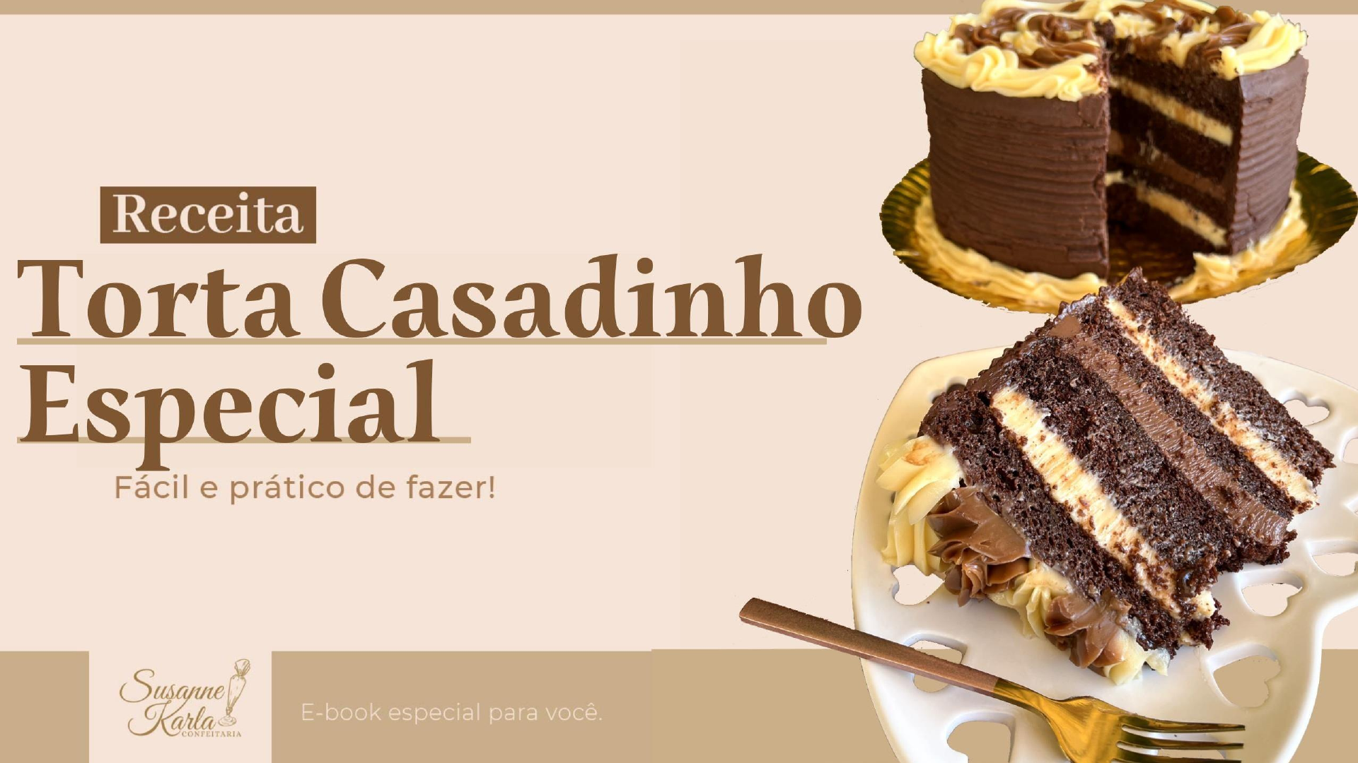 <p>Susanne</p><p>Karla</p><p>Olá!</p><p>Sou Susanne Karla, chef confeiteira da “Susanne Karla</p><p>Confeitaria”, comecei na confeitaria há 20 anos, sem nenhum</p><p>recurso financeiro e com pouco conhecimento, mas em</p><p>compensação tinha muita determinação, criatividade e muito</p><p>amor pela confeitaria.</p><p>Ao longo do tempo, fui me aperfeiçoando e me apaixonando</p><p>cada vez mais pela confeitaria. Entre erros e acertos, sempre</p><p>procurei focar em criar minhas próprias receitas, combinando</p><p>os melhores recheios, aprimorando minhas massas, enfim,</p><p>muitos testes para obter receitas exclusivas e com alto padrão</p><p>de qualidade.</p><p>Massa</p><p>4 ovos (240g);</p><p>150g de óleo;</p><p>350g de açúcar;</p><p>240g de água filtrada;</p><p>10ml (1 colher de sopa) de extrato de baunilha;</p><p>60g de cacau em pó 100%;</p><p>240g de farinha de trigo peneirada;</p><p>10g de fermento químico peneirado;</p><p>4g de bicarbonato de sódio peneirado.</p><p>PREPARO</p><p>Pré-aqueça o forno a 180°C por 10 min.</p><p>Bata muito bem os ovos com o óleo no liquidificador, em</p><p>seguida acrescente o açúcar, o cacau, a água, o extrato de</p><p>baunilha e bata tudo até homogeneizar.</p><p>Desligue o liquidificador e transfira a mistura para um bowl,</p><p>acrescente a farinha de trigo, o fermento e o bicarbonato e</p><p>misture delicadamente com um fuê.</p><p>Despeje a massa em uma forma de 22cm de diâmetro forrada</p><p>com papel toalha apenas no fundo da forma.</p><p>Leve ao forno pré-aquecido por aproximadamente 35min, ou</p><p>até que, enfiando um palito na massa, ele saia limpo.</p><p>Espere a massa amornar, cubra com um plástico filme e leve</p><p>ao refrigerador por 8hr antes de utilizar.</p><p>Recheio 1 e cobertura</p><p>Recheio de Brigadeiro Branco Cremoso</p><p>3 lata de leite condensado (1185g);</p><p>3 caixa de creme de leite (600g);</p><p>100gde leite em pó;</p><p>60gde manteiga sem sal;</p><p>25g de farinha de trigo (sem fermento);</p><p>350g de chocolate nobre branco.</p><p>PREPARO</p><p>Bata no liquidificador o creme de leite, a farinha de trigo e o leite em</p><p>pó, até ficar tudo homogeneizado.</p><p>Coloque essa mistura em uma panela, acrescentando os demais</p><p>ingredientes: leite condensado, manteiga e chocolate branco. Leve ao</p><p>fogo médio mexendo sempre até cozinhar e engrossar.</p><p>Desligue o fogo, transfira para um bowl, cubra com um plástico filme</p><p>e espere esfriar completamente para utilizar no recheio e na</p><p>decoração da torta.</p><p>Separa 600g para a decoração, aproximadamente.</p><p>Recheio 2 cobertura</p><p>Brigadeiro Cremoso de Chocolate</p><p>3 latas de leite condensado (395g cada);</p><p>3 caixas de creme de leite (200g cada);</p><p>60g de manteiga sem sal;</p><p>40g de chocolate em pó 50% (Utilizo Melken Harald);</p><p>250g de chocolate meio amargo.</p><p>PREPARO</p><p>Bata no liquidificador o creme de leite com o chocolate em pó até</p><p>homogeneizar.</p><p>Transfira essa mistura para uma panela e acrescente os demais</p><p>ingredientes: leite condensado, manteiga e chocolate meio amargo.</p><p>Misture bem e leve ao fogo médio sempre mexendo até cozinhar e</p><p>engrossar.</p><p>Desligue o fogo e transfira esse recheio para um bowl, cubra com um</p><p>plástico filme e espere esfriar completamente para utilizar no recheio</p><p>e na decoração da torta.</p><p>Separa uma parte para cobertura e decoração, aproximadamente</p><p>600g.</p><p>Cobertura e decoração</p><p>600g do brigadeiro branco cremoso; 600g</p><p>do brigadeiro cremoso de chocolate;</p><p>Considerações: a decoração lateral da torta pode ser</p><p>feita com uma espátula decorativa de sua</p><p>preferência e raspas de chocolate na base da torta.</p><p>Calda</p><p>Calda para umedecer a massa</p><p>300ml de água filtrada;</p><p>15g de chocolate em pó 50%;</p><p>6g de pasta saborizante de baunilha (ou 10ml de</p><p>extrato de baunilha);</p><p>80g de leite condensado.</p><p>PREPARO</p><p>Misture todos os ingredientes em um recipiente (se preferir, pode</p><p>bater todos os ingredientes no liquidificador).</p><p>Pronto para utilizar.</p><p>1</p><p>Pode ser mon tada no acetato ou em</p><p>forma de alumínio (22cm de diâmetro</p><p>por 10cm de altura).</p><p>Divida a massa em 4 discos;</p><p>Serão 2 camadas de recheios branco, 1</p><p>camadas de recheio cremoso de</p><p>chocolate e 4 discos de massa.</p><p>Os discos de massa serão umedecidos</p><p>com a calda.</p><p>Montagem</p><p>2</p><p>Intercale nessa ordem:</p><p>1- Massa;</p><p>2- Recheio Brigadeiro Branco;</p><p>3- Massa;</p><p>4-Recheio</p><p>Chocolate;</p><p>Cremoso de</p><p>5- Massa;</p><p>6- Recheio Brigadeiro Branco;</p><p>7-Massa.</p><p>3</p><p>Prense a torta no acetato ou forma de</p><p>alumínio, cubra com plástico filme e leve</p><p>para o refrigerador por 8h ou de 1 dia</p><p>para o outro. Passado o tempo de</p><p>refrigeração, retire a torta do acetato ou</p><p>forma de alumínio, aplique a cobertura</p><p>de Brigadeiro de Chocolate Cremoso na</p><p>lateral da torta.</p><p>Decore a parte superior da torta com</p><p>as coberturas, cada uma em um saco</p><p>de confe itar com o bico 1M (ou outro</p><p>bico de confeitar de sua preferência)</p><p>Finalize decorando a lateral da torta</p><p>com uma espátula decorativa de sua</p><p>preferência e aplique raspas de</p><p>chocolate meio amargo em toda a</p><p>base da torta.</p><p>Leve ao refrigerador por 2 horas.</p><p>A torta tem validade de 7 dias sob</p><p>refrigeração.</p><p>Está pronta!</p><p>Está pronta!</p><p>Pode-se congelar a torta quando estiver</p><p>recheada, prensada no acetato e coberta</p><p>com plástico filme por um período de até</p><p>30 dias.</p><p>Para descongelar e decorar a torta, retire</p><p>do congelador e leve ao refrigerador até</p><p>o total descongelamento. Após isso,</p><p>finalize com a cobertura e a decoração</p><p>da torta.</p><p>Considerações</p><p>Dic
