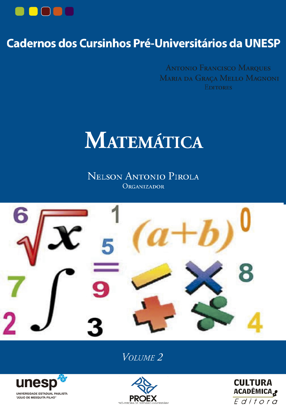 <p>CADERNOS DOS CURSINHOS PRÉ-</p><p>UNIVERSITÁRIOS DA UNESP</p><p>ANTONIO FRANCISCO MARQUES</p><p>MARIA DA GRAÇA MELLO MAGNONI</p><p>E</p><p>S P</p><p>2016</p><p>MATEMÁTICA</p><p>NELSON ANTONIO PIROLA</p><p>O</p><p>VOLUME 2</p><p>Realização</p><p>Pró-Reitoria de Extensão – PROEX</p><p>Rua Quirino de Andrade, 215 – 10° andar</p><p>São Paulo, CEP 01049-010 – SP</p><p>Tel (11) 5627-0264</p><p>Reitor</p><p>Julio Cezar Durigan</p><p>Vice-reitor</p><p>Eduardo Kokubun</p><p>Pró-reitora de Extensão Universitária</p><p>Mariângela Spotti Lopes Fujita</p><p>Pró-reitora de Pesquisa</p><p>Maria José Soares Mendes Giannini</p><p>Pró-reitor de Graduação</p><p>Laurence Duarte Colvara</p><p>Pró-reitora de Pós-Graduação</p><p>Lourdes Aparecida Martins dos Santos-Pinto</p><p>Pró-reitor de Administração</p><p>Carlos Antonio Gamero</p><p>Secretária Geral</p><p>Maria Dalva Silva Pagotto</p><p>Produção planejada pelo Projeto "Inovação nos pro-</p><p>cessos de gestão e pedagógico dos Cursos Pré-Vesti-</p><p>bulares da Unesp"</p><p>Diagramação e capa</p><p>Edevaldo Donizeti dos Santos</p><p>Impressão e acabamento: Gráca FCL/Araraquara</p><p>Revisão</p><p>Élide Feres</p><p>Maria Luzinete Euclides</p><p>Rony Farto Pereira</p><p>Conselho Editorial da PROEX - Unesp</p><p>Profa. Dra. Maria Candida Soares Del Masso (FFC / Marília)</p><p>Prof. Dr. Claudio César de Paiva (FCL / Araraquara)</p><p>Profa. Dra. Márcia Pereira da Silva (FCHS / Franca)</p><p>Profa. Dra. Rosane Michelli de Castro (FFC / Marília)</p><p>Sra. Angela de Jesus Amaral (PROEX / Reitoria)</p><p>Sr. Oscar Kazuyuki Kogiso (ICT / São José dos Campos)</p><p>Coordenação geral</p><p>Profa. Dra. Mariângela Spotti Lopes Fujita</p><p>Editores</p><p>Prof. Dr. Antonio Francisco Marques</p><p>Profa. Dra. Maria da Graça Mello Magnoni</p><p>Organizador</p><p>Nelson Antonio Pirola</p><p>Colaboradores</p><p>Emília de Mendonça Rosa Marques</p><p>Evandro Tortora</p><p>Fernanda Pizzigatti Marques Jasinevicius</p><p>Gabriela Pereira Sander</p><p>Gilmara Aparecida da Silva</p><p>José Luciano Santinho Lima</p><p>Juliana Aparecida da Silva dos Santos Morais</p><p>Márcio Rogério Ferreira</p><p>Patrícia Priscilla Ferraz da Costa Souza</p><p>Richael Silva Caetano</p><p>ais Regina Ueno Yamada</p><p>Marcio Rogerio Ferreira</p><p>Patricia Priscilla Ferraz da Costa Souza</p><p>Revisor de conteúdo</p><p>Profa Dra Mara Sueli Simao Moraes</p><p>M425 Matemática / Nelson Antonio Pirola, organizador. – [2. ed.] – São Paulo</p><p>: Cultura Acadêmica, 2016.</p><p>296 p. : il. - (Cadernos dos cursinhos pré-universitários da Unesp ; 2)</p><p>Inclu bblograia</p><p>ISBN 978-85-7983-821-7</p><p>1. Matemática (Ensino médio) – Estudo e ensino. 2. Séries</p><p>aritméticas. 3. Estatística. 4. Geometria. 5. Trigonometria. 6.</p><p>Universidades e faculdades - Vestibular. I. Pirola, Nelson Antonio. II.</p><p>Série.</p><p>CDD 510.7</p><p>3</p><p>Pró-Reitoria de Extensão – PROEX</p><p>PREFÁCIO</p><p>A ideia de construção dos conteúdos disciplinares dos 6 cadernos que com-</p><p>põem a 2° Edição do conjunto do material didático a ser utilizado pelos Cursinhos</p><p>Pré-Universitários1 surgiu desde o início da gestão, em 2013, durante proveitosas dis-</p><p>cussões em reuniões com os professores e estudantes na condição, respectivamente, de</p><p>coordenadores e tutores. Havia, naquela ocasião, uma grande preocupação com relação</p><p>à disponibilidade do material didático de um ano vigente para um próximo ano, con-</p><p>siderando-se a provisão orçamentária. Além disso, havia um desejo dos envolvidos por</p><p>conteúdos que mais se aproximassem do contexto social e educacional dos cursistas</p><p>provenientes da escola pública e de famílias de baixa renda, para promover, de modo</p><p>mais abrangente, a inclusão em um contexto de aquisição e de construção de conhe-</p><p>cimentos necessários ao ingresso em cursos de graduação ou no mercado de trabalho,</p><p>mediante participação em concursos.</p><p>O grande desao da existência dos Cursinhos Pré-Universitários da UNESP</p><p>sempre foi a oferta do material didático com os conteúdos disciplinares necessários,</p><p>de um lado, para facilitar o processo comunicativo entre professor e cursista na sala</p><p>de aula e, de outro, para orientar a aprendizagem do cursista fora da sala de aula.</p><p>Portanto, o material didático é o instrumento que orienta o processo de aquisição e</p><p>construção do conhecimento dos cursistas dos Cursinhos Pré-Universitários, em um</p><p>curto período de tempo, com nalidade denida de ingresso em concursos e, ainda,</p><p>a m de propiciar sua inclusão. Nesse sentido, discutiu-se a viabilidade de a UNESP</p><p>construir material didático próprio, dadas as características únicas de distribuição</p><p>regional multicampus e da evolução histórica de seus Cursinhos Pré-Universitários,</p><p>atualmente Subprograma de extensão “Cursinhos Pré-Universitários da UNESP”, do</p><p>programa de extensão “Divulgação, Orientação e Informação Prossional”.</p><p>Antes de sua concretização, essa discussão levou em consideração resultados</p><p>de outras iniciativas da Pró-Reitoria de Extensão - PROEX - na tentativa de realizar</p><p>1 Atualmente, existem 27 Cursinhos Pré-Universitários UNESP e 4 Cursinhos em convênios com Prefeituras,</p><p>em funcionamento, localizados em 23 cidades do interior paulista, junto a Unidades Universitárias da UNESP. O</p><p>modelo implantado atende a alunos regulares e egressos da rede pública de ensino e oferece aulas ministradas por</p><p>graduandos dos diversos cursos da UNESP – bolsistas e voluntários –, que visam a suprir lacunas de formação de</p><p>alunos regulares do 3º ano e egressos do ensino médio, com vistas a oferecer reforço de ensino e preparo para o</p><p>ingresso e permanência na universidade. Para isso, 