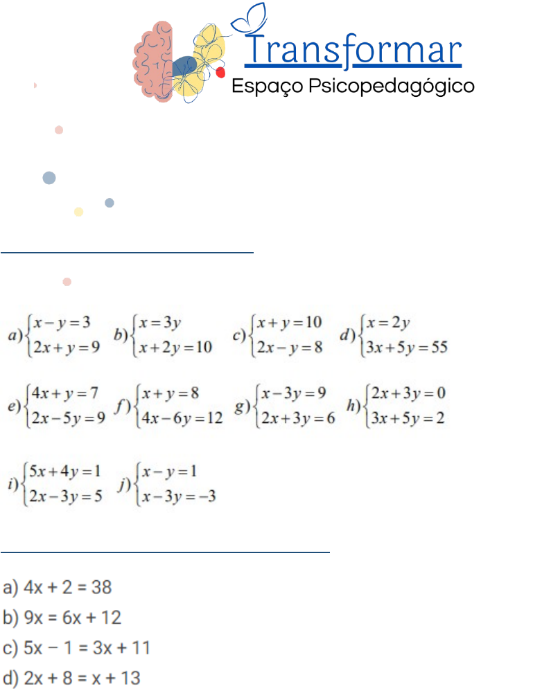 <p>NOME: ________________________________________ DATA: ___/____/____</p><p>Resolva os sistemas de equação:</p><p>Resolva as seguintes equações do 1º grau:</p><p>image1.png</p><p>image2.png</p><p>image3.png</p>