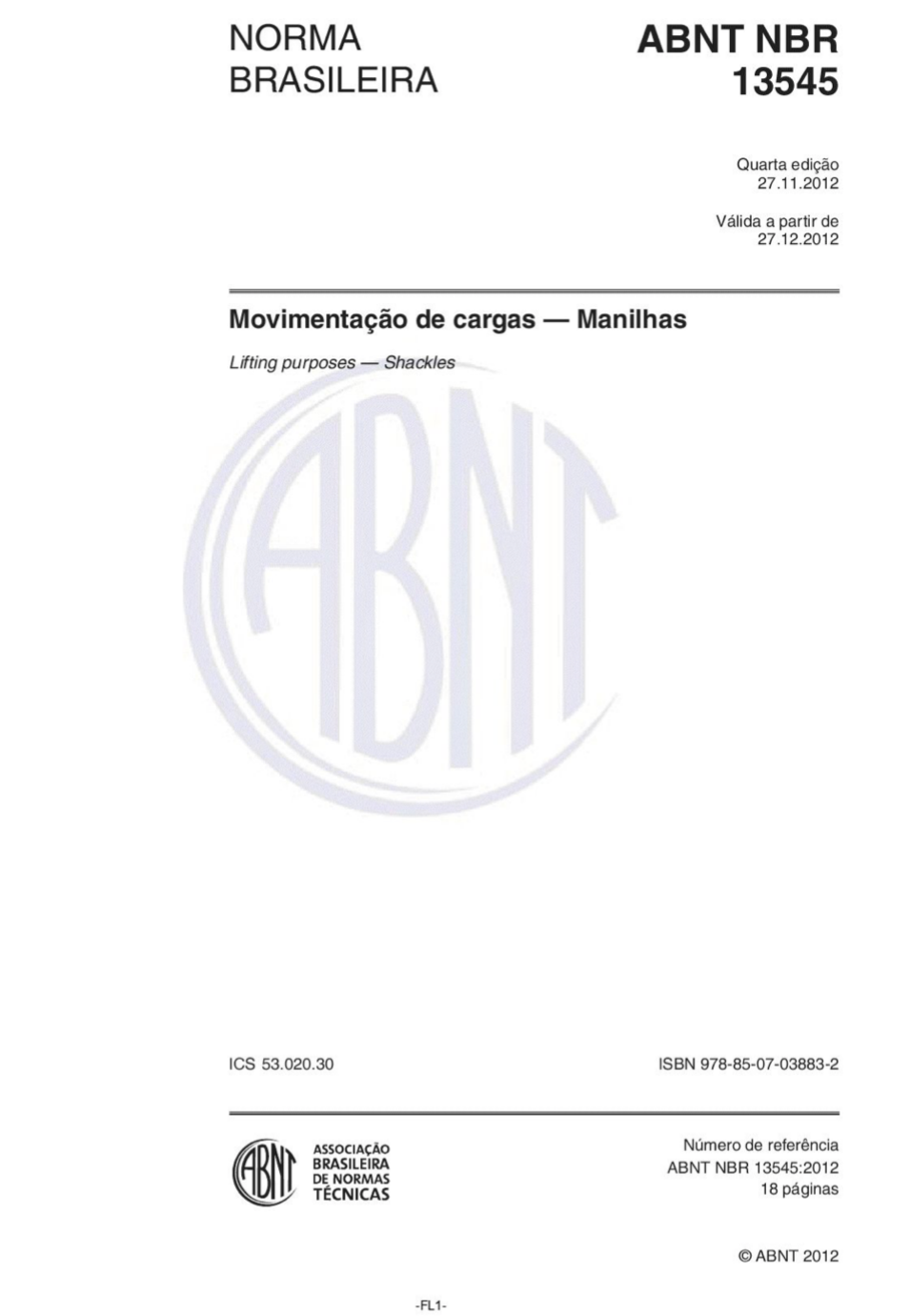 <p>NORMA ABNT NBR BRASILEIRA 13545 Quarta edição 27.11.2012 Válida a partir de 27.12.2012 Movimentação de cargas - Manilhas Lifting purposes - Shackles ICS 53.020.30 ISBN 978-85-07-03883-2 ASSOCIAÇÃO Número de referência ABNT BRASILEIRA ABNT NBR 13545:2012 DE NORMAS TÉCNICAS 18 páginas ABNT 2012 -FL1-</p><p>ABNT NBR 13545:2012 ABNT 2012 Todos os direitos reservados. A menos que especificado de outro modo, nenhuma parte desta publicação pode ser reproduzida ou utilizada por qualquer meio, eletrônico ou mecânico, incluindo fotocópia e microfilme, sem permissão por escrito da ABNT. ABNT Av.Treze de Maio, 13 - andar 20031-901 - Rio de Janeiro - RJ Tel.: + 55 21 3974-2300 Fax: + 55 21 3974-2346 abnt@abnt.org.br www.abnt.org.br ii ABNT 2012 - Todos os direitos reservados -FL2-</p><p>ABNT NBR 13545:2012 Sumário Página Prefácio V 1 Escopo 1 2 Referências normativas 1 3 Termos e definições 1 4 Formato e dimensões 2 4.1 Manilhas retas 2 4.2 Manilhas curvas 5 4.3 Diâmetro do furo 7 4.4 Tipos de pinos das manilhas 7 5 Propriedades mecânicas 8 5.1 Geral 8 5.2 Ensaio de resistência à deformação 10 5.3 Resistência à ruptura 10 5.4 Resistência à fadiga - Graus 6, 8, R4 e 10 10 6 Materiais 11 6.1 Geral 11 6.2 Requisitos específicos - Graus 6, 8, 8S, R4 e 10 11 6.2.1 Generalidades 11 6.2.2 Ensaio de impacto (Charpy) 12 7 Tratamento térmico 13 7.1 Grau 4 13 7.2 Graus 6, 8, 8S, R4 e 10 13 8 Dureza 13 8.1 Requisitos quanto à dureza 13 8.2 Ensaios de dureza 13 9 Fabricação 14 10 Roscas 14 11 Ensaios de tipo 14 11.1 Geral 14 11.2 Ensaio de deformação 15 11.3 Ensaio de resistência estática 15 11.4 Ensaios de fadiga (graus 6, 8, R4 e 10): CMT< 120 t 16 11.5 Critérios de aceitação para ensaios de tipo 16 11.5.1 Ensaio de deformação 16 11.5.2 Ensaio de resistência estática e ensaio de fadiga 16 12 Ensaio de carga de prova 16 13 Certificado do fabricante 17 14 Marcação 17 14.1 Corpo da manilha 17 14.2 Pinos de manilhas - Graus 6, 8, 8S, R4 e 10 18 15 Designação 18 ABNT 2012 - Todos os direitos reservados iii -FL3-</p><p>ABNT NBR 13545:2012 Figuras Figura 1 - Dimensões das manilhas retas 3 Figura 2 - Dimensões das manilhas curvas 5 Figura 3 - Exemplos típicos de pinos de manilhas 8 Figura 4 - Retirada dos corpos de prova de manilhas 12 Figura 5 - Marcas de punção no olhal e no arco da manilha 15 Tabelas Tabela 1 - Manilha reta 4 Tabela 2 - Manilha curva 6 Tabela 3 - Propriedades mecânicas 9 Tabela 4 - Propriedades de material 11 Tabela 5 - Elementos de liga 12 Tabela 6 - Valores de dureza 13 iv ABNT 2012 - Todos os direitos reservados</p><p>ABNT NBR 13545:2012 Prefácio A Associação Brasileira de Normas Técnicas (ABNT) é Foro Nacional de Normalização. As Normas Brasileiras, cujo conteúdo é de responsabilidade dos Comitês Brasileiros (ABNT/CB), dos Organismos de Normalização Setorial (ABNT/ONS) e das Comissões de Estudo Especiais (ABNT/CEE), são elaboradas por Comissões de Estudo (CE), formadas por representantes dos setores envolvidos, delas fazendo parte: produtores, consumidores e neutros (universidades, laboratórios e outros). Os Documentos Técnicos ABNT são elaborados conforme as regras da Diretiva ABNT, Parte 2. A Associação Brasileira de Normas Técnicas (ABNT) chama atenção para a possibilidade de que alguns dos elementos deste documento podem ser objeto de direito de A ABNT não deve ser considerada responsável pela identificação de quaisquer direitos de patentes. A ABNT NBR 13545 foi elaborada no Comitê Brasileiro de Materiais, Equipamentos e Estruturas Offshore para Indústria do Petróleo e Gás Natural (ABNT/CB-50), pela Comissão de Estudo de Correntes, Lingas de Correntes e Acessórios (CE-50:002.03). Projeto circulou em Consulta Nacional conforme Edital 10, de 05.10.2011 a 05.12.2011, com o número de Projeto ABNT NBR 13545. Esta Norma é baseada nas ISO 2415:2004 e EN 13889:2003. Esta quarta edição incorpora a Emenda 1 de 27.11.2012 e cancela e substitui a edição anterior (ABNT NBR 13545:2012), com as seguintes modificações: Prefácio, em 4.2, 3° travessão, foi alterado o seguinte: Figura 2 Dimensões das manilhas curvas: "foi incluída a indicação da área para ensaio de dureza e medição do diâmetro do corpo na manilha reta." para "foi incluída a indicação da área para ensaio de dureza e medição do diâmetro do corpo na manilha curva."; Em foi modificado o seguinte: Alínea a), foi incluído o intervalo de 33 mm até 46 mm (d + 3 mm) e o dimensional acima de 46 mm Tabela 1 Foi refeito o cálculo do diâmetro externo do olhal (máx.), que é 2,2 D. Foram alterados os valores correspondentes aos diâmetros dos pinos (D): 7,5, 9,5, 23,5, 27, 38, 42, 59 e 74; Tabela 2 Foi refeito o cálculo do diâmetro externo do olhal (máx.), que é 2,2 D. Foram alterados os valores correspondentes aos diâmetros dos pinos (D): 7,5, 9,5, 23,5, 27, 38, 42, 59, 74, 114, 118 e 131. Foi inserida a NOTA 2. Tabela 2 Foi refeito cálculo do diâmetro interno do arco (2r), que é 2,5 d. Foi inserida a NOTA 2. Escopo desta Norma Brasileira em inglês é o seguinte: Scope This Standard specifies the general characteristics, performance and critical dimensions necessary for interchangeability and compatibility with other components, of forged dee and bow shackles in a range of sizes having working load limits from 0,32 to 320 t, and in grades 4, 6, 8, 8S, R4 and 10. ABNT 2012 Todos os direitos reservados V -FL5-</p><p>NORMA BRASILEIRA ABNT NBR 13545:2012 Movimentação de cargas - Manilhas 1 Escopo Esta Norma especifica as características gerais, desempenho e as dimensões críticas necessárias para a intercambiabilidade e compatibilidade com outros componentes de manilhas retas e curvas em uma faixa de tamanhos com limites de cargas de trabalho de 0,32 ta 320 t, nos graus 4, 6, 8, 8S, R4 e 10. 2 Referências normativas Os documentos relacionados a seguir são indispensáveis à aplicação deste documento. Para refe- rênc