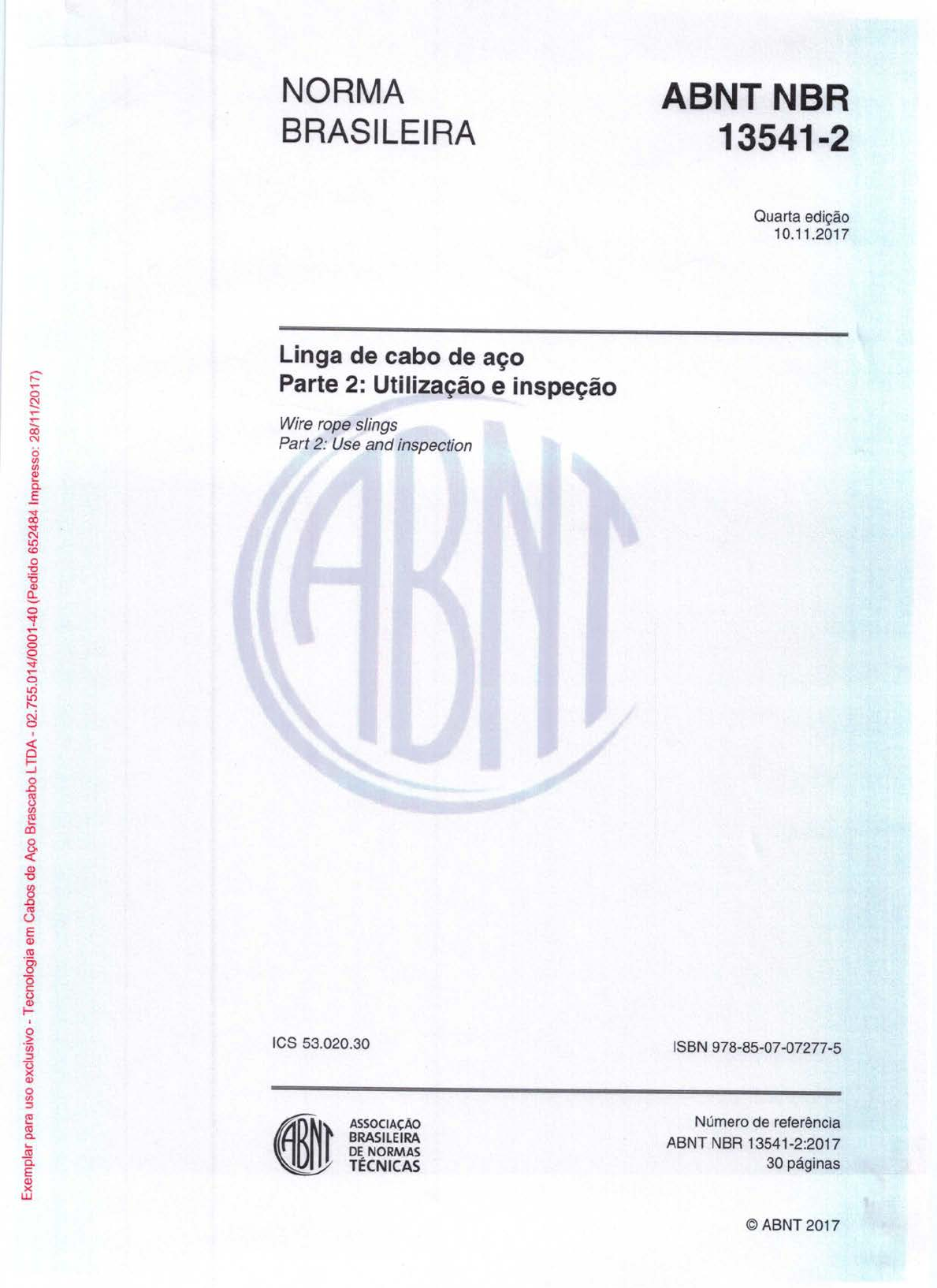 <p>NORMA ABNT NBR BRASILEIRA 13541-2 Quarta edição 10.11.2017 Linga de cabo de aço Parte 2: Utilização e inspeção Wire rope slings Part 2: Use and inspection de ICS ISBN 978-85-07-07277-5 para ASSOCIAÇÃO Número de referência BRASILEIRA ABNT NBR 13541-2:2017 DE NORMAS TÉCNICAS 30 páginas ABNT 2017</p><p>ABNT NBR 13541-2:2017 de ABNT 2017 Todos os direitos reservados. A menos que especificado de outro modo, nenhuma parte desta publicação pode ser escrito da ABNT. reproduzida ou utilizada por qualquer eletrônico ou mecânico, incluindo fotocópia e microfilme, sem permissão por ABNT Av.Treze de Maio, 13 - andar 20031-901 - Rio de Janeiro - RJ Tel.: + 55 21 3974-2300 Fax: + 55 21 3974-2346 abnt@abnt.org.br www.abnt.org.br para ii ABNT 2017 - Todos os direitos reservados</p><p>ABNT NBR 13541-2:2017 Sumário Página Prefácio V 1 Escopo 1 2 Referências normativas 1 3 Termos e definições 1 4 Restrições para utilização das terminações de lingas 2 4.1 Olhal trançado flamengo com presilha de aço (tipo 1) 2 4.2 Olhal trançado flamengo com presilha de alumínio (tipo 2) 2 4.3 Olhal trançado manualmente (tipo 3) 2 4.4 Olhal dobrado com presilha de alumínio (tipo 4) 2 5 Métodos de utilização de lingas 2 5.1 Fixação direta 3 5.2 Método forca 4 5.3 Método cesta 5 6 Utilização de lingas de cabo de aço 5 6.1 Antes do icamento da carga 6 6.2 Durante a fixação da linga 8 6.2.1 Método forca 9 6.2.2 Método cesta 10 6.3 Durante a movimentação da carga 11 6.4 Descarregamento da carga 12 6.5 Precauções 12 6.6 Estabilidade e simetria de carregamento 13 6.6.1 Generalidades 13 6.6.2 Efeitos resultantes da carga fora de equilíbrio 13 6.6.3 Içamento com centro de gravidade abaixo do ponto de fixação 14 6.6.4 Efeito de centro de gravidade alto 15 6.6.5 Carregamento assimétrico 15 6.7 Lingas com várias pernas com algumas pernas sem carregamento 16 de 6.8 Armazenamento da linga 17 7 Inspeção 17 7.1 Generalidades 17 7.2 Inspeção visual pelo sinaleiro/amarrador de carga 17 7.3 Inspeção completa 18 7.4 Critério de inspeção e descarte 19 7.4.1 Marcação 19 7.4.2 Arames rompidos 19 7.4.3 Redução no diâmetro do cabo 20 7.4.4 Corrosão 20 7.4.5 Deformação do cabo 20 para 7.4.6 Danos por calor 20 7.4.7 Acessórios, presilhas ou trançados 20 Bibliografia 30 ABNT 2017 - Todos os direitos reservados iii</p><p>ABNT NBR 13541-2:2017 Anexos Anexo A (informativo) Periodicidade e abrangência da inspeção 23 Anexo B (informativo) Determinação da massa da carga 24 Anexo C (informativo) Exemplo de formulário de inspeção 28 C.1 Formulário para inspeção por lote de linga 28 C.2 Formulário para inspeção individual da linga 29 Figuras Figura 1 - Exemplos de método forca 4 Figura 2 - Forca dupla 5 Figura 3 - Exemplos de método cesta 5 Figura 4 - Utilização de vara de manobra ou cabo-guia 6 Figura 5 - Lingas com várias pernas - Distribuição de carregamento 7 Figura 6 Variação de carregamento da linga em função do ângulo de perna para uma carga 7 Figura 7 - Dobramento do cabo de aço 8 Figura 8 - Laço sem fim tipo Grommet 9 Figura 9 - Exemplo de ângulo no método forca 9 Figura 10 - Utilização de sapatilho no método forca 10 Figura 11 - Exemplo de balancim 10 Figura 12 - Transporte com lingas de múltiplas pernas com pernas não utilizadas 11 Figura 13 - Dobramento severo nas presilhas e sapatilhos 12 Figura 14 - Alinhamento do centro de gravidade 13 Figura 15 - Exemplo do efeito do desalinhamento do centro de gravidade 14 Figura 16 Exemplo de carga estável 14 Figura 17 - Exemplo de centro de gravidade alto em relação aos pontos de fixação 15 Figura 18 - Carregamento assimétrico 16 Figura 19 - Gancho 21 de Tabelas Tabela 1 - Método de utilização das lingas 3 Tabela 2 - Fatores de redução de carga máxima de trabalho (CMT) 17 Tabela 3 - Critérios para substituição da linga em função de rupturas localizadas de arames .19 Tabela A.1 - Periodicidade do exame e dos ensaios do conjunto de lingas 23 Tabela B.1 - Volumes de corpos fundamentais 24 Tabela B.2 - Densidades dos materiais mais comumente usados 27 iv ABNT 2017 Todos os direitos reservados</p><p>ABNT NBR 13541-2:2017 Prefácio A Associação Brasileira de Normas Técnicas (ABNT) é o Foro Nacional de As Normas Brasileiras, cujo conteúdo é de responsabilidade dos Comitês Brasileiros (ABNT/CB), dos Organismos de Normalização Setorial (ABNT/ONS) e das Comissões de Estudo Especiais (ABNT/CEE), são elaboradas por Comissões de Estudo (CE), formadas pelas partes interessadas no tema objeto da normalização. Os Documentos Técnicos ABNT são elaborados conforme as regras da ABNT Diretiva 2. A ABNT chama a atenção para que, apesar de ter sido solicitada manifestação sobre eventuais direitos de patentes durante a Consulta estes podem ocorrer e devem ser comunicados à ABNT a qualquer momento (Lei n° 9.279, de 14 de maio de 1996). Ressalta-se que Normas Brasileiras podem ser objeto de citação em Regulamentos Técnicos. Nestes casos, os Órgãos responsáveis pelos Regulamentos Técnicos podem determinar outras datas para exigência dos requisitos desta Norma, independentemente de sua data de entrada em vigor. A ABNT NBR 13541-2 foi elaborada pela Comissão de Estudo Especial de Cabos de Aço e Acessórios (ABNT/CEE-113). Projeto circulou em Consulta Nacional conforme Edital n° 05, de 10.05.2012 a 09.07.2012, com o número de Projeto 113:000.00-002/2 seu projeto de Emenda 1 de 2015 circulou em Consulta Nacional conforme Edital n° 01, de 30.01.2015 a 30.03.2015. seu projeto de Emenda 1 de 2017 circulou em Consulta Nacional conforme Edital n° 07, de 28.07.2017 a Esta Norma é baseada nas ISO EN 13414-2:2003 e EN 13414-2:2003/Emenda Esta quarta edição da ABNT NBR 13541-2 equivale ao conjunto ABNT NBR 13541-2:2015 e Emenda 1, de 10.11.2017, que cancela e substitui a edição anterior ABNT NBR Escopo em inglês desta Norma Brasileira é o seguinte: Scope This Standard provid