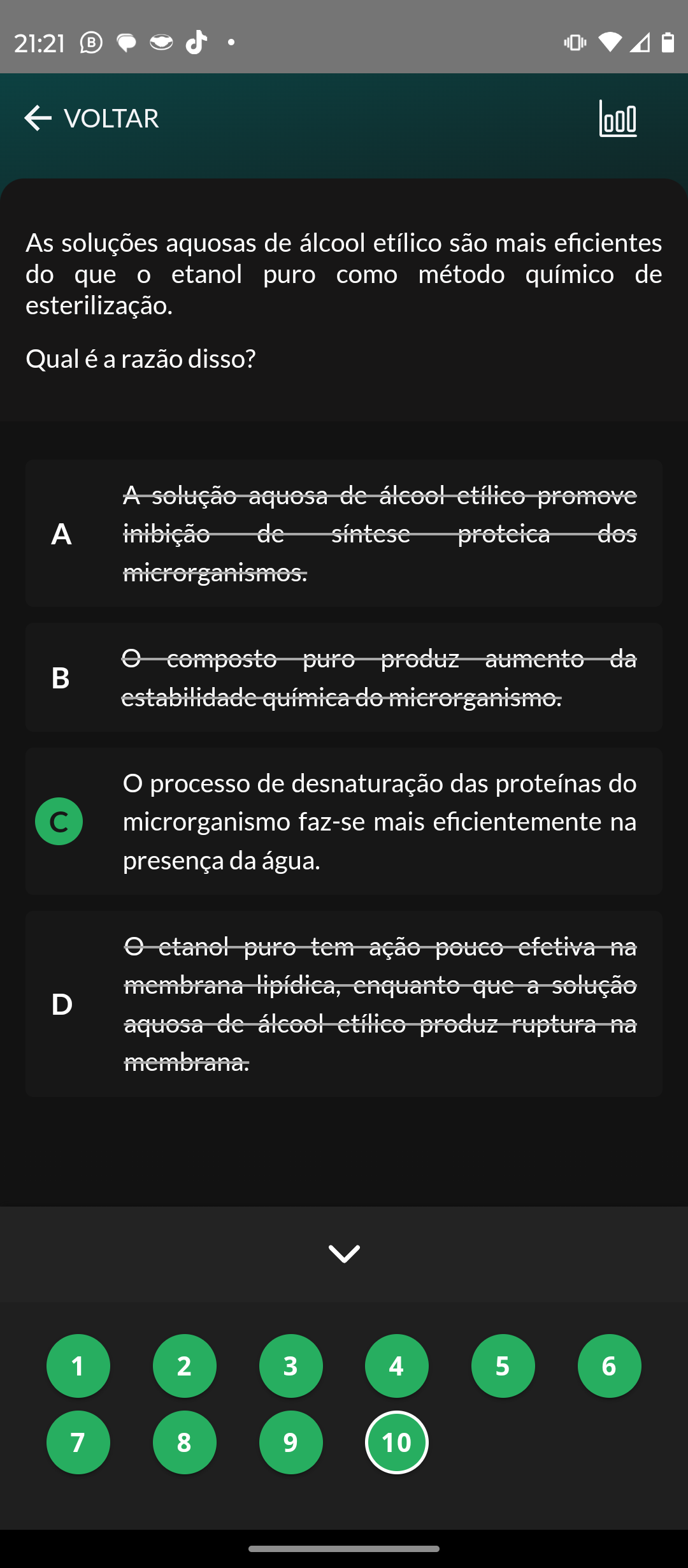 <p>21:21 B VOLTAR As soluções aquosas de álcool etílico são mais eficientes do que etanol puro como método químico de esterilização. Qual é a razão disso? A solução aquesa de promove A de proteica des microrganismos. composto produz aumento da B estabilidade química microrganismo. O processo de desnaturação das proteínas do C microrganismo faz-se mais eficientemente na presença da água. etanol pure tem ação pouce efetiva na membrana lipídica, enquante que a solução D aquesa de produz ruptura na membrana. 1 2 3 4 5 6 7 8 9 10</p>