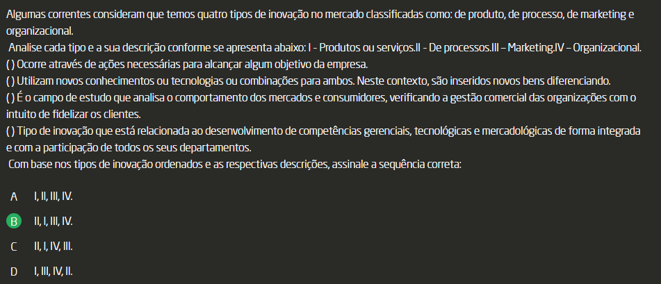<p>Algumas correntes consideram que temos quatro tipos de inovação no mercado classificadas como: de produto, de processo, de marketing e organizacional. Analise cada tipo e a sua descrição conforme se apresenta abaixo: I - Produtos ou - De processos.III Marketing.IV - Organizacional. () Ocorre através de ações necessárias para alcançar algum objetivo da empresa. () Utilizam novos conhecimentos tecnologias combinações para ambos. Neste contexto, são inseridos novos bens diferenciando. () É campo de estudo que analisa comportamento dos mercados e consumidores, verificando a gestão comercial das organizações com intuito de fidelizar os clientes. () Tipo de inovação que está relacionada ao desenvolvimento de competências gerenciais, tecnológicas e mercadológicas de forma integrada e com a participação de todos os seus departamentos. Com base nos tipos de inovação ordenados e as respectivas descrições, assinale a correta: A I, II, III, IV. B II, I, III, IV. II, I, IV, III. D I, III, IV, II.</p>