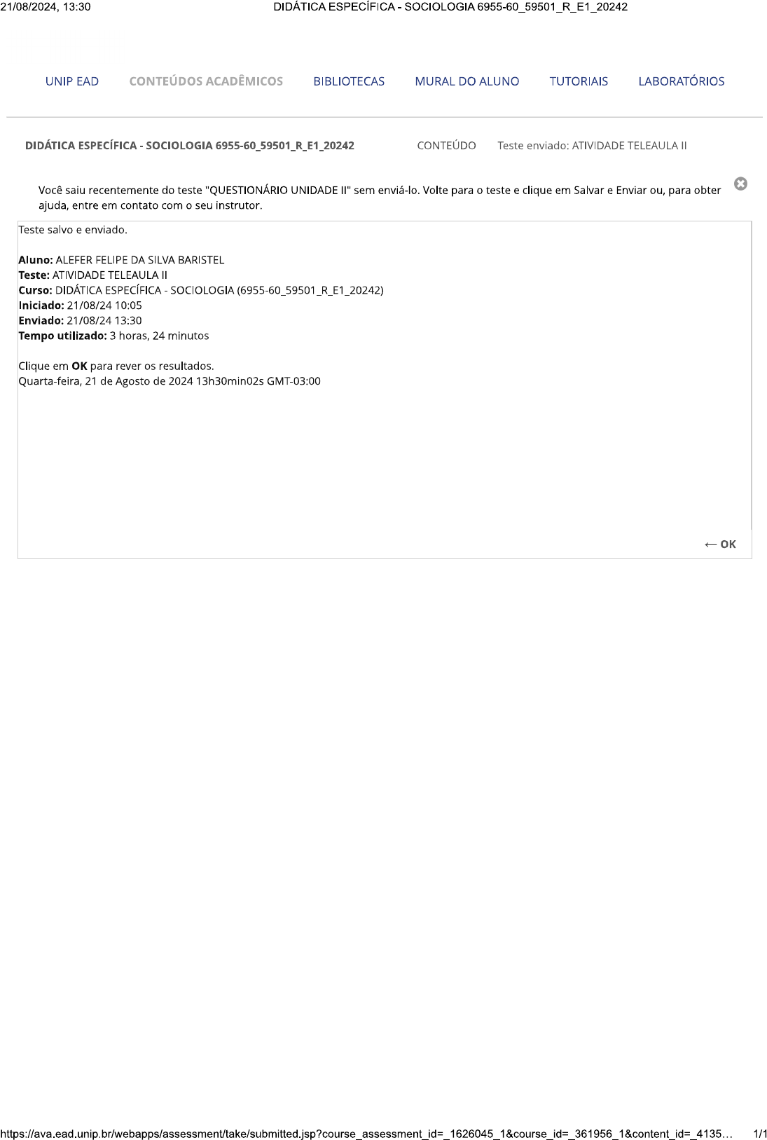 <p>21/08/2024, 13:30 DIDÁTICA ESPECÍFICA - SOCIOLOGIA 6955-60_59501_R_E1_20242 UNIP EAD CONTEÚDOS ACADÊMICOS BIBLIOTECAS MURAL DO ALUNO TUTORIAIS LABORATÓRIOS DIDÁTICA ESPECÍFICA - SOCIOLOGIA 6955-60_59501_R_E1_20242 CONTEÚDO Teste enviado: ATIVIDADE TELEAULA x Você saju recentemente do teste "QUESTIONÁRIO UNIDADE II" sem enviá-lo. Volte para o teste e clique em Salvar e Enviar ou, para obter ajuda, entre em contato com o seu instrutor. Teste salvo e enviado. Aluno: ALEFER FELIPE DA SILVA BARISTEL Teste: ATIVIDADE TELEAULA Curso: DIDÁTICA ESPECÍFICA - SOCIOLOGIA (6955-60_59501_R_E1_20242) Iniciado: 21/08/24 10:05 Enviado: 21/08/24 13:30 Tempo utilizado: 3 horas, 24 minutos Clique em OK para rever os resultados. Quarta-feira, 21 de Agosto de 2024 13h30min02s GMT-03:00 OK 1/1</p>