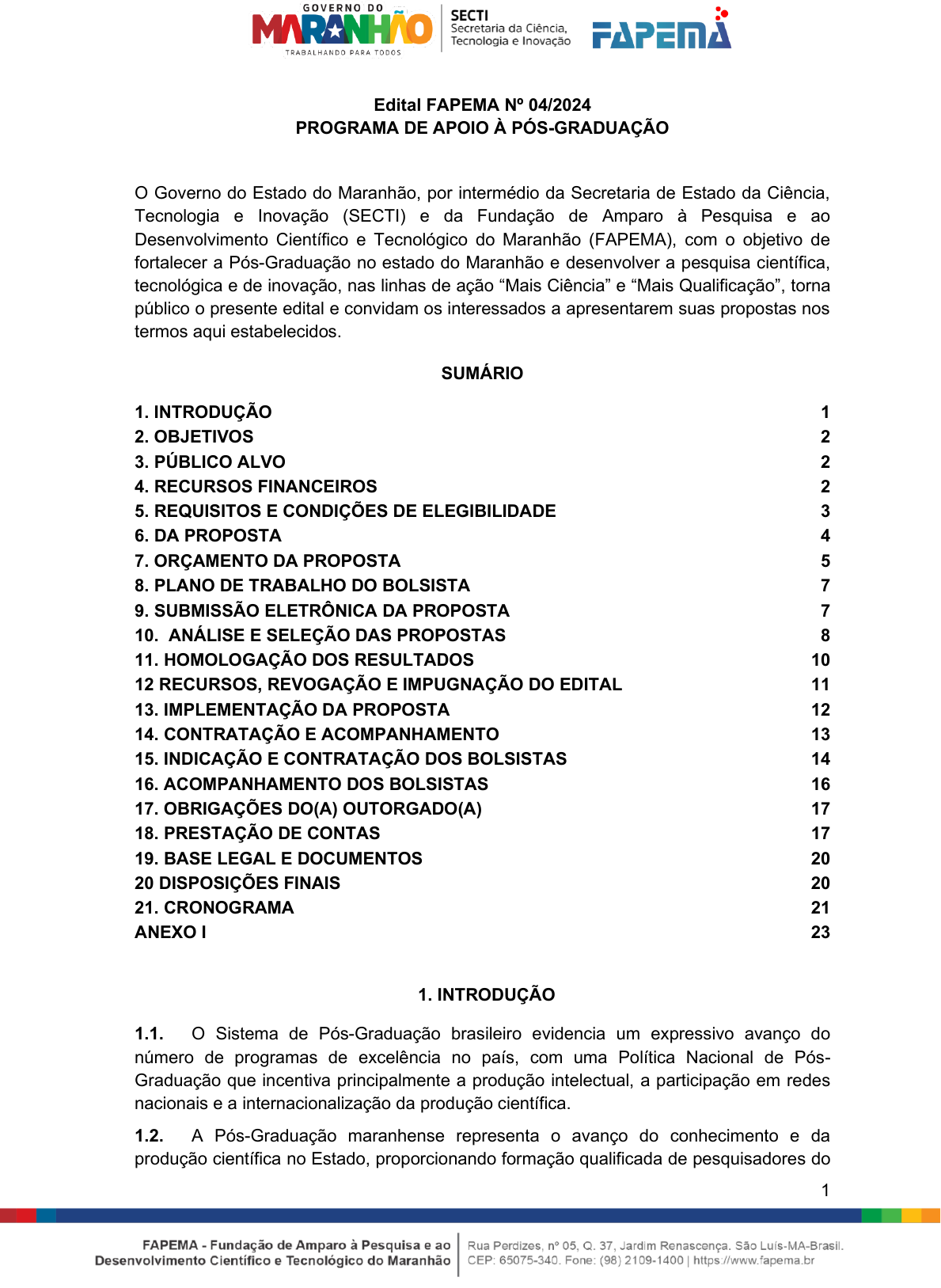 <p>1</p><p>Edital FAPEMA Nº 04/2024</p><p>PROGRAMA DE APOIO À PÓS-GRADUAÇÃO</p><p>O Governo do Estado do Maranhão, por intermédio da Secretaria de Estado da Ciência,</p><p>Tecnologia e Inovação (SECTI) e da Fundação de Amparo à Pesquisa e ao</p><p>Desenvolvimento Científico e Tecnológico do Maranhão (FAPEMA), com o objetivo de</p><p>fortalecer a Pós-Graduação no estado do Maranhão e desenvolver a pesquisa científica,</p><p>tecnológica e de inovação, nas linhas de ação “Mais Ciência” e “Mais Qualificação”, torna</p><p>público o presente edital e convidam os interessados a apresentarem suas propostas nos</p><p>termos aqui estabelecidos.</p><p>SUMÁRIO</p><p>1. INTRODUÇÃO 1</p><p>2. OBJETIVOS 2</p><p>3. PÚBLICO ALVO 2</p><p>4. RECURSOS FINANCEIROS 2</p><p>5. REQUISITOS E CONDIÇÕES DE ELEGIBILIDADE 3</p><p>6. DA PROPOSTA 4</p><p>7. ORÇAMENTO DA PROPOSTA 5</p><p>8. PLANO DE TRABALHO DO BOLSISTA 7</p><p>9. SUBMISSÃO ELETRÔNICA DA PROPOSTA 7</p><p>10. ANÁLISE E SELEÇÃO DAS PROPOSTAS 8</p><p>11. HOMOLOGAÇÃO DOS RESULTADOS 10</p><p>12 RECURSOS, REVOGAÇÃO E IMPUGNAÇÃO DO EDITAL 11</p><p>13. IMPLEMENTAÇÃO DA PROPOSTA 12</p><p>14. CONTRATAÇÃO E ACOMPANHAMENTO 13</p><p>15. INDICAÇÃO E CONTRATAÇÃO DOS BOLSISTAS 14</p><p>16. ACOMPANHAMENTO DOS BOLSISTAS 16</p><p>17. OBRIGAÇÕES DO(A) OUTORGADO(A) 17</p><p>18. PRESTAÇÃO DE CONTAS 17</p><p>19. BASE LEGAL E DOCUMENTOS 20</p><p>20 DISPOSIÇÕES FINAIS 20</p><p>21. CRONOGRAMA 21</p><p>ANEXO I 23</p><p>1. INTRODUÇÃO</p><p>1.1. O Sistema de Pós-Graduação brasileiro evidencia um expressivo avanço do</p><p>número de programas de excelência no país, com uma Política Nacional de Pós-</p><p>Graduação que incentiva principalmente a produção intelectual, a participação em redes</p><p>nacionais e a internacionalização da produção científica.</p><p>1.2. A Pós-Graduação maranhense representa o avanço do conhecimento e da</p><p>produção científica no Estado, proporcionando formação qualificada de pesquisadores do</p><p>D</p><p>oc</p><p>um</p><p>en</p><p>to</p><p>a</p><p>ss</p><p>in</p><p>ad</p><p>o</p><p>el</p><p>et</p><p>ro</p><p>ni</p><p>ca</p><p>m</p><p>en</p><p>te</p><p>. C</p><p>on</p><p>su</p><p>lta</p><p>: h</p><p>ttp</p><p>s:</p><p>//a</p><p>ss</p><p>in</p><p>ad</p><p>or</p><p>.fa</p><p>pe</p><p>m</p><p>a.</p><p>br</p><p>/a</p><p>ut</p><p>en</p><p>tic</p><p>ar</p><p>/8</p><p>04</p><p>11</p><p>44</p><p>30</p><p>56</p><p>15</p><p>92</p><p>02</p><p>44</p><p>1/</p><p>Q</p><p>K</p><p>84</p><p>24</p><p>P</p><p>3Q</p><p>9Z</p><p>P</p><p>E</p><p>T</p><p>JC</p><p>Num. 61806 - Pág. 1/23</p><p>2</p><p>Maranhão em apoio à Ciência, Tecnologia e Inovação (CT&I) em todas as áreas de</p><p>conhecimento.</p><p>1.3. O Programa de Apoio à Pós-Graduação visa contribuir para a progressão científica,</p><p>tecnológica e de inovação do Estado através de incentivos por meio da concessão de</p><p>auxílio e bolsas aos programas a nível stricto sensu das Instituições de Ensino Superior</p><p>(IES) públicas ou privadas sem fins lucrativos sediadas no Estado do Maranhão.</p><p>2. OBJETIVOS</p><p>2.1. Apoiar, por meio da concessão de Auxílio e Bolsas, os Programas de Pós-</p><p>Graduação stricto sensu das IES públicas ou privadas sem fins lucrativos sediadas no</p><p>Estado do Maranhão.</p><p>2.2. Fortalecer os Programas de Pós-Graduação maranhense para aumento da</p><p>produção científica e tecnológica do Estado do Maranhão e, por consequência, a</p><p>progressão quantitativa e qualitativa da formação de recursos humanos.</p><p>2.3. Apoiar a aquisição de bens e a realização de serviços necessários para fortalecer</p><p>os Programas de Pós-Graduação stricto sensu, reconhecidos pela CAPES.</p><p>3. PÚBLICO ALVO</p><p>3.1. O presente edital é destinado a Programas de Pós-Graduação em nível stricto</p><p>sensu de IES públicas ou privadas sem fins lucrativos sediadas no Estado do Maranhão.</p><p>4. RECURSOS FINANCEIROS</p><p>4.1. Serão destinados a este edital recursos financeiros no valor total de R$</p><p>1.268.000,00 (um milhão e duzentos e sessenta e oito mil reais) oriundos do Governo do</p><p>Estado do Maranhão e definidos na programação financeira da FAPEMA, conforme</p><p>classificação orçamentária do Quadro 1.</p><p>Quadro 1. Classificação Orçamentária</p><p>DADOS ORÇAMENTÁRIOS</p><p>Unidade Orçamentária 24202 FAPEMA</p><p>Ação</p><p>Subação</p><p>4168 Fomento à Pesquisa Científica - Mais Ciência</p><p>11141 Fomento à Pesquisa Científica</p><p>Ação</p><p>Subação</p><p>4739 Formação Científica e Tecnológica - Mais</p><p>Qualificação</p><p>11146 Formação de Recursos Humanos</p><p>Fonte 1.500 Tesouro Estadual</p><p>Modalidade e Recursos</p><p>Financeiros</p><p>Auxílio: R$ 822.500,00 (oitocentos e vinte e dois mil</p><p>e quinhentos)</p><p>Bolsa: R$ 445.500,00 (Quatrocentos e quarenta e</p><p>cinco mil e quinhentos)</p><p>Vigência até 12 (doze) meses</p><p>D</p><p>oc</p><p>um</p><p>en</p><p>to</p><p>a</p><p>ss</p><p>in</p><p>ad</p><p>o</p><p>el</p><p>et</p><p>ro</p><p>ni</p><p>ca</p><p>m</p><p>en</p><p>te</p><p>. C</p><p>on</p><p>su</p><p>lta</p><p>: h</p><p>ttp</p><p>s:</p><p>//a</p><p>ss</p><p>in</p><p>ad</p><p>or</p><p>.fa</p><p>pe</p><p>m</p><p>a.</p><p>br</p><p>/a</p><p>ut</p><p>en</p><p>tic</p><p>ar</p><p>/8</p><p>04</p><p>11</p><p>44</p><p>30</p><p>56</p><p>15</p><p>92</p><p>02</p><p>44</p><p>1/</p><p>Q</p><p>K</p><p>84</p><p>24</p><p>P</p><p>3Q</p><p>9Z</p><p>P</p><p>E</p><p>T</p><p>JC</p><p>Num. 61806 - Pág. 2/23</p><p>3</p><p>4.2. Serão financiadas propostas submetidas pelo(a) coordenador(a) ou vice</p><p>coordenador(a) do Programa, com prazo de execução de até 12 (doze) meses, contados</p><p>a partir da assinatura do Termo de Outorga (T.O.).</p><p>4.3. O valor máximo de cada proposta é de até R$ 46.500,00 (quarenta e seis mil e</p><p>quinhentos reais), sendo R$ 16.500,00 (dezes