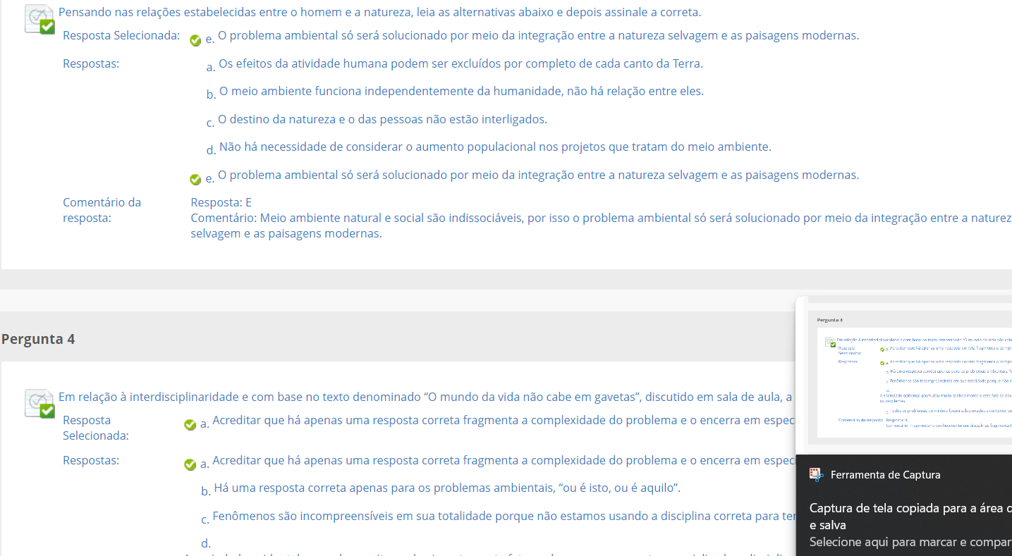 <p>Pensando nas relações estabelecidas entre o homem e a natureza, leia as alternativas abaixo e depois assinale a correta. Resposta Selecionada: e. problema ambiental só será solucionado por meio da integração entre a natureza selvagem e as paisagens modernas. Respostas: a. Os efeitos da atividade humana podem ser excluídos por completo de cada canto da Terra. b. meio ambiente funciona independentemente da humanidade, não há relação entre eles. o destino da natureza e o das pessoas não estão interligados. d. Não há necessidade de considerar aumento populacional nos projetos que tratam do meio ambiente. e. problema ambiental só será solucionado por meio da integração entre a natureza selvagem e as paisagens modernas. Comentário da Resposta: E resposta: Comentário: Meio ambiente natural e social são por isso problema ambiental só será solucionado por meio da integração entre a naturez selvagem e as paisagens modernas. ergunta 4 que a Em relação à interdisciplinaridade e com base no texto denominado "O mundo da vida não cabe em gavetas", discutido em sala de aula, a address in Resposta a. Acreditar que há apenas uma resposta correta fragmenta a complexidade do problema e encerra em espec Selecionada: Respostas: a. Acreditar que há apenas uma resposta correta fragmenta a complexidade do problema e encerra em espec Ferramenta de Captura b. Há uma resposta correta apenas para os problemas ambientais, "ou é isto, ou é aquilo". Captura de tela copiada para a área C Fenômenos são incompreensíveis em sua totalidade porque não estamos usando a disciplina correta para ter e salva d. Selecione aqui para marcar e compar -</p>