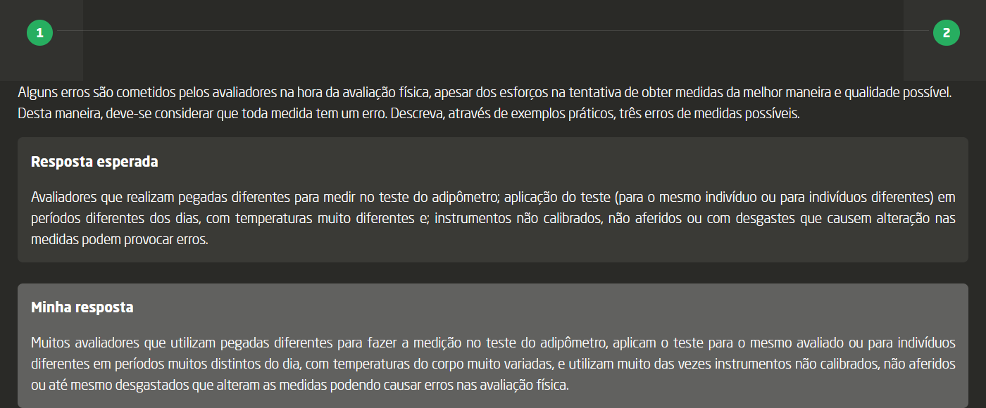 <p>1 2 Alguns erros são cometidos pelos avaliadores na hora da avaliação física, apesar dos esforços na tentativa de obter medidas da melhor maneira e qualidade possível. Desta maneira, deve-se considerar que toda medida tem um erro. Descreva, através de exemplos práticos, três erros de medidas possíveis. Resposta esperada Avaliadores que realizam pegadas diferentes para medir no teste do adipômetro; aplicação do teste (para mesmo indivíduo para indivíduos diferentes) em períodos diferentes dos dias, com temperaturas muito diferentes e; instrumentos não calibrados, não aferidos com desgastes que causem alteração nas medidas podem provocar erros. Minha resposta Muitos avaliadores que utilizam pegadas diferentes para fazer a medição no teste do adipômetro, aplicam teste para mesmo avaliado ou para indivíduos diferentes em períodos muitos distintos do dia, com temperaturas do corpo muito variadas, e utilizam muito das vezes instrumentos não calibrados, não aferidos ou até mesmo desgastados que alteram as medidas podendo causar erros nas avaliação física.</p>