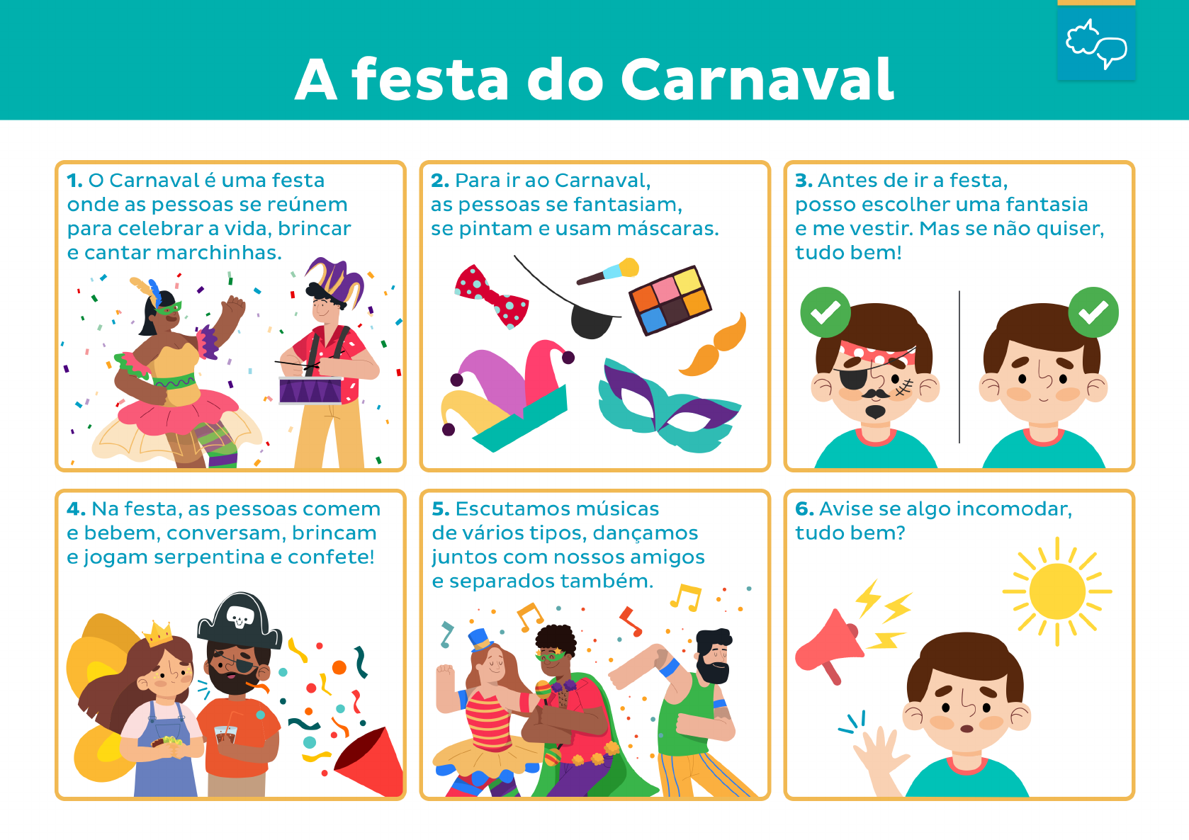 <p>A festa do Carnaval 1.0 Carnaval é uma festa 2. Para in ao Carnaval, 3. Antes de a festa, onde as pessoas se reúnem as pessoas se fantasiam, posso escolher uma fantasia para celebrar a vida, brincar se pintam e usam máscaras. e me vestir. Mas se não quiser, e cantar marchinhas. tudo bem! 4. Na festa, as pessoas comem 5. Escutamos músicas 6. Avise se algo incomodar, e bebem, conversam, brincam de vários tipos, dançamos tudo bem? e jogam serpentina e confete! juntos com nossos amigos e separados também.</p><p>O feriado do Carnaval 1. Carnaval é um período 2. Podemos viajar, ficar em casa 3. Podemos usar tempo para de pausa onde não vamos ou passear com a família descansar, brincar, conversar, à escola. e amigos. ler e ver filmes juntos! 4. Avise se você gostaria 5. Preparamos comidas 6. Ao final desse período, de fazer alguma atividade e bebidas muito gostosas voltamos para a rotina que você acha muito legal! para almoçar e jantar. da escola.</p>