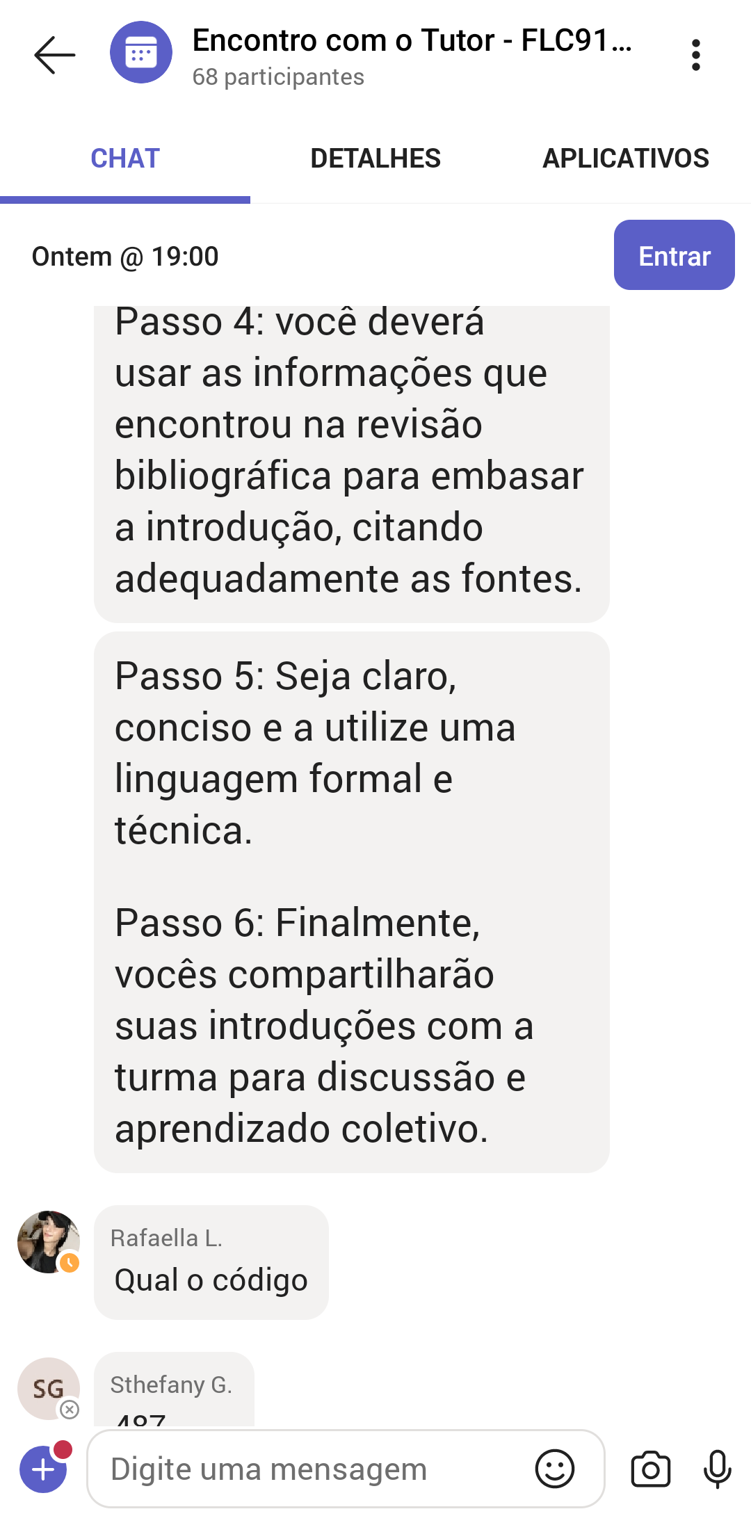 <p>Encontro com o Tutor - FLC91.. ... : 68 participantes CHAT DETALHES APLICATIVOS Ontem @ 19:00 Entrar Passo 4: você deverá usar as informações que encontrou na revisão bibliográfica para embasar a introdução, citando adequadamente as fontes. Passo 5: Seja claro, conciso e a utilize uma linguagem formal e técnica. Passo 6: Finalmente, vocês compartilharão suas introduções com a turma para discussão e aprendizado coletivo. Rafaella L. Qual o código SG Sthefany G.</p>