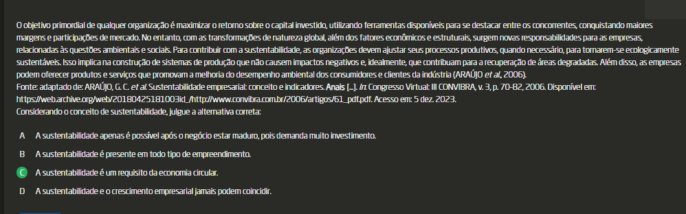 <p>0 objetivo primordial de qualquer organização é maximizar retorno sobre capital investido, utilizando ferramentas disponíveis para se destacar entre concorrentes, conquistando maiores margens e participações de mercado. No com as transformações de natureza global, além dos fatores econômicos e estruturais, surgem novas responsabilidades para as empresas, relacionadas às questões ambientais e Para contribuir com a sustentabilidade, as organizações devem ajustar seus processos produtivos, quando necessário, para tornarem-se ecologicamente Isso implica na construção de sistemas de produção que não causem impactos negativos e, idealmente, que contribuam para a recuperação de áreas Além disso, as empresas podem oferecer produtos e serviços que promovam a melhoria do desempenha ambiental dos consumidores e clientes da indústria (ARAÚJO et al. adaptado de G.C. et Sustentabilidade empresarial: conceito e Anais Congresso Virtual III CONVIBRA V. p. 70-82, 2006. Disponível em: em 5 2023. Considerando conceito de sustentabilidade, julgue a alternativa A A sustentabilidade apenas é possível após negócio estar maduro, pois demanda muito A sustentabilidade é presente em todo tipo de empreendimento. A sustentabilidade é um requisito da economia D A sustentabilidade e crescimento jamais podem</p>