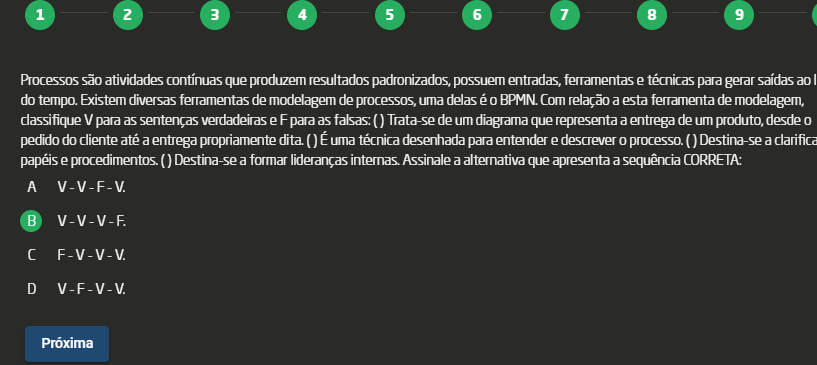 <p>1 2 3 4 5 6 7 8 9 Processos são atividades contínuas que produzem resultados padronizados, possuem entradas, ferramentas e técnicas para gerar saídas ao I do tempo. Existem diversas ferramentas de modelagem de processos, uma delas é BPMN. Com relação a esta ferramenta de modelagem, classifique V para as sentenças verdadeiras e F para as falsas: () Trata-se de um diagrama que representa a entrega de um produto, desde pedido do cliente até a entrega propriamente dita. () É uma técnica desenhada para entender e descrever processo. () Destina-se a clarifica papéis e procedimentos. () Destina-se a formar lideranças internas. Assinale a alternativa que apresenta a sequência CORRETA: A B V-V-V-F D V-F-V-V. Próxima</p>