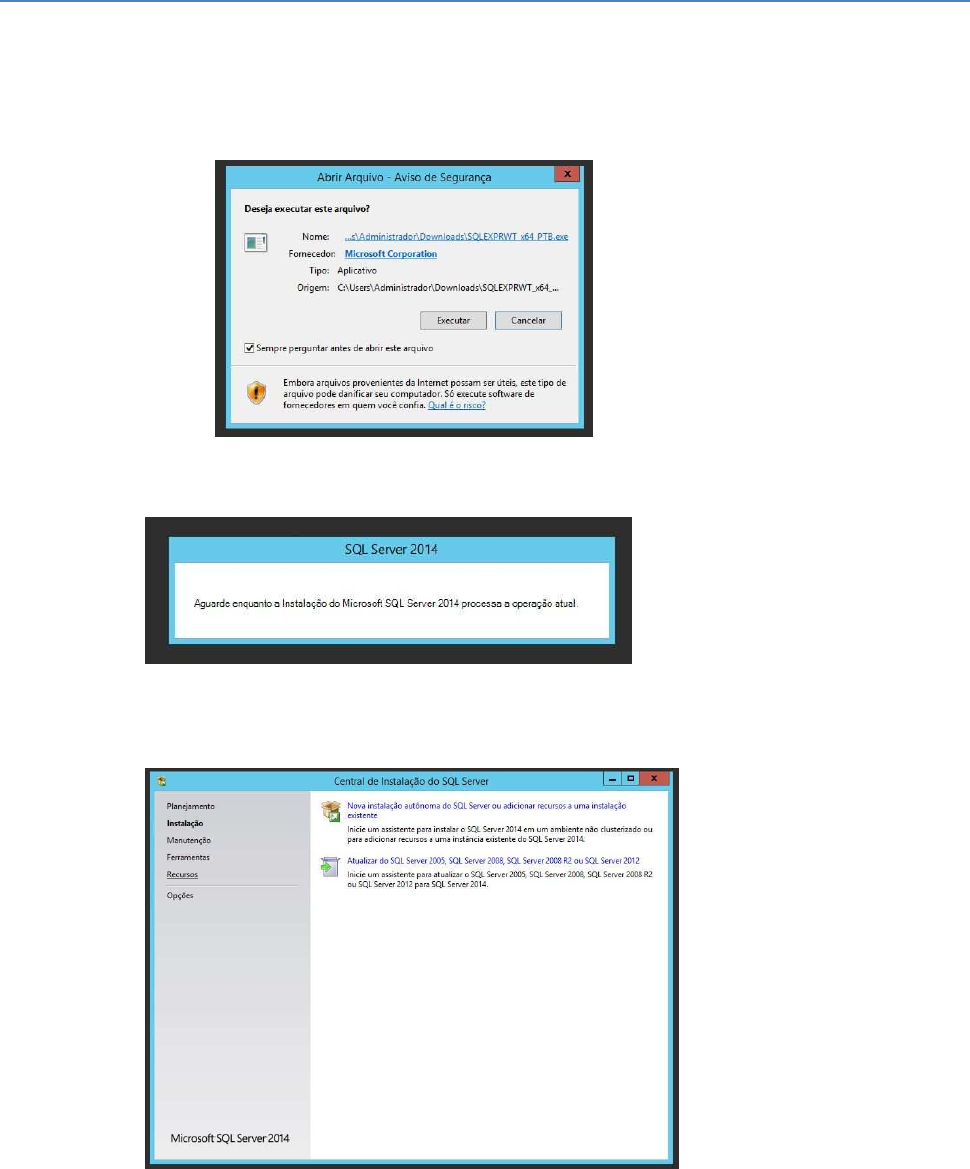 <p>Instalação SQL Server 2014 Express</p><p>Instalação</p><p>Após efetuar o download do pacote de instalação, execute-o. Se for exibido um aviso de segurança, clique</p><p>no botão "Executar" para abrir o instalador do SQL Server 2014:</p><p>Aguarde enquanto a instalação do Microsoft SQL Server 2014 processa a operação:</p><p>Será exibida então a Central de Instalação do SQL Server. Clique no link "Nova instalação autônoma do</p><p>SQL Server ou adicionar recursos a uma instalação existente" para iniciar o instalador do SGBD:</p><p>Na tela seguinte, aceite os termos de licença para software da Microsoft. Você pode também marcar a opção</p><p>"Ative o Programa de Aperfeiçoamento da Experiência do usuário e o Relatório de Erros" se</p><p>desejar, e então clique no botão Avançar:</p><p>Na tela seguinte (Microsoft Update), basta clicar em Avançar para prosseguir:</p><p>Na próxima tela vamos selecionar os recursos a serem instalados. Você pode simplesmente deixar como está</p><p>se desejar. Eu desmarquei a opção "Replicação do SQL Server", pois não vou utilizar este recurso. Clique</p><p>em "Avançar".</p><p>Na próxima tela vamos configurar a instância do SQL Server. na verdade, vou aceitar o padrão, que é a</p><p>instância nomeada SQLExpress. Clique em "Avançar" novamente.</p><p>Na tela seguinte, "Configuração do Servidor", vamos especificar as contas de serviço e a configuração do</p><p>agrupamento.</p><p>Normalmente bastaria clicar em avançar, mas devido a um erro que ocorria repetidamente ao final de meus</p><p>testes de instalação, alterei o nome da conta do serviço Mecanismo de Banco de Dados para "NT</p><p>AUTHORITY\NETWORK SERVICE". O tipo de inicialização para este serviço deve se deixado como</p><p>Automática.</p><p>Clique em "Avançar".</p><p>Na próxima tela vamos especificar o modo de segurança de autenticação, os administradores e os diretórios</p><p>do Mecanismo do Banco de Dados.</p><p>Usarei o "Modo de Autenticação do Windows", e deixarei especificado o usuário Administrador (que</p><p>aparece automaticamente). Neste caso, não é necessário especificar uma senha, pois a autenticação no BD</p><p>será feita pelo próprio usuário do sistema operacional.</p><p>Clique em "Avançar".</p><p>Agora aguarde enquanto a instalação é realizada. O processo pode levar vários minutos.</p><p>Ao término da instalação, basta clicar no botão "Fechar" para encerrar o instalador do SQL Server 2014.</p><p>Excelente! Instalação do Microsoft SQL Server 2014 realizada com sucesso!</p><p>Para testá-lo, basta abrir o SQL Server Management Studio (SSMS), e efetuar uma conexão ao servidor.</p><p>Como usamos autenticação do Windows, não é necessário especificar uma senha. Basta se certificar de que</p><p>o usuário selecionado seja o <nome-seu-servidor>SQLEXPRESS.</p><p>Clique em Conectar para realizar a conexão:</p><p>Se tudo correr bem, você verá a tela inicial do SSMS, como pode ser vista na figura a seguir:</p>