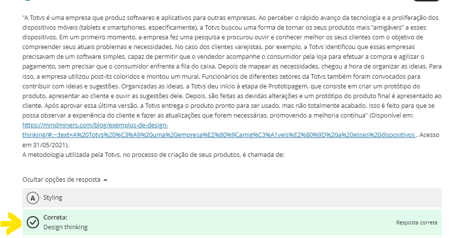 <p>"A Totys é uma empresa que produz softwares e aplicativos para outras empresas. Ao perceber rápido avanço da tecnologia e a proliferação dos dispositivos móveis (tablets e smartphones, a Totys buscou uma forma de tornar os seus produtos mais "amigáveis" a esses dispositivos. Em um primeiro momento, a empresa fez uma pesquisa e procurou ouvir e conhecer melhor os seus clientes com O objetivo de compreender seus atuais problemas e No caso dos clientes varejistas, por exemplo, a identificou que essas empresas precisavam de um software simples, capaz de permitir que vendedor acompanhe consumidor pela loja para efetuar a compra e agilizar O pagamento, sem precisar que O consumidor enfrente a fila do caixa. Depois de mapear as necessidades, chegou a hora de organizar as Para isso, a empresa utilizou post-its coloridos e montou um mural. Funcionários de diferentes setores da também foram convocados para contribuir com ideias e sugestões. Organizadas as ideias, a Totvs deu início à etapa de Prototipagem, que consiste em criar um protótipo do produto, apresentar ao cliente e ouvir as sugestões dele. Depois, são feitas as devidas alterações e um protótipo do produto final é apresentado ao cliente. Após aprovar essa última versão, a Totvs entrega O produto pronto para ser usado, mas não totalmente acabado. Isso é feito para que se possa observar a experiência do cliente e fazer as atualizações que forem promovendo a melhoria (Disponível em: https://mindminers.com/blog/exemplos-de-design- Acesso em 31/05/2021). A metodologia utilizada pela Totvs, no processo de criação de seus produtos, é chamada de: Ocultar opções de resposta A Styling Correta: Resposta correta Design thinking</p>