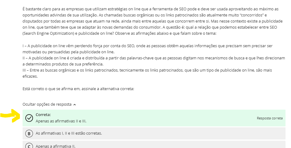 <p>É bastante claro para as empresas que utilizam estratégias on line que a ferramenta de SEO pode e deve ser usada aproveitando ao máximo as oportunidades advindas de sua utilização. As chamadas buscas orgânicas ou os links patrocinados são atualmente muito "concorridos" e disputados por todas as empresas que atuam na rede, ainda mais entre aquelas que concorrem entre si. Mas nesse contexto existe a publicidade on line, que também teve que se adaptar às novas demandas do consumidor. A questão é: qual a relação que podemos estabelecer entre SEO (Search Engine Optimization) e publicidade on line? Observe as afirmações abaixo e que falam sobre tema: I - A publicidade on line vêm perdendo força por conta do SEO, onde as pessoas obtêm aquelas informações que precisam sem precisar ser motivadas ou persuadidas pela publicidade on line. II - A publicidade on line é criada e distribuída a partir das palavras-chave que as pessoas digitam nos mecanismos de busca e que lhes direcionam a determinados produtos de sua preferência. III - Entre as buscas orgânicas e os links patrocinados, tecnicamente os links patrocinados, que são um tipo de publicidade on line. são mais Está correto que se afirma em, assinale a alternativa correta: Ocultar opções de resposta Correta: Resposta correta Apenas as afirmativas e III. B As afirmativas II e III estão Apenas a afirmativa</p>