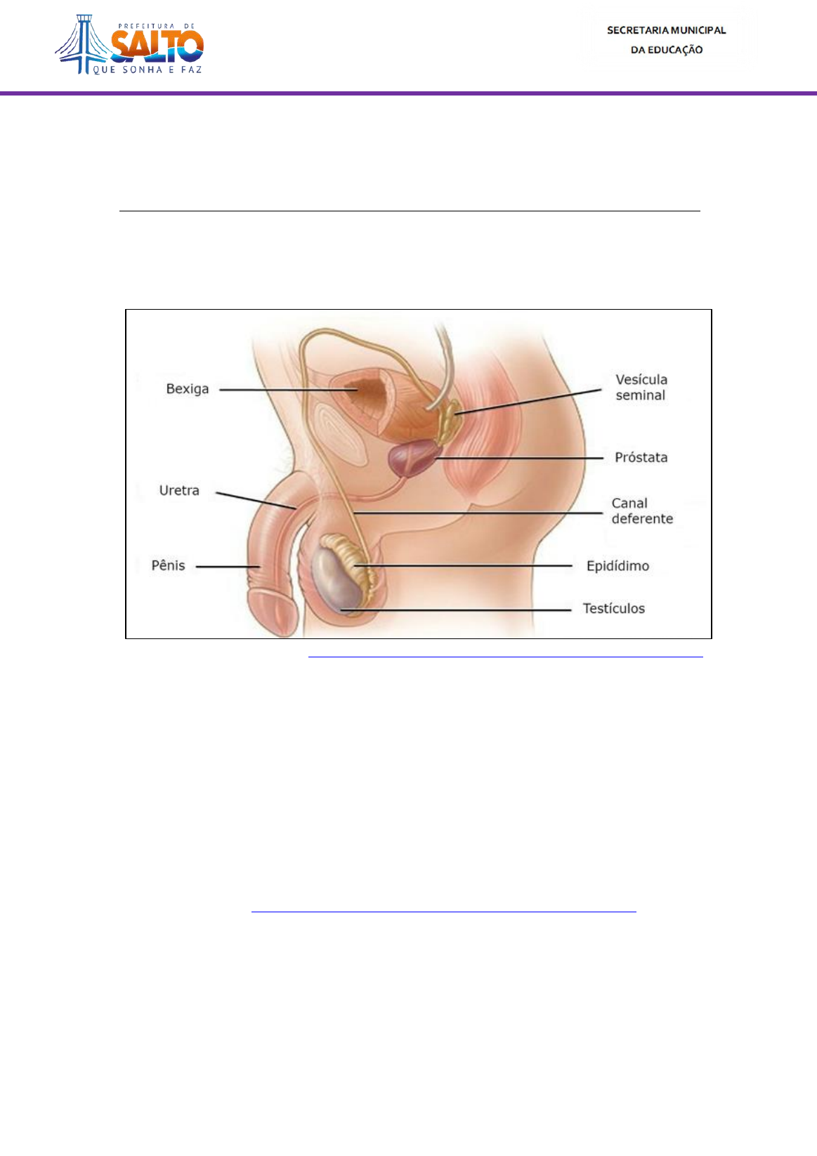 <p>CIÊNCIAS</p><p>ATIVIDADE 1</p><p>NOME: ________ 7º SÉRIE</p><p>ORIENTAÇÃO PARA REALIZAÇÃO DA ATIVIDADE: Sistema reprodutor masculino: O aluno deverá ACESSAR O</p><p>LINK e assistir o vídeo explicativo do tema e analisar o esquema do Sistema reprodutor masculino para responder as questões.</p><p>SISTEMA REPRODUTOR MASCULINO</p><p>Disponível em: https://www.todamateria.com.br/sistema-reprodutor-masculino/</p><p>O Sistema Reprodutor Masculino é formado por órgãos internos e externos. Eles</p><p>passam por um lento amadurecimento concluindo-se na puberdade, ou seja, quando as células</p><p>sexuais ficam disponíveis para originar outro ser.</p><p>Os órgãos que compõem o sistema reprodutor masculino são: uretra, pênis, vesícula</p><p>seminal, próstata, canais deferentes, epidídimo e testículos.</p><p>Acesse o link abaixo para obter maiores informações e responder as Questões</p><p>https://www.youtube.com/watch?v=Dd3m78OMHwI</p><p>1- Os espermatozoide são os gametas masculinos da espécie humana e são produzidos no</p><p>sistema genital do homem, mais precisamente:</p><p>a) nos ductos eferentes.</p><p>b) no epidídimo.</p><p>c) nos túbulos seminíferos.</p><p>d) na próstata.</p><p>e) no testículo</p><p>https://www.todamateria.com.br/sistema-reprodutor-masculino/</p><p>https://www.youtube.com/watch?v=Dd3m78OMHwI</p><p>2- Após serem produzidos, os espermatozoides ficam armazenados até o momento da eliminação</p><p>(ejaculação). Durante o período de armazenamento, essas células também adquirem mobilidade,</p><p>tornando-se aptas a nadar em direção ao ovócito. A região onde os espermatozoides ficam</p><p>armazenados é chamada de:</p><p>a) testículo.</p><p>b) glândula seminal.</p><p>c) túbulo seminífero.</p><p>d) epidídimo.</p><p>e) próstata.</p><p>3- O sistema reprodutor masculino, além de produzir os gametas masculinos, é responsável por</p><p>sintetizar nos testículos um hormônio bastante importante. Marque a alternativa em que está</p><p>indicado o nome desse hormônio.</p><p>a) Insulina.</p><p>b) Hormônio do crescimento.</p><p>c) Progesterona.</p><p>d) Adrenalina.</p><p>e) Testosterona.</p><p>4- A vasectomia é um método contraceptivo que impede a liberação dos espermatozoides na</p><p>ejaculação. Nesse processo, é realizada uma secção em qual parte do sistema genital masculino?</p><p>a) Uretra.</p><p>b) Pênis.</p><p>c) Testículo.</p><p>d) Ducto deferente.</p><p>e) Epidídimo.</p>