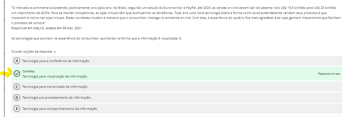 <p>"O mercado e-commerce surpreende, positivamente, ano após ano. No Brasil, segundo um estudo do Euromonitor e PayPal, até 2020, as vendas on-line devem do patamar dos US$ 19,5 bilhões para US$ 28 um crescimento de Para se manter competitivas, as lojas virtuais têm que acompanhar as Todo ano uma nova tecnologia altera a forma como os empreendedores vendem seus produtos e que impactam a rotina nas lojas Essas novidades mudam a maneira que consumidor interage no ambiente on-line Com elas, a experiência do usuário fica mais agradável e as lojas ganham mecanismos que facilitam processo de compra" Disponível em site jn2. Acesso em 06 Nov. 2021. As tecnologias que auxiliam na experiência do consumidor, auxiliando na forma que a informação é visualizada, é: Ocultar opções de resposta A Tecnologia para a conferência da informação. Correta: Resposta correta Tecnologia para visualização da informação. Tecnologia para transmissão da informação. D Tecnologia pra processamento da informação. E Tecnologia para compartilhamento da informação.</p>