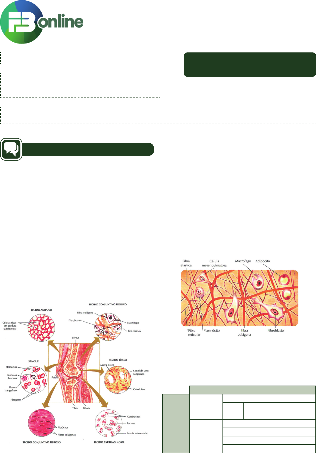 <p>CIÊNCIAS DA NATUREZA</p><p>E SUAS TECNOLOGIAS</p><p>F B O N L I N E . C O M . B R</p><p>//////////////////</p><p>Professor(a): RicaRdo JoRge</p><p>assunto: Tecidos conjuntivos I – T.C.P.D., Tecidos hematopoiético e adiposo</p><p>frente: Biologia 1</p><p>031.520 – 1001/21</p><p>AULA 5</p><p>ENEM/MEDICINA</p><p>Resumo Teórico</p><p>INTRODUÇÃO</p><p>O tecido conjuntivo compõe-se na realidade de um grupo de</p><p>tecidos bastante diversificado e de ampla distribuição pelo organismo</p><p>dos animais. Desempenha funções variadas: faz conexão entre tecidos</p><p>e órgãos, dá sustentação mecânica, protege contra infecções, distribui</p><p>substâncias pelo organismo, armazena algumas substâncias e produz</p><p>outras, que entram na sua própria composição e participam de</p><p>processos de cicatrização em diferentes órgãos.</p><p>O tecido conjuntivo tem constituição complexa, sendo formado</p><p>por diferentes tipos de células e fibras, mergulhadas em uma substância</p><p>intercelular (substância fundamental), geralmente de consistência</p><p>gelatinosa. Seus três elementos – as células, as fibras e a substância</p><p>fundamental – podem apresentar-se em diferentes proporções e estar</p><p>ou não em uma determinada organização. São exemplos de tecidos</p><p>conjuntivos: TC frouxo, TC denso, adiposo, cartilaginoso, ósseo</p><p>e o sanguíneo.</p><p>COMPONENTES DO TECIDO CONJUNTIVO</p><p>As células comumente encontradas nos tecidos conjuntivos</p><p>são os fibroblastos, produtores de fibras colágenas, elásticas</p><p>e reticulares (todas finos filamentos proteicos); os macrófagos,</p><p>responsáveis pela fagocitose de elementos estranhos; os mastócitos,</p><p>produtores de histamina e de heparina; os plasmócitos, produtores de</p><p>anticorpos; alguns leucócitos (glóbulos brancos) e as células adiposas</p><p>(adipócitos).</p><p>As fibras colágenas têm esse nome porque o colágeno, a</p><p>proteína que as constitui, converte-se em substância gelatinosa se</p><p>submetido a fervura prolongada. São muito resistentes à tração e</p><p>agrupam-se em grossos feixes. As fibras elásticas são bem mais finas e</p><p>flexíveis e têm ramificações; as fibras reticulares, também muito finas,</p><p>formam verdadeiras redes (retículos).</p><p>A substância fundamental, homogênea e gelatinosa, é</p><p>constituída geralmente por água, sais e glicoproteínas. Por meio dela</p><p>se difundem muitas substâncias, que podem assim ser trocadas entre</p><p>as muitas células, no interior do tecido conjuntivo ou entre diferentes</p><p>tecidos vizinhos.</p><p>TIPOS DE TECIDOS CONJUNTIVOS</p><p>Os tecidos conjuntivos típicos, que têm substância fundamental</p><p>gelatinosa, aspectos e funções variadas e se distribuem por quase todos</p><p>os órgãos, são reunidos sob o nome genérico de tecido conjuntivo</p><p>propriamente dito (TCPD).</p><p>Classificação dos tecidos conjuntivos</p><p>Tecido</p><p>conjuntivo</p><p>Tecido</p><p>conjuntivo</p><p>propriamente</p><p>dito</p><p>Frouxo</p><p>Denso</p><p>Denso modelado (ou tendinoso)</p><p>Denso não modelado (ou fibroso)</p><p>Tecidos</p><p>conjuntivos</p><p>especiais</p><p>Adiposo</p><p>Cartilaginoso</p><p>Ósseo</p><p>Hematopoiético (ou hemocitopoético)</p><p>2F B O N L I N E . C O M . B R</p><p>//////////////////</p><p>Módulo de estudo</p><p>031.520 – 1001/21</p><p>Dependendo da proporção entre seus três elementos, da</p><p>organização das fibras e da função, o TCPD pode ser assim</p><p>classificado:</p><p>1. Tecido conjuntivo frouxo é um tecido moldável, macio, que</p><p>normalmente preenche espaços entre feixes musculares, em</p><p>meio a vários órgãos viscerais e ainda na derme.</p><p>2. Tecido conjuntivo denso não modelado (fibroso) é muito</p><p>resistente a trações e, em geral, forma grossas cápsulas que</p><p>envolvem e protegem vários órgãos, como rins, testículos, baço</p><p>e fígado. Ocorre ainda na derme, e são seus grossos feixes de</p><p>fibras colágenas, dispostos sem orientação, que nos fornecem</p><p>o couro quando a pele dos animais é curtida.</p><p>3. Tecido conjuntivo denso modelado (tendinoso) tem ampla</p><p>predominância de feixes de fibras colágenas, organizadas em</p><p>uma única direção, ficando bem visíveis entre elas os grandes</p><p>núcleos dos fibrócitos (fibroblastos). Constituem os tendões</p><p>os feixes que ligam as extremidades dos músculos aos ossos</p><p>e os ligamentos, cordões que “amarram” os ossos unindo-os</p><p>firmemente na região das articulações.</p><p>4. Tecido conjuntivo hemocitopoético dá origem às células</p><p>sanguíneas. Contém duas linhagens de células, a linfoide,</p><p>que origina os linfócitos, e a mieloide, que origina os demais</p><p>leucócitos e também as hemácias (glóbulos vermelhos).</p><p>5. Tecido conjuntivo adiposo tem em predominância grandes</p><p>células (adipócitos) arredondadas, que armazenam uma gota de</p><p>lipídios na região central, situando-se o núcleo e uma pequena</p><p>camada de citoplasma junto à membrana celular.</p><p>6. Tecido conjuntivo ósseo é formado por células denominadas</p><p>osteoblastos e osteoclastos, responsáveis pelo processo de</p><p>mineralização e desmineralização óssea.</p><p>7. Tecido conjuntivo cartilaginoso que, embora faça parte do</p><p>conjuntivo, tem ausência de vascularização.</p><p>Exercícios</p><p>01. (CPS) A pele é o maior órgão do corpo humano, revestindo</p><p>toda a superfície corporal. Funciona como uma barreira</p><p>protetora contra as radiações solares, particularmente os raios</p><p>ultravioleta, lembrando que a exposição excessiva ao sol aumenta</p><p>drasticamente o risco de câncer de pele.</p><p>A pele atua também na proteção contra agentes mecânicos</p><p>(atrito e pressões), químicos (substâncias prejudiciais) e biológicos</p><p>(microrganismos patogênicos). Além 