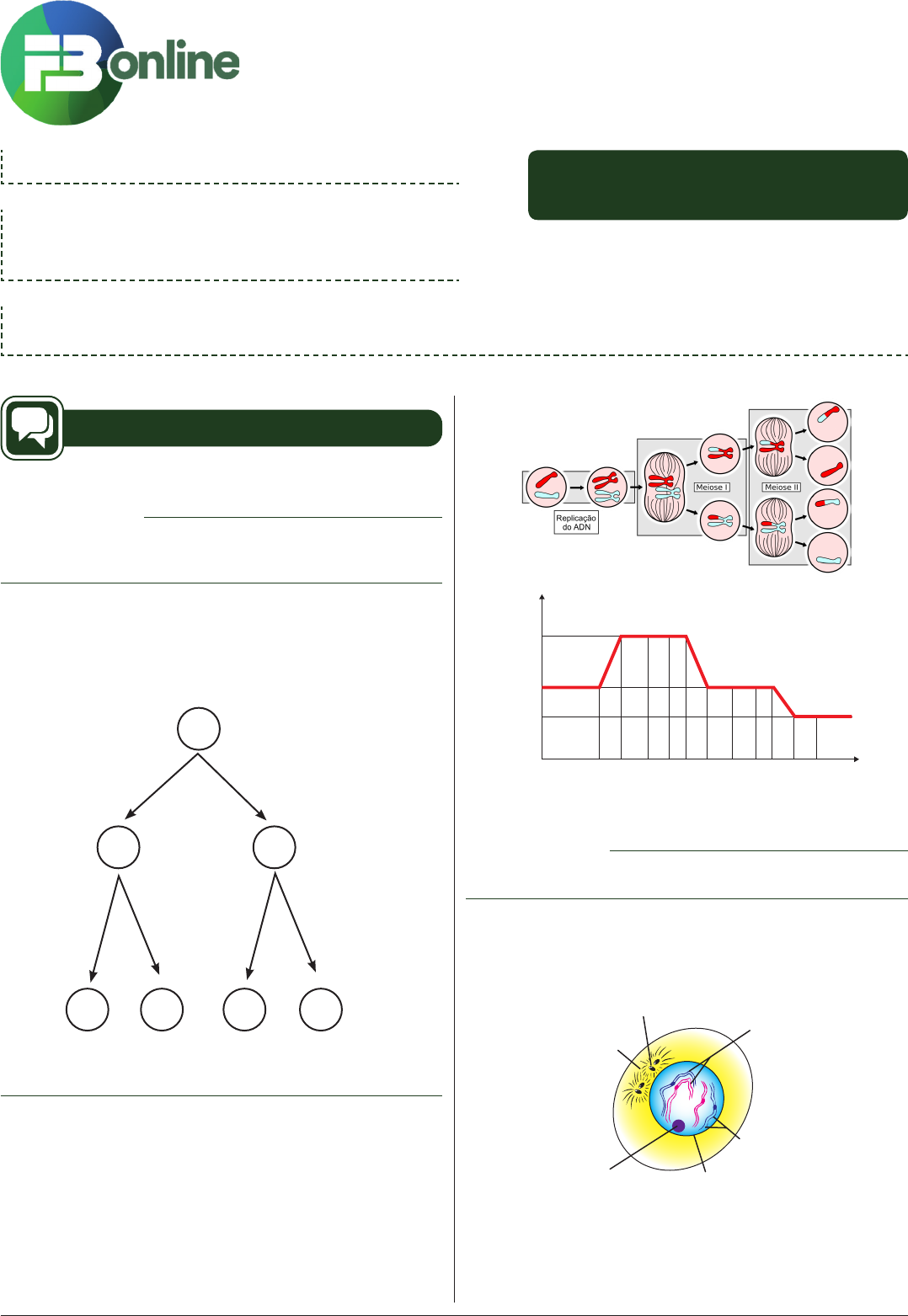 <p>CIÊNCIAS DA NATUREZA</p><p>E SUAS TECNOLOGIAS</p><p>F B O N L I N E . C O M . B R</p><p>//////////////////</p><p>Professor(a): Marcelo Henrique</p><p>assunto: Divisão celular: Meiose</p><p>frente: Biologia iii</p><p>OSG.: 121362/17</p><p>AULA 25</p><p>EAD – MEDICINA</p><p>Resumo Teórico</p><p>Meiose</p><p>Aspectos Gerais</p><p>• Divisão celular em que a célula-mãe gera quatro células-filhas,</p><p>diferentes entre si e diferente da célula-mãe.</p><p>• Gametogênese (espermatogênese e ovulogênese).</p><p>• Produção de esporos (ciclos vegetais e dos fungos).</p><p>• Geração de variabilidade genética.</p><p>2n</p><p>Meiose I</p><p>Meiose II</p><p>n</p><p>n n n n</p><p>n</p><p>Etapas de meiose</p><p>Meiose I (reducional)</p><p>Reduz a informação genética à metade.</p><p>Divide-se em: prófase I, metáfase I, anáfase I e telófase I.</p><p>Meiose II (equacional)</p><p>Reduz o volume de DNA à metade.</p><p>Divide-se em : prófase II, metáfase II, anáfase II e telófase II.</p><p>G1</p><p>G2 P1</p><p>P2</p><p>M1</p><p>M2</p><p>A1</p><p>A2</p><p>T1</p><p>T2</p><p>S</p><p>x</p><p>2x</p><p>4x</p><p>DNA</p><p>t144244314424431442443</p><p>Interfase Meiose I Meiose I</p><p>t</p><p>Meiose (reducional)</p><p>Prófase I</p><p>É a fase mais longa da meiose, na qual ocorrem os fenômenos</p><p>de maior importância biológica.</p><p>Semelhante à mitose, por ser uma fase de preparação.</p><p>Desaparece a membrana nuclear e o nucléolo.</p><p>As cadeias de DNA se condensam, formando os cromossomos.</p><p>Centríolo</p><p>Início de</p><p>formação</p><p>do fuso</p><p>Cromossomos</p><p>homólogos</p><p>Cromômeros</p><p>CariotecaNucléolo</p><p>Leptóteno</p><p>• Destaque para a recombinação gênica (crossing-over), na qual há</p><p>troca de fragmentos de DNA entre cromossomos homólogos.</p><p>• A prófase I é composta de cinco períodos: leptóteno, zigóteno,</p><p>paquíteno, diplóteno e diacinese.</p><p>2F B O N L I N E . C O M . B R</p><p>//////////////////</p><p>Módulo de estudo</p><p>OSG.: 121362/17</p><p>Leptóteno: condensação dos cromossomos</p><p>Centríolo</p><p>Início de</p><p>formação</p><p>do fuso</p><p>Cromossomos</p><p>homólogos</p><p>Cromômeros</p><p>CariotecaNucléolo</p><p>Leptóteno</p><p>Zigóteno: pareamento dos cromossomos</p><p>Emparelhamento</p><p>dos cromossomos</p><p>homólogos</p><p>Cromátides-irmãs</p><p>Cromossomos</p><p>homólogos</p><p>Complexo sinaptonêmico</p><p>Coesinas</p><p>Paquíteno: espessamento máximo dos cromossomos,</p><p>ocorrência do crossing-over</p><p>Cromossomos</p><p>homólogos emparelhados</p><p>(bivalentes ou tétrades)</p><p>Diplóteno: formação dos quiasmas</p><p>Quiasmas</p><p>Nucléolo em</p><p>desaparecimento</p><p>Diacinese: terminalização dos quiasmas – migração</p><p>para o centro da célula</p><p>Carioteca em</p><p>desintegração</p><p>Terminalização</p><p>dos quiasmas</p><p>Fuso</p><p>acromático</p><p>Metáfase I</p><p>Os pares dos cromossomos homólogos se situam na parte</p><p>média da célula formando a placa equatorial.</p><p>Fibras cromossômicas</p><p>Cromátides</p><p>permutadas</p><p>Cromátide</p><p>parental</p><p>Anáfase I</p><p>Ocorre a separação e migração dos cromossomos homólogos.</p><p>No final da anáfase I, temos dois jogos de cromossomos</p><p>separados nos polos opostos da célula, um de cada par.</p><p>Nesta fase ocorre a redução do número de cromossomos pela</p><p>metade.</p><p>3 F B O N L I N E . C O M . B R</p><p>//////////////////</p><p>OSG.: 121362/17</p><p>Módulo de estudo</p><p>Cromossomos homólogos</p><p>em migração para</p><p>polos opostos</p><p>Cromátides-irmãs</p><p>Telófase I</p><p>Ocorre a regeneração do núcleo, iniciando-se imediatamente</p><p>a divisão II. Cada cromossomo mantém-se constituído por duas</p><p>cromátides e o número de ploidias em cada uma das células nesta</p><p>fase é n (haploide).</p><p>Cromossomos em</p><p>descondensação</p><p>Cariotecas</p><p>reconstituídas</p><p>Duplicação</p><p>dos centríolos</p><p>Citocinese</p><p>em curso</p><p>Nucléolo</p><p>reaparecendo</p><p>Meiose II (equacional)</p><p>Aspectos Gerais</p><p>• Semelhante às etapas da mitose que ocorre nas duas células-filhas,</p><p>simultaneamente.</p><p>• Na prófase II se unem os cromossomos individuais às fibras do fuso,</p><p>e na anáfase II, se separam as cromátides.</p><p>Cromossosmos</p><p>espalham-se pela</p><p>célula e as fibras polares</p><p>passam a ocupar a</p><p>região correspondente</p><p>ao núcleo</p><p>Surgem as fibras</p><p>cinetocóricas que</p><p>se associam às</p><p>fibras polares</p><p>Cromossomos</p><p>condensam-se.</p><p>O centríolo</p><p>divide-se.</p><p>A canoteca e</p><p>o núcleo</p><p>desaparecem.</p><p>Os centrômeros dividem-se</p><p>e cada cromátide de uma</p><p>díade dirige-se para um</p><p>polo da célula, recebendo</p><p>o nome de cromossomo-irmão.</p><p>Cromossomos-irmãos nos polos</p><p>da célula. Fibras do fuso</p><p>desaparecem e a carioteca e o</p><p>núcleo reorganizam-se.</p><p>Cromossomos-irmãos nos polos</p><p>da célula. Fibras do fuso</p><p>desaparecem e a carioteca e o</p><p>núcleo reorganizam-se.</p><p>Os cromossomos</p><p>desespiralizam-se.</p><p>Ocorre a citocinese.</p><p>PRÓFASE II PROMETÁFASE III</p><p>METÁFASE II ANÁFASE II</p><p>TELÓFASE II</p><p>e CITOCINESE</p><p>Díades no equador</p><p>celular ligadas às</p><p>fibras cinetocóricas.</p><p>Observe que a</p><p>disposição é</p><p>semelhante à da</p><p>mitose a partir do</p><p>cinetócoro de cada</p><p>cromátide–irmã, as</p><p>fibras cinetocóricas</p><p>irradiam-se para</p><p>polos opostos.</p><p>Cromossosmos</p><p>espalham-se pela</p><p>célula e as fibras polares</p><p>passam a ocupar a</p><p>região correspondente</p><p>ao núcleo</p><p>Surgem as fibras</p><p>cinetocóricas que</p><p>se associam às</p><p>fibras polares</p><p>Cromossomos</p><p>condensam-se.</p><p>O centríolo</p><p>divide