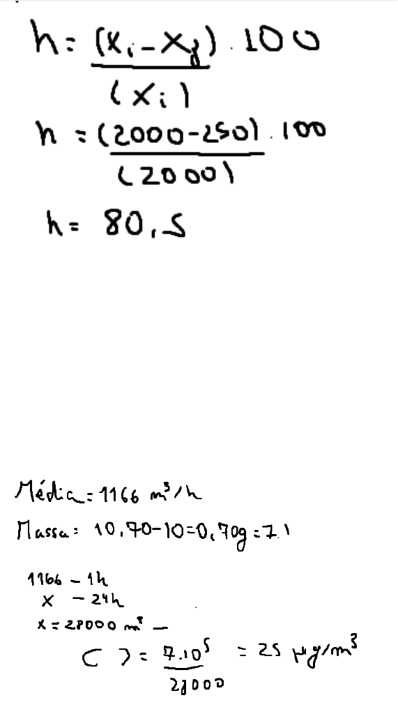 <p>ESTUDO DIRIGIDO AVALIAÇÕES PROTEÇÃO AMBIENTAL</p><p>Aluno: João Pedro Rosa Ávila</p><p>Professor: Thiago de Alencar Neves</p><p>AVALIAÇÃO 1- Módulo Atmosfera</p><p>Questão 1- No sistema combinado de controle da poluição abaixo (ECP), calcule a eficiência</p><p>global do sistema em percentual, para que a concentração de NO2 atenda os valores</p><p>preconizados pela organização mundial da saúde. Considere que os resultados são médias</p><p>anuais emitidas e que as emissões distintas do NO2 sejam preservadas no sistema . Atenção, não</p><p>colocar % na resposta.</p><p>R: 80,5</p><p>Questão 2 - Marque a alternativa correta e mostre os cálculos. Um filtro limpo e preparado</p><p>para análise de MP apresentou uma massa de 10,0 gramas. O filtro foi colocado num</p><p>Amostrador de Grande Volume para amostragem de MP. Após 24 horas de amostragem o filtro</p><p>foi levado ao laboratório e apresentou uma massa de 10,70 gramas. Contudo, algum problema</p><p>no equipamento fez com que vários valores de vazão fossem medidos. Os valores foram ao</p><p>longo dia: 1600, 900, 1200, 1500, 1000, 800 m3/h. Qual seria a concentração de MP em μg/m3?</p><p>b) 25 μg/m3</p><p>R:</p><p>Questão 3- Marque a alternativa correta. Sobre contaminantes e poluentes, assinale a</p><p>alternativa correta:</p><p>d) Um poluente sempre será um contaminante, independentemente de sua concentração no</p><p>meio.</p><p>R: Todos os poluentes seriam classificados como contaminantes, independentemente de sua</p><p>concentração no meio ambiente. Nesse caso, um poluente seria qualquer substância ou forma de</p><p>energia introduzida no ambiente, seja de origem natural ou causada por atividades humanas, que</p><p>cause desequilíbrio, degradação ou efeitos indesejáveis no ecossistema, nos organismos vivos</p><p>ou em seus processos.</p><p>Questão 4- Com o aumento da velocidade do vento, o volume dispersado de um poluente de</p><p>uma dada fonte poluidora em função do tempo</p><p>a) Aumenta</p><p>R: Com o aumento da velocidade do vento, o volume dispersado de um poluente de uma dada</p><p>fonte poluidora em função do tempo tende a aumentar. Isso ocorre devido à maior capacidade de</p><p>transporte e dispersão do poluente pelo vento.</p><p>Questão 5- Marque a alternativa correta. Num processo de inversão térmica o processo de</p><p>dispersão e ascensão de poluentes, respectivamente é:</p><p>d) Prejudicado e ascensão é dificultada</p><p>R: Na ocorrência de uma inversão térmica, o processo de dispersão de poluentes é prejudicado,</p><p>enquanto o processo de ascensão dos poluentes é inibido.</p><p>Questão 6- Sobre a Camada Limite Atmosférica (CLA) é correto afirmar que:</p><p>d)A CLA é uma camada turbulenta, que sofre influência da superfície terrestre, possui cerca de</p><p>3km de altura, a qual faz parte da Troposfera</p><p>R: Dentro da CLA, ocorrem processos de turbulência, mistura de ar e transferência de energia e</p><p>massa entre a superfície terrestre e a atmosfera. Essa camada desempenha um papel importante</p><p>na dispersão de poluentes, na formação de nuvens e na regulação das condições climáticas</p><p>locais.</p><p>Questão 7- O conceito de conservação ambiental implica no uso racional dos recursos</p><p>naturais. Desse modo, ele está diretamente ligado ao conceito de:</p><p>c) sustentabilidade</p><p>R: Sustentabilidade é uma característica ou condição de um processo ou de um sistema que</p><p>permite a sua permanência, em certo nível, por um determinado prazo, ou segundo a WWF, É o</p><p>desenvolvimento que não esgota os recursos para o futuro.</p><p>Questão 8- O amostrador deste questionário, foi colocado próximo de um ponto de poluição.</p><p>Sabendo que essa poluição é de uma empresa, a mesma adotou um processo de tratamento. O</p><p>processo indicou 85% de tratamento do total de material particulado obtido anteriormente.</p><p>Sabendo o que não foi tratado foi emitido como NO2, qual seria a concentração em ppb emitida</p><p>para atmosfera? Use os algarismos significativos para resposta.</p><p>I. Menor que 2 ppb</p><p>II. Aproximadamente 2 ppb</p><p>III. Maior que 2 ppb</p><p>IV. Menor que 1 ppb</p><p>V. Maior que 1 ppb</p><p>c) Nenhuma das alternativas</p><p>Questão 9- Marque a alternativa correta. Dos poluentes abaixo, aqueles que estão envolvidos</p><p>nos processos de inversão térmica, aumento do efeito estufa e chuva ácida são</p><p>e) SO2, CH4, NOx</p><p>R: Esses poluentes estão diretamente envolvidos nos processos de inversão térmica, aumento do</p><p>efeito estufa e chuva ácida. Explicando cada um deles:</p><p>SO2 (dióxido de enxofre): É um poluente liberado principalmente pela queima de combustíveis</p><p>fósseis, como carvão e petróleo. O SO2 contribui para a formação de chuva ácida, quando reage</p><p>com o vapor de água na atmosfera, formando ácido sulfúrico.</p><p>CH4 (metano): É um gás de efeito estufa, com potencial de aquecimento global muito maior do</p><p>que o dióxido de carbono (CO2). O CH4 é liberado por fontes naturais, como pântanos e</p><p>animais ruminantes, e por atividades humanas, como a produção e distribuição de gás natural, a</p><p>decomposição de resíduos orgânicos e a agricultura intensiva.</p><p>NOx (óxidos de nitrogênio): São compostos formados pela reação do nitrogênio com o oxigênio</p><p>durante processos de combustão em altas temperaturas, como a queima de combustíveis fósseis</p><p>e a queima de biomassa. Os NOx contribuem para a formação de chuva ácida e também para o</p><p>aumento do efeito estufa.</p><p>Questão 10- No sistema combinado de controle da poluição abaixo (ECP), calcule a eficiência</p><p>global do sistema em percentual. Atenção, não colocar % na resposta.</p><p>R:</p><p>Questão 11- No sistema combinado de controle da poluição abaixo (ECP), calcule o aumento</p><p>da eficiência global do sistema em per