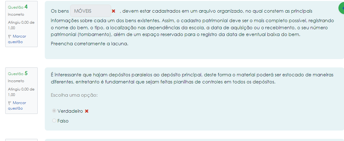 <p>Questão 4 Os bens MÓVEIS x devem estar cadastrados em um arquivo organizado, no qual constem as principais Incorreto Atingiu de informações sobre cada um dos bens existentes. Assim, O cadastro patrimonial deve ser mais completo possível, registrando 1,00 O nome do bem, tipo, a localização nas dependências da escola, a data de aquisição ou recebimento, seu número P Marcar patrimonial (tombamento), além de um espaço reservado para O registro da data de eventual baixa do bem. questão Preencha corretamente a lacuna. Questão 5 É interessante que hajam depósitos paralelos ao depósito principal, deste forma material poderá ser estocado de maneiras Incorreto diferentes, entretanto é fundamental que sejam feitas planilhas de controles em todos os depósitos. Atingiu 0,00 de Escolha uma opção: Marcar questão Verdadeiro x Falso</p>