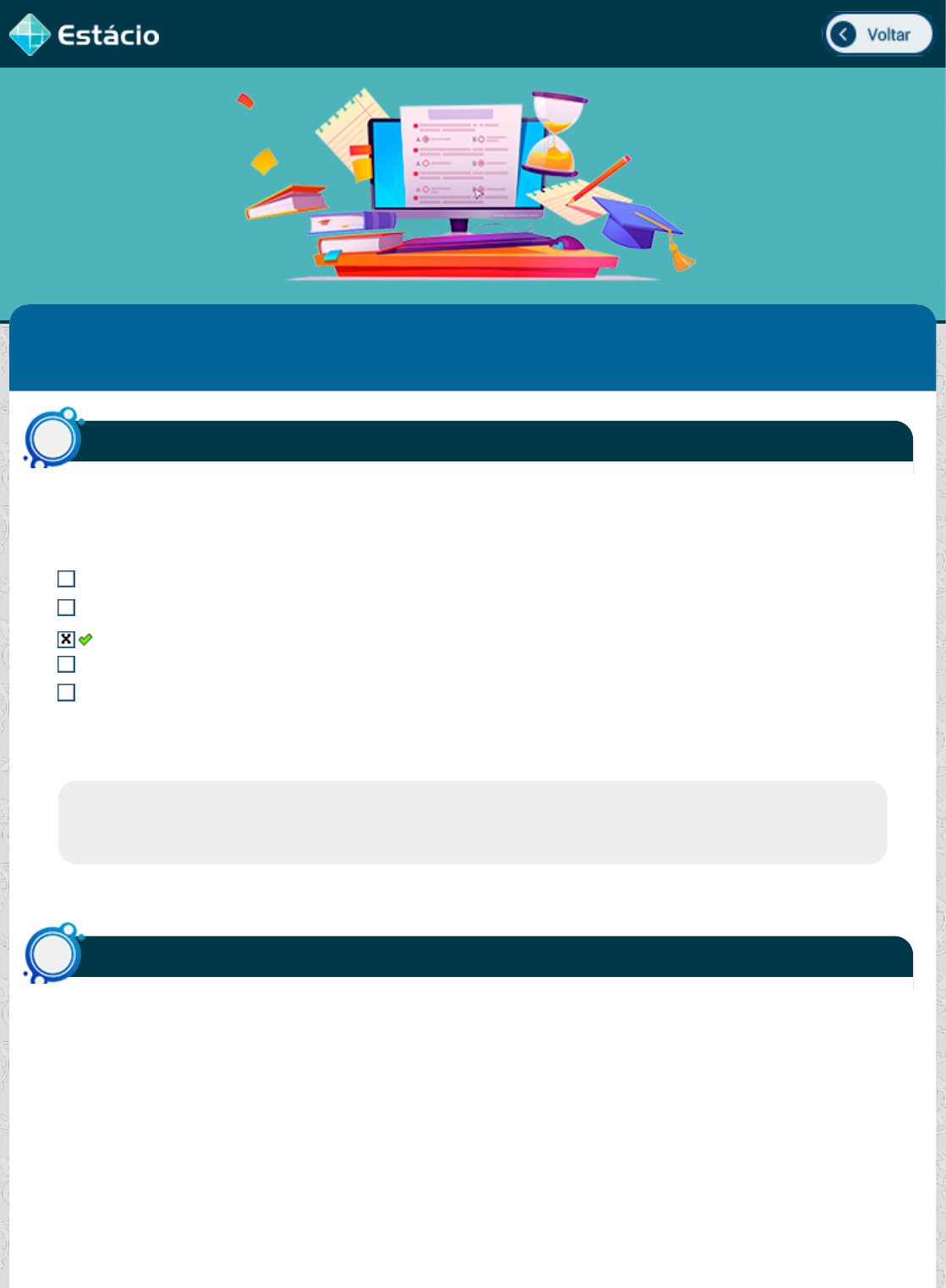 <p>Disco.: ALGORITMOS E COMPLEXIDADEALGORITMOS E COMPLEXIDADE</p><p>Acertos: 2,02,0 de 2,0 de 2,0 12/09/202312/09/2023</p><p>Acerto: 0,20,2 / 0,20,2</p><p>Registros são exemplos de tipos de dados heterogêneos. Assim, sobre tipos de dados elementares e</p><p>estruturados, é correto afirmar que os elementos de um registro são de tamanhos especificamente</p><p>diferentes e residem em posições de memória:</p><p>espalhadas</p><p>flexível flexível</p><p>adjacentes</p><p>pesquisados</p><p>processuais</p><p>Respondido em 12/09/2023 21:19:45</p><p>Explicação:</p><p>Os elementos de um registro são alocados em posições adjacentes à memória.</p><p>Acerto: 0,20,2 / 0,20,2</p><p>O código abaixo é uma correção:</p><p>classe pública Mistério {</p><p>público estático longo Mistério(long x) {</p><p>se (x == 1)</p><p>retornar 1;</p><p>outro</p><p>Questão / 1 1</p><p>uma</p><p>Questão / 2 2</p><p>uma</p><p>return x * Mistério(x-1);</p><p>}</p><p>}</p><p>Recursiva da série de Fibonacci</p><p>Iterativa da exponenciação</p><p>Iterativa da série de Fibonacci</p><p>Recursiva do fatorial</p><p>Recursiva da exponenciação</p><p>Respondido em 12/09/2023 21:21:49</p><p>Explicação:</p><p>Resposta correta: Recursiva do fatorial</p><p>Acerto: 0,20,2 / 0,20,2</p><p>O "Selection Sort", ou ordenação por seleção, é outro algoritmo simples de ordenação. O princípio básico</p><p>deste método é dividir o array em duas partes: a parte já ordenada e a parte não ordenada.</p><p>Em relação à eficiência para grandes conjuntos de dados, como o ¿Selection Sort¿ se?</p><p>Depende do tipo de dados.</p><p>Ineficiente.</p><p>Muito eficiente.</p><p>Altamente otimizado para grandes conjuntos.</p><p>Medianamente eficiente.</p><p>Respondido em 12/09/2023 21:24:17</p><p>Explicação:</p><p>Como ele possui uma complexidade O(n</p><p>2</p><p>), ele é ineficiente para grandes conjuntos de dados.</p><p>Acerto: 0,20,2 / 0,20,2</p><p>Analise a próxima árvore binária e assinale a alternativa correta.</p><p>Questão / 3a 3a</p><p>_</p><p>Questão / 4a 4a</p><p>_</p><p>"B" e "C" são caules de árvore.</p><p>Com exceção do nó "A", que é raiz, os demais nós são como folhas conhecidas.</p><p>"A" é filho de todos.</p><p>“B” tem grau de saída 3 e “C” grau 2.</p><p>TA é um subárvore enraizado em "A", portanto toda a árvore.</p><p>Respondido em 12/09/2023 21:26:40</p><p>Explicação:</p><p>A resposta correta é: TA é a subárvore enraizada em "A", portanto toda a árvore.</p><p>Acerto: 0,20,2 / 0,20,2</p><p>(CESPE/CEBRASPE - IFF - Professor - Engenharia da Computação - 2018)</p><p>Considerando o gráfico precedente, assinale a opção correta:</p><p>Os nós 2 e 3 têm grau 3.</p><p>O nó 5 é adjacente a si mesmo.</p><p>Os nós 1 e 4 são adjacentes.</p><p>Os arcos a1 e a2 são arcos irmãos.</p><p>O gráfico não pode ser classificado como conexão.</p><p>Respondido em 12/09/2023 21:26:49</p><p>Questão / 5 5</p><p>uma</p><p>Explicação:</p><p>Resposta correta: O gráfico não pode ser classificado como conexão.</p><p>Acerto: 0,20,2 / 0,20,2</p><p>Considere os algoritmos a seguir e suas correspondentes complexidades indicadas:</p><p>Estão corretas apenas as complexidades indicadas para os algoritmos:</p><p>I, II e III.</p><p>I, II e IV.</p><p>I, III, IV e V.</p><p>II, III, IV e V.</p><p>II, III e V.</p><p>Respondido em 12/09/2023 21:32:19</p><p>Explicação:</p><p>A resposta correta é: I, II e III.</p><p>I - Correta, o pior caso da busca é não se encontrar o elemento buscado, só podemos concluir que o elemento não</p><p>está na lista após compara o elemento buscado com todos os elementos, configurando O(N).</p><p>II - Correta, o pior caso também é não encontrar o elemento buscado. Fazemos divisões sucessivas até a lista</p><p>tornar-se unitária e cada dada divisão dividimos o vetor de tamanho original por 2k, paramos quando 1 = 2k, assim</p><p>k = log2 n.</p><p>III - Correta, uma soma para cada elemento do vetor, como o vetor tem n elementos O(N).</p><p>IV - Falsa, no caso geral, O(N), mesmo se as listas forem ordenadas ainda é válido o resultado. Basta inserir no fim</p><p>da lista o menor elemento das listas ainda não concatenadas.</p><p>V - Na pior hipótese, vamos inserir o novo elemento na primeira posição. Assim, teremos que mover todos os</p><p>elementos 1 posição a frente, isto é, N-1 operações de atribuição O(N).</p><p>Acerto: 0,20,2 / 0,20,2</p><p>Questão / 6a 6a</p><p>_</p><p>Questão / 77a</p><p>Ano: 2014 Banca: FUNCAB Órgão: MDA Prova: FUNCAB - 2014 - MDA - Analista de Negócios</p><p>Observe o algoritmo a seguir, que utiliza o conceito de função recursiva.</p><p>algoritmo "MDA"</p><p>var</p><p>X, W, N : inteiro</p><p>funcao FF(Y:inteiro):inteiro</p><p>inicio</p><p>N <- N + 1|</p><p>se Y < 2 entao</p><p>retorne 1</p><p>senao</p><p>retorne Y * FF(Y-1)</p><p>fimse</p><p>fimfuncao</p><p>inicio</p><p>X <-5</p><p>N <-0</p><p>W <- FF(X)</p><p>W <-W-50</p><p>escreval(W,N)</p><p>fimalgoritmo</p><p>Após a execução, o algoritmo, os valores de W e N serão, respectivamente:</p><p>70 e 0</p><p>70 e 1</p><p>70 e 5</p><p>120 e 5</p><p>120 e 1</p><p>Respondido em 09/12/2023 21:26:57</p><p>Explicação:</p><p>Resposta correta: 70 e 5</p><p>Acerto: 0,20,2 / 0,20,2</p><p>A complexidade de algoritmos é uma medida que indica os recursos necessários para a execução de um</p><p>algoritmo em função do tamanho da entrada.</p><p>Como expressamos a complexidade do ¿Bubble Sort¿ quando o tempo computacional varia de forma</p><p>quadrática com o tamanho do problema?</p><p>O(n2)</p><p>O(n3)</p><p>O(log n)</p><p>O(n log n)</p><p>O(n)</p><p>Respondido em 09/12/2023 21:35:19</p><p>Explicação:</p><p>Como o tempo computacional varia de forma quadrática com o tamanho do problema, trata-se de um algoritmo de</p><p>ordem quadrática, e expressamos isso escrevendo O(n2).</p><p>Acerto: 0,20,2 / 0,20,2</p><p>A estrutura abaixo representa uma célula de um