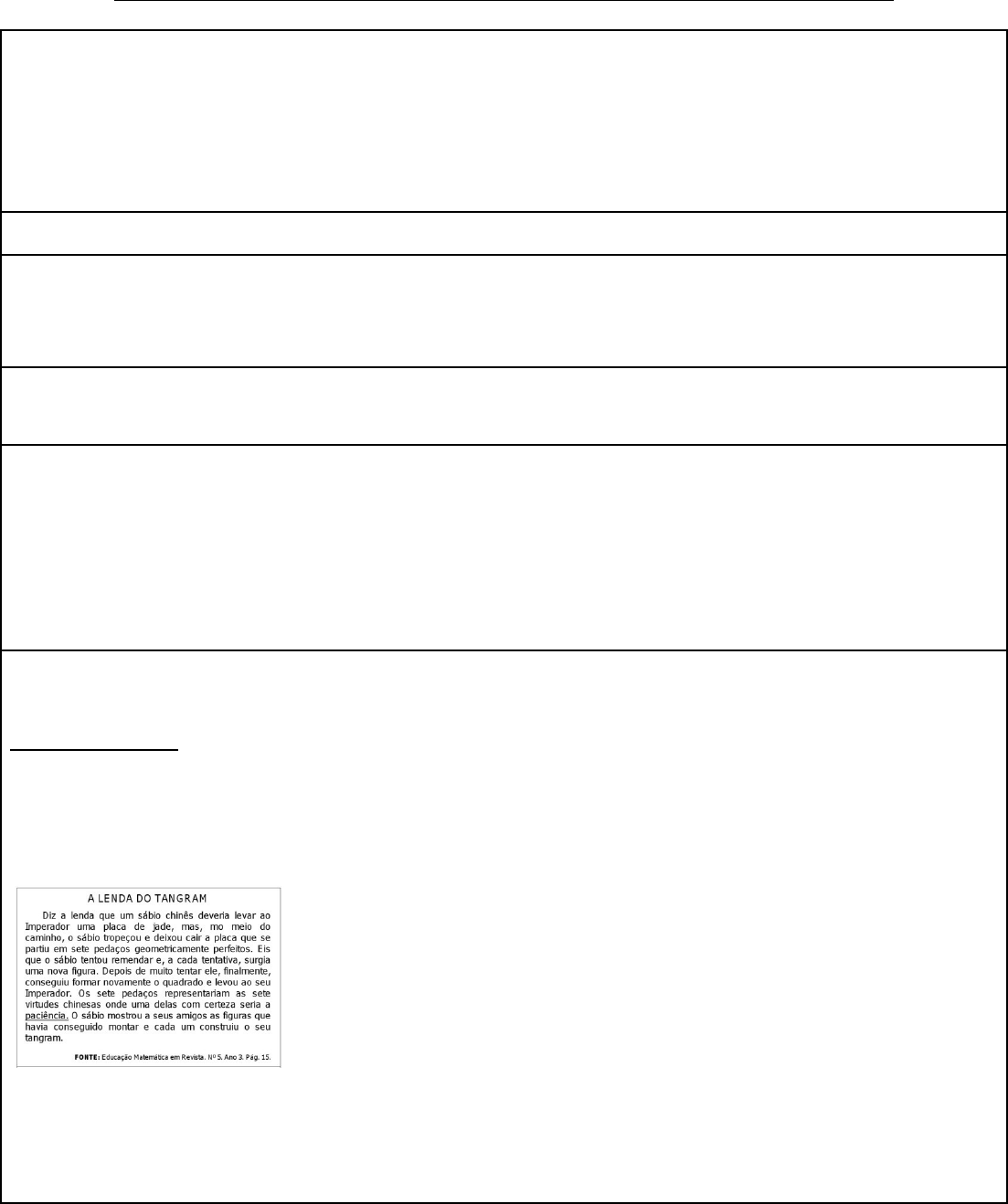 <p>PLANO DE TRABALHO DOCENTE PARA UM COMPONENTE CURRICULAR</p><p>DADOS DE IDENTIFICAÇÃO</p><p>NOME DA UNIDADE EDUCACIONAL: Professora Elvira Pilotto Carrano</p><p>NOME DO PROFESSOR (a): ANA CÉLIA PISKE, MARIA ROSEANE, GRACIELE,</p><p>ANO/SÉRIE: 4º TURMA: B DURAÇÃO/PERÍODO: 05/08 À 16/08</p><p>Componente Curricular: MATEMÁTICA</p><p>UNIDADE TEMÁTICA: Geometria</p><p>OBJETOS DE CONHECIMENTO CENTRAL: Representações geométricas</p><p>OBJETOS DE CONHECIMENTO PERIFÉRICO: Geometria plana; Noções de ângulos retos e não retos; simetria de reflexão.</p><p>OBJETIVOS DE APRENDIZAGEM (O QUE E PARA QUE):</p><p>· Reconhecer ângulos retos e não retos em figuras poligonais com uso de dobraduras, esquadros ou softwares de geometria, relacionando os ângulos aos vértices do polígono: (EF04MA18/SJP)</p><p>· Reconhecer a simetria de reflexão em figuras e em pares de figuras geométricas planas e utilizá-las na construção de figuras congruentes, com o uso de malha quadriculadas e de software de geometria, entendendo a reflexão como uma transformação geométrica. (EF04MA19/SJP)</p><p>ENCAMINHAMENTOS METODOLÓGICOS E AVALIATIVOS:</p><p>Aula 1 e 2 - 06/08</p><p>Noções de ângulos retos e não retos: uso de dobraduras, esquadros e softwares</p><p>A lenda do Tangram.</p><p>Após conhecer a lenda do tangram vamos montar o nosso. Entregar para cada estudante um tangram e pedir que pintem cada peça de uma cor. Recortar e montar uma imagem de acordo com os modelos no caderno.</p><p>1 – Quantas peças tem o Tangram?</p><p>2 – Quais são as peças que formam o tangram?</p><p>a) 4 triângulos, 1 quadrado e 2 paralelogramos.</p><p>b) 4 triângulos, 2 quadrados e 1 paralelogramo.</p><p>c) 3 triângulos, 2 quadrados e 2 paralelogramos.</p><p>d) 5 triângulos, 1 quadrado e 1 paralelogramo.</p><p>3 - Monte uma das imagens e cole no caderno.</p><p>(colar o anexo no quadro para que os estudantes possam observar)</p><p>( atividade avaliativa - valor 0,5)</p><p>Aula 3 08/08</p><p>Iniciar a aula fazendo as perguntas quanto ao conhecimento que eles têm sobre ângulos. Explore a sala de aula, as janelas, os cantos dos quadros, das carteiras ... Brinque com a abertura da porta, mostrando que pode ter abertura maior ou menor. Neste primeiro momento, o importante é que eles percebam que as aberturas dos ângulos são diferentes. Não é necessário apresentar o nome deles.</p><p>Relembrar a aula anterior sobre o Tangram, em que podemos encontrar ângulos.</p><p>Após essa apresentação passar no caderno:</p><p>Tipos de Ângulos</p><p>Conforme as suas medidas, os ângulos são classificados em agudo, reto, obtuso e raso.</p><p>Agudo</p><p>O ângulo agudo mede menos do que 90º ( < 90º).</p><p>Reto</p><p>O ângulo reto mede o mesmo que 90º ( = 90º).</p><p>Aula 4 e 5 - 09/08</p><p>Atividades sobre os ângulos no livro didático: Página 202 à 204</p><p>Após passar a página 209, 210 e 211 - sobre posições de retas.</p><p>(copiar no caderno os 3 conceitos de posições relativas entre retas na página 209)</p><p>Discutir oralmente com a turma:</p><p>Vocês conseguem apontar pelo menos cinco objetos presentes em nossa sala de aula, em que encontramos retas paralelas?</p><p>E retas perpendiculares? Onde as encontramos em nossa sala?</p><p>Aula 6 e 7 - 13/08</p><p>Iniciar mostrando aos estudantes os diferentes sólidos geométricos. (material manipulável)</p><p>Mostrar as faces, vértices e arestas.</p><p>Após apresentar e manipular os materiais, usar o livro didático: página 213 à 218</p><p>Aula 8 15/08-</p><p>Retomando a aula sobre os sólidos geométricos, colar o conceito no caderno, e resolver com os estudantes a atividade:</p><p>Atividade 1:</p><p>Marque um x na representação plana correta:</p><p>Aula 9 e 10 16/08-</p><p>Simetria de reflexão</p><p>Simetria é tudo aquilo que pode ser divido em partes, de forma que as partes coincidam perfeitamente quando sobrepostas. Simetria e assimetria são conceitos contrários, ou seja, ou uma figura é simétrica ou é assimétrica. Para verificar se uma figura é simétrica ou assimétrica, traçamos uma reta, dividindo-a. Caso ela seja formada de duas formas que se coincidam perfeitamente quando sobrepostas, então essa figura é simétrica, e a reta é conhecida como eixo de simetria; caso contrário, a figura será assimétrica.</p><p>Atividade no livro didático: Páginas 225 à 228</p><p>Para finalizar, fazer a atividade de simetria. (valor 0,5)</p><p>CRITÉRIOS AVALIATIVOS: Reconhece em figuras geométricas planas, ângulos retos e não retos e identifica simetria de reflexão em pares de figuras.</p><p>RECURSOS: cópias das atividades</p><p>REFERÊNCIAS:</p><p>Secretaria Municipal de Educação. São José dos Pinhais;</p><p>Referencial Curricular de São José dos Pinhais, 2019.</p><p>OBS:</p><p>ASSINATURA PROFESSORAꓽ</p><p>ASSINATURA PEDAGOGAꓽ</p><p>image4.jpeg</p><p>image5.jpeg</p><p>image6.jpeg</p><p>image7.jpeg</p><p>image8.jpeg</p><p>image1.jpeg</p><p>image2.jpeg</p><p>image3.jpeg</p>