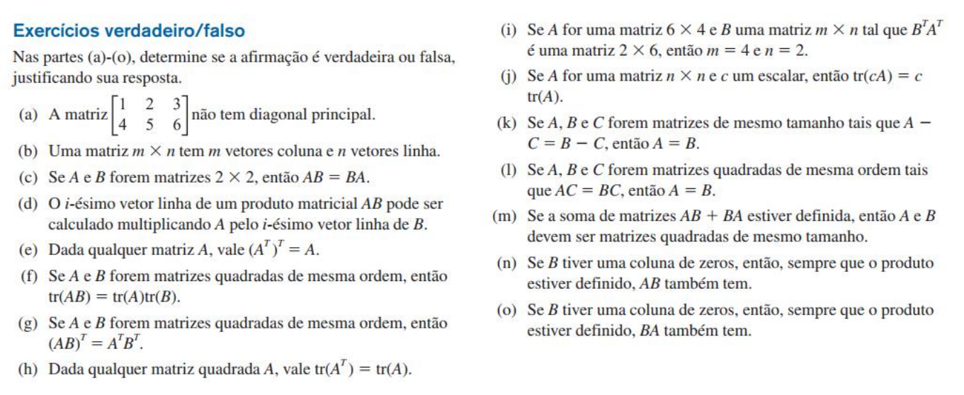 <p>Exercícios verdadeiro/falso (i) Se A for uma matriz B uma matriz m X n tal que Nas partes (a)-(o), determine se a afirmação é verdadeira ou falsa, é uma matriz 2 X 6, então m = 4en=2 justificando sua resposta. (j) Se A for uma matriz n X um escalar, então tr(cA) = C tr(A). (a) A matriz não tem diagonal principal. 456 (k) Se A, B e C forem matrizes de mesmo tamanho tais que A C = B - C, então (b) Uma matriz m X n tem m vetores coluna e n vetores linha. (c) Se A e B forem matrizes 2 X 2, então AB = BA. (1) Se A, B e C forem matrizes quadradas de mesma ordem tais que AC = BC, então A = B. (d) i-ésimo vetor linha de um produto matricial AB pode ser (m) Se a soma de matrizes AB + BA estiver definida, então A e B calculado multiplicando A pelo i-ésimo vetor linha de B. devem ser matrizes quadradas de mesmo tamanho. (e) Dada qualquer matriz A, vale (n) Se B tiver uma coluna de zeros, então, sempre que o produto (f) Se A e B forem matrizes quadradas de mesma ordem, então estiver definido, AB também tem. = (o) Se B tiver uma coluna de zeros, então, sempre que o produto (g) Se A e B forem matrizes quadradas de mesma ordem, então estiver definido, BA também tem. = (h) Dada qualquer matriz quadrada A, vale =</p>