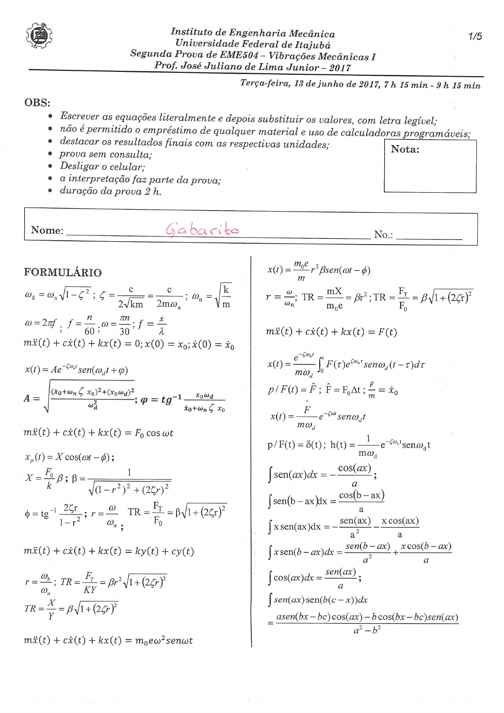<p>Instituto de Engenharia Mecânica 1/5 Universidade Federal de Itajubá Segunda Prova de EME504 - Vibrações Mecânicas I Prof. José Juliano de Lima Junior - 2017 Terça-feira, 13 de junho de 2017, 7 h 15 - 15 min OBS: Escrever as equações literalmente e depois substituir os valores, com letra legível; não é permitido o empréstimo de qualquer material e uso de calculadoras programáveis; destacar os resultados finais com as respectivas unidades; Nota: prova sem consulta; Desligar o celular; a interpretação faz parte da prova; duração da prova 2 h. Nome: No.: FORMULÁRIO = A = + cx(t) + kx(t) = cos wt 1 a = a ; = = senwt</p><p>-> 2,0 Instituto de Engenharia Mecânica -> : 2/5 Universidade Federal de Itajubá Segunda Prova de EME504 - Vibrações Mecânicas Prof. José Juliano de Lima Junior - 2016 Terça-feira, 13 de junho de 2017, 7h 15 min- 9 h 15 min Um automóvel que pesa 454 kgf vazio e 1.361 kgf totalmente carregado vibra em sentido vertical quando desenvolve uma velocidade de 90 km/h em uma estrada acidentada que tem uma forma de onda senoidal com amplitude Y mm e período (comprimento) 3,6 m. Supondo que o automóvel pode ser modelado como um sistema de um grau de liberdade com rigidez 45.000 kgf/m e fator de amortecimento 0,2, determine a amplitude de vibração do automóvel quando: [1,5] a) está vazio; [1,5] b) totalmente carregado. (Rao, Ed, Port. 3.50/136) i) Dados (N) de 43,63 454 - 1.361 43,63 5=2,42 18,0 de Ymm T=3,6 45.000 kgf Y 0,2 Freg. de 1+ (2x0,2x1,40) h X m/s - 6,94 = Natural Y de = 0,277 F=kx logo P= 1.361 =</p><p>Instituto de Engenharia Mecânica 3/5 Universidade Federal de Itajubá Segunda Prova de EME504 - Vibrações Mecânicas Prof. José Juliano de Lima Junior - 2016 Terça-feira, 13 de junho de 2017, 7h 15 min- 15 min [3,0] Quando um exaustor de 380 kg de massa está apoiado sobre molas com amortecimento desprezível, constata-se que a deflexão estática resultante é de 45 mm. Se o exaustor tiver um desbalanceamento rotativo de 0,15 kgm, determine: [1,5] a) a amplitude de vibração a 1.750 rpm; [1,5] b) a força transmitida ao solo a essa velocidade. (Rao, Ed, Port. 3.53/136) i) Dades M= rpm Ss=45 mm moe = = m all ii) Natural ri) Forga Da estatica, m mg=ks, Ss = 14,76 A force transmitick devide a 45x10-3 iii) de Excitacas = 1.750 = 183,26 = mg 380x9,82 30 (N) de N/m = 183,26 (=12,41 14,76 FT= Amplitude de Moviments FT = 32,91 N rosp b = 3=0 B= 1 = 1 2</p><p>=0 TR=0,5 Instituto de Engenharia Mecânica 015 4/5 Universidade Federal de Itajubá Segunda Prova de EME504 - Vibrações Mecânicas Prof. José Juliano de Lima Junior - 2016 Terça-feira, 13 de junho de 2017, 15 min- 9 h 15 min [2,0] 3) O trem de aterrissagem de um avião pode ser idealizado como o sistema massa-mola- amortecedor mostrado na figura. Se a superfície da pista for descrita por y(t)=Y cos wt, determine os valores de kec que limitam a amplitude de vibração do avião (X) a 0,1 m. Suponha m = 2.000 kg, Y = = 157,08 rad/s. (Rao, Ed, Port. 3.35/134) iii) Natural = 5 = 3 = 52,36 Carcaça com escora e amortecimento = = 52,362 (a) Massa do avião, m Roda X = 1 0,2 m yin Pista 2 Figura - Trema de aterissagem. i) Dados 1+3652 X=91 m kg Y=0,2 157,08 de c=25ykm Pare que C = 156.031,0 NS m</p><p>Instituto de Engenharia Mecânica 5/5 Universidade Federal de Itajubá Segunda Prova de EME504 - Vibrações Mecânicas Prof. José Juliano de Lima Junior - 2016 Terça-feira, 13 de junho de 2017, 15 min- 9 h 15 min A asa de uma aeronave de combate que carrega um míssil em sua como mostra a figura, pode ser aproximada como uma viga em balanço equivalente com = 15x109 N/m2 em relação ao eixo vertical e comprimento L = 10 m. Se a massa equivalente da asa, incluindo a massa do míssil e de seu sistema de suporte, na extremidade da asa for m = 2.500 kg, determine a resposta de vibração da asa (de m) resultante do lançamento do míssil. Considere que a força sobre m resultante do lançamento do míssil pode ser aproximada como uma função impulso de magnitude 50 N.s. Dado, k=3EI/L3. (Rao, Ed., Port. 4.38/174) A - F e mwd Eixo de flexão Figura - Aeronave. i) F N/m2 m 50 = 2.500 kg 2.500x 134,16 50 ii) -6 (m EI M m Asa missil. iii) = = L3 Natural = 45x10 = 134,16</p>