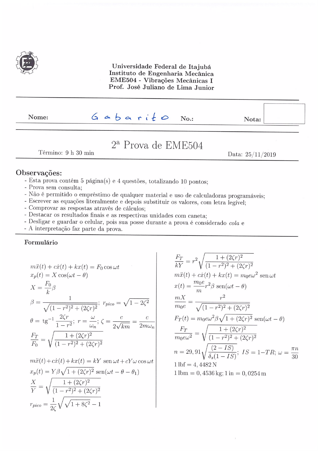 <p>Universidade Federal de Itajubá Instituto de Engenharia Mecânica EME504 - Vibrações Mecânicas I Prof. José Juliano de Lima Junior Nome: Gabarito No.: Nota: Prova de EME504 Término: 9 h 30 min Data: 25/11/2019 Observações: - Esta prova contém 5 página(s) e 4 questões, totalizando 10 pontos; - Prova sem consulta; - Não é permitido o empréstimo de qualquer material e uso de calculadoras programáveis: - Escrever as equações literalmente e depois substituir os valores, com letra legível; - Comprovar as respostas através de cálculos; - Destacar os resultados finais e as respectivas unidades com caneta; - Desligar e guardar o celular, pois sua posse durante a prova é considerado cola e - A interpretação faz parte da prova. Formulário kY = senwt 1 = = = moe C C = FT = 30 = 1 = 0,45361 kg; 1 in = 0, 0254 m = - 1</p><p>Prova de EME504 Pag. 2 de 5 1. Consider a machine of mass 70 kg mounted to ground through an isolation system of total stiffness 30,000 N/m, with a measured damping ratio of 0.2. The machine produces a harmonie force of 450 N at 13 rad/s during steady-state operating conditions. Determine: (5.11/454, Inman, 3rd, 2008): (a) (0.5 pontos) the amplitude of motion of the machine; (b) (0.5 pontos) the phase shift of the motion (with respect to a zero phase exciting force); (c) (0.5 pontos) the maximum dynamic force transmitted to the floor, and (d) (0.5 pontos) the maximum velocity of the machine. i) Dades B=1,525 m=70kg NC) do N J=012 = Fo B 450 x 1,525 30.000 N N 0,023m us 13 rad Nil) Fase entre F(E). m rad max T iii) Frequencia natural Razas de frequincias 0,3668 0,0631 = 13 r=0,628 wn 20170 Fator de 1 Boa Prova! 25/11/2019</p><p>ix) X sen A XIE) = logs 13x0,023 m</p><p>Prova de EME504 Pag. 3 de 5 2. (3 pontos) A large industrial exhaust fan is mounted on a steel frame in a factory. The plant manager has decided to mount a storage bin on the platform. Adding mass to a system can change its dynamics substantially and the plant manager wants to know if this is a safe change to make. The original design of the fan support system is not available. Hence measurements of the floor amplitude (horizontal motion) are made at several different motor speeds in an attempt to measure the system dynamics. No resonance is observed in running the fan from zero to 500 rpm. Deflection measurements are made and it is found that the amplitude is 10 mm at 500 rpm and 4.5 mm at 400 rpm. The mass of the fan is 50 kg, and the plant manager would like to store up to 50 kg on the same platform. The best operating speed for the exhaust fan is between 400 and 500 rpm depending on environmental conditions in the plant. (5.15/455, Inman, 3rd, 2008). i) Dados 10 = X = 10 mm pln= = 500 rpm 1- pln 400 m= 50 kg 30 ma = - wi= 52, 36 red J=0 - 400 500 rpm ii) Modelo Moviment base 4,3 = 2 m 30 k Y= BASE 1 (ii) natural 2 2 2 + 4,5 = rpm Boa Prova! k 25/11/2019 rpm</p><p>- 5.5 + 19.519,22 = 5,5 = red (N) Rigidaz dc frequencia natural = m a pado ser messe = = = 100 kg k my 100 = 42,12 em = 30 conclused na faixa 400 a 500 este</p><p>Prova de EME504 Pag. 4 de 5 3. (2 pontos) Um automóvel é modelado como um sistema com um grau de liberdade que vibra no sentido vertical e está percorrendo uma estrada na qual a variação da elevação é senoidal. A distância entre pico e vale é 0,2 m e a distância entre picos ao longo da estrada é 35 m. Se a frequência natural do automóvel for 2 fator de amortecimento dos amortecedores de choque for 0,15, determine a amplitude de vibração do automóvel a uma velocidade de 60 km/hora. Se a velocidade do automóvel variar, determine a velocidade menos desfavorável para os passageiros. (3.44/135, Rao, 4th, 2008). mais i) Dados 2Y=0,2m w= = rad 35 5 = X X IN r= f 2 ii) Models m + t X m 0,2m 35 m Velocidade iii) Frequencia ocome Logo = = 2x0,15 0,979 N= 60 km km h = f m 5 Boa Prova! errou 25/11/2019 012 Y</p><p>Prova de EME504 Pag. 5 de 5 4. Constatou-se que um exaustor que tem 80 kg de massa e funciona à velocidade de 1.000 rpm produz uma força repetitiva de 10.000 N sobre sua base rígida. Se a máxima força transmitida à base tiver de ser limitada a 2.000 N com a utilização de um isolador não amortecido, determine (9.33/340, Rao, 4th, 2008): (a) (1 ponto) a máxima rigidez permissível do isolador que cumpra essa finalidade; (b) (1 ponto) a amplitude de regime permanente do exaustor com isolador que tenha a máxima rigidez permissível; (c) (1 ponto) a amplitude máxima do exaustor com isolamento durante a partida. i) = m=80kg n=1.000 rpm = 4 = ic) 3016 Per m N KT Amplitude FT = Fo = 146.216,4 x m 110 varia partide 1,0 V2 (ii) 5=1 = resp. FT Boa Prova! 25/11/2019</p>