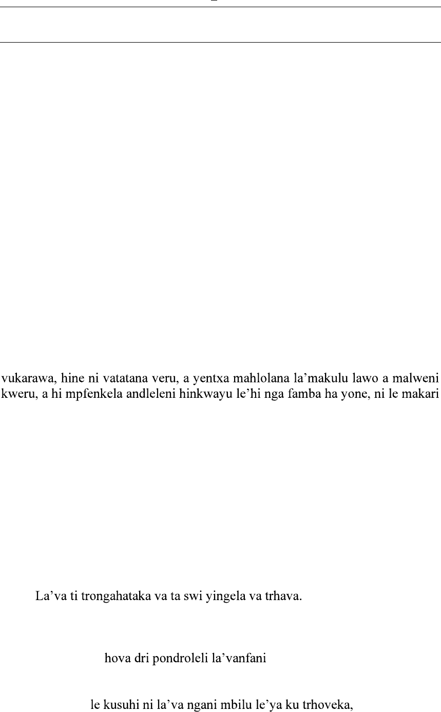 <p>436 TEMPO COMUM DOMINGO XXI</p><p>ANO B</p><p>Primeira Leitura: Jos 24, 1-2a.15-17.18b</p><p>Introdução:</p><p>Va tlhasi a tikweni ledri faka va dumbisiwi drone, na ve kari va byisiwa ha</p><p>Yehoxua. A vana va Yisrael va ti bekela a xifungu xa ku dumba a Xikwembu xa</p><p>vu ni ku pfuxeta a xipfumelelwanu xa le nhaveni ya Sinai: Hi ku drimuka leswi a</p><p>Hosi yi va pfunisiki xiswone, va funga a ku yi tirela.</p><p>Dondro ya Buku dra Yehoxua:</p><p>Yehoxua a ku hlengeleta a tinxaka ta Yisrael hinkwatu a xekem a vitana ni</p><p>vakulu va Yisrael ni venyi va mindangu ya vu, ni vatremi va vu ni tindruna ta</p><p>vu; va ti humelelisa mahlweni ka Xikwembu Nkulukumba. Yehoxua a ku ku</p><p>vhanu hinkwavu: Loko nha swi bihile ku nwine aku tirela Yehova, namunhla ti</p><p>langelani lwe nwi ta ka tirela yene, kumbe swikwembu leswi a vatatana venu va</p><p>nga swi tirela, leswi a faka swi halahaya ka Nambu, kumbe swikwembu swa va-</p><p>Amori, lava nwi trhamiki a tikweni dra vu; loko ali mine ni yindlu yanga hi ta</p><p>tirela Yehova. Avhanu va yangula va ku: A swi ve kule na hine a ku trika</p><p>Yehova, hi ya tirela swikwembu swimbeni. Hikuva Yehova, Xikwembu</p><p>Nkulukumba weru, hi yene a nga hi humexa tikweni dra le Egipta, andlwini ya</p><p>ka matiku hinkwawu lawa hi nga khaluta ku wone. Na hine hi ta tirela Yehova;</p><p>hikusa hi ye Xikwembu Nkulukumba weru.</p><p>Ritu dra Hosi!</p><p>Psalma: 33(34), 2-3.16-17. 18-19. 20-21. 22-23</p><p>Ntekelelo: Nampswani nwi vona leswaku Yehova i munene.</p><p>Ndri ta khensa Yehova hi minkama hinkwayu.</p><p>Axidrumisu xa kwe xi ta va nonwini wa nga hi masiku</p><p>Ahika dra nga dri ta twalisa ha Yehova</p><p>Amahlu ya Yehova ma lavisa valulami,</p><p>Atindleve ta kwe ti pfulekeli ku huwelela kwavu</p><p>Aliso dra Ye</p><p>Aku susa ku yanakanyiwa kwa vu misaveni.</p><p>Yehova a</p><p>TEMPO COMUM DOMINGO XXI 437</p><p>Amakhombo ya mululami i manyingi,</p><p>Kambe Yehova a mutirula ku wone hinkwawu.</p><p>A bekisa marambu ya kwe hinkwawu,</p><p>Yehova a tirula amahika ya malandra ya kwe</p><p>Segunda Leitura: Ef 5, 21-32</p><p>Introdução:</p><p>A ntlhanganu wa nuna ni nsati wu fanekela ku va xikombiso xa ntlhanganu wa</p><p>Yesu ni Kereke dra kwe. Akuva swi tava tanu ku djuleka avatekani va tiva a ku ti</p><p>beka hansi hi vubidri bya vu, hi vuntanga bya tinfanelo, amahlweni ya Kriste.</p><p>Amatrhamela lawa, ma va byisa hi vubidri na munwana ni munwana, a</p><p>Dondro ya Papela dra S. Paulo ku va-le-Efesa:</p><p>Vamakweru: Titrongahatani vanwe a hansi ka vanwana aku txhaveni ka Kriste.</p><p>Vavasati, yingisetani ntshima ya vanuna venu, swanga hi loko nwi yingiseta</p><p>Hosi. Hikuva a nuna i nhloko ya nsati, swanga ha Kriste a nga nhloko ya</p><p>miri; kambe swanga hi leswi Kereke dri</p><p>yingisetaka Kriste, hi swoswo na vo vavasati a va yingiseti vanuna va vu</p><p>atimhakeni hinkwatu. Vavanuna, randrani vasati venu, swanga hi leswi Kriste na</p><p>yene a nga randra Kereke, a va a tinyikela drone, akuva a dri xwengisa a dri</p><p>basisiki a ku nhlampsweni ka mati hi ritu, akuva a ti humexela drone dri va</p><p>xisandru. Hi leswo-ke avavanuna va fanekelaka ku randra vasati va vu, swanga</p><p>hi miri y</p><p>swanga ha Kriste a yentxelaka Kereke, hikuva hi swiru swa miri ya kwe. Hikola</p><p>ka leswo, amhunu a ta sukela tatana wa kwe ni mamana wa kwe, a namarela ku</p><p>nsati, vava nyama yinwe hi vubidri bya vu. Axihundla lexi i xikulu; ndri hlaya</p><p>xa Kriste ni Kereke.</p><p>Ritu dra Hosi!</p><p>438 TEMPO COMUM DOMINGO XXI</p><p>Ta ku Drumisa Ivangeli: (cf. Jo 6,63c.68c)</p><p>Aleluya! Aleluya!</p><p>Amaritu ya ku Hosi, i moya ni vutomi;</p><p>Evangelho: João 6, 60-69</p><p>Introdução:</p><p>A maritu ya Yesu hi tlhelo dra kati dra vutomi laha o ko va yene ha bya kwe, ma</p><p>sindrisa a ku pfumela ku yene. Xihlayelamfuri xa ku karata a ku xi twisisa, mfuri</p><p>xi yaliwaka hi va-Yuda. A vutlhari bya vumhunu ha bya swone, byi nga ka byi</p><p>nga twisisi a xihundla xa xilalelo xa Hosi. Tatana o va yene ntsena, lwe a</p><p>Ivangeli ya Yesu Kriste Abukwini dra Yohan:</p><p>va hlaya kolahu va ku: Aritu ledri dra</p><p>kwa kwe leswaku a vadondrisiwa va kwe va nununuta hikola ka swone, a ku ku</p><p>vone: Amhaka leyi ya nwi khunguvanyisa xana? Nwi ta ku yini kê, loko nwi ta</p><p>hlalela Nwana wa Mhunu loko a ntlhantukela lomu faka e kone khale. Amoya hi</p><p>byeliki wone, hi moya ni vu</p><p>pfumelikiki. Hikusa Yesu</p><p>hlaya a ku: Hi laha ndri nwi byeliki leswaku amhunu a nga swikoti ku ta ku</p><p>ngi ku vadondrisiwa va</p><p>kwe va tlhela ntrhaku, va nga ha fambi na yene. Hi leswo-</p><p>khume na vabidri a ku ku vone: Xana a nwi randri ku suka, na nwine xana?</p><p>Simon Petros a mu yangula a ku: Hosi, hi ta suka hi ya ku mani? U na ni maritu</p><p>ya</p><p>Muxwengi wa Xikwembu Nkulukumba.</p><p>Ritu dra Huluxu!</p><p>ANO C</p><p>Primeira leitura: Is 66, 18-21</p><p>Introdução:</p><p>Xikwembu Nkulukumba a hlengeleti matiko hinkwawu hi indrimi hinkwatu</p><p>akuva ti ta um twalsa. I swa lisima swinene akuva amintiro yeru siku drinwana</p><p>ni drinwana hi minyiketa Hosini akuva mi ta mu twalisa.</p>