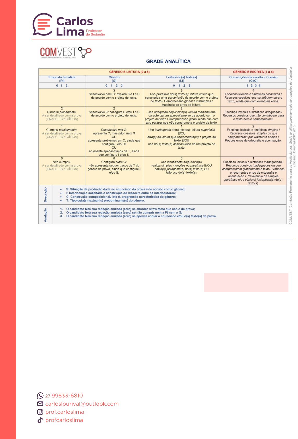 <p>MATRIZ DE REFERÊNCIA PARA REDAÇÃO</p><p>DETALHAMENTO POR COMPETÊNCIA (UNICAMP)</p><p>FONTE: https://www.comvest.unicamp.br/vestibular-2021/grade-da-redacao/</p><p>NOTA: ________________/12</p><p>https://www.comvest.unicamp.br/vestibular-2021/grade-da-redacao/</p><p>MATRIZ DE REFERÊNCIA PARA REDAÇÃO</p><p>DETALHAMENTO POR COMPETÊNCIA (UNICAMP)</p><p>1</p><p>2</p><p>3</p><p>4</p><p>5</p><p>6</p><p>7</p><p>8</p><p>9</p><p>10</p><p>11</p><p>12</p><p>13</p><p>14</p><p>15</p><p>16</p><p>17</p><p>18</p><p>19</p><p>20</p><p>21</p><p>22</p><p>PT G LT CeC TOTAL</p><p>0 1 2 0 1 2 3 0 1 2 3 0 1 2 3 4 /12</p>