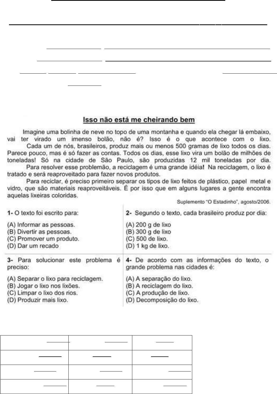 <p>ESCOLA MUNICIPAL PROFESSOR JOSÉ CARLOS MALDI</p><p>AVALIAÇÃO MENSAL REGULAR – LÍNGUA PORTUGUESA - 4º ANO B – 3º BIMESTRE</p><p>PROFESSORA: _ _</p><p>ALUNIO (A): _ _</p><p>DATA: / / TURMA:</p><p>VALOR: (30 PONTOS): __ BOA PROVA!!!</p><p>1 – Leia o texto e responda as perguntas. ( 8 P)</p><p>2 – Complete as palavras com E ou I no final. (2 P)</p><p>EXPERIMENT</p><p>CONTENT</p><p>GILET _</p><p>PARAGUA</p><p>JAVAL _</p><p>AÇA _</p><p>ALFAIAT</p><p>ABACAT</p><p>BEM-TE-V</p><p>ENGASGUE</p><p>ENFEIT _</p><p>CASEBR</p><p>3 – Ordene as palavras e forme as frases. (4 P)</p><p>3 – Complete as frases com as palavras adequadas. (5 P)</p><p>5 – Leia as palavras, acrescente a letra R e forme outra palavra. Siga o exemplo abaixo. (3 P)</p><p>6 – Complete com os pronomes pessoais do caso reto. (3 P)</p><p>a) 1ª pessoa singular _. d) 1ª pessoa do plural _</p><p>_</p><p>b) 2ª pessoa do singular: _. e) 2ª pessoa do plural _</p><p>c) 3ª pessoa do singular: _ _ . f) 3ª pessoa do plural _ _.</p><p>7 – Complete as frases com os pronomes pessoais do caso reto, com os pronomes demonstrativos e pocessivos, do quadro abaixo. (7 P)</p><p>(</p><p>Seu – meu – esta – tu – eu - aquela – este – esse – aquele – isto – minha -</p><p>nós</p><p>nossas</p><p>-</p><p>elas</p><p>)</p><p>a) mochila é e outra é sua.</p><p>b) menino roubou o cachorro da vovó.</p><p>c) Garota, não se faz.</p><p>d) ano vou viajar para a praia.</p><p>e) Comprei uma bicicleta do amigo.</p><p>f) _ homem aqui é o pai?</p><p>g) Po causa da chuva _ brincadeiras foram adiadas.</p><p>h) Agora sou que não quer mais brincar.</p><p>i) Quem pensas que és para falar assim comigo?</p><p>j) _ faremos uma festa surpresa para .</p><p>8 – Complete as frases com os verbos entre parênteses, nos tempos pedidos. (5 P)</p><p>a) Nós _ dos nossos pais. (gostar - presente)</p><p>b) Eu com você amanhã. (viajar – futuro)</p><p>c) Elas na quadra onte. (brincar – passado)</p><p>d) Amanhã, eles uma peça de teatro. (apresentar – futuro)</p><p>e) João _ de ajuda para estudar. (precisar – presente)</p><p>9 – Preencha a cruzadinha com os encontros consonantais. (3 P)</p><p>image6.png</p><p>image7.jpeg</p><p>image1.jpeg</p><p>image2.jpeg</p><p>image3.jpeg</p><p>image4.jpeg</p><p>image5.jpeg</p>