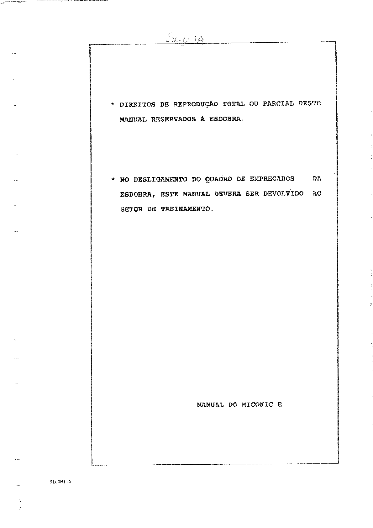 <p>* DIREITOS DE REPRODUÇÃO TOTAL OU PARCIAL DESTE MANUAL RESERVADOS À ESDOBRA. NO DESLIGAMENTO DO QUADRO DE EMPREGADOS DA ESDOBRA, ESTE MANUAL DEVERÁ SER DEVOLVIDO AO SETOR DE TREINAMENTO. MANUAL DO MICONIC E MICONIT4</p><p>ESDOBRA TREINAMENTO Grupo T.4. P 1.11.000 MANUAL DO MICONIC E Pag. Modif. 9209 1/104 CÓDIGO TÍTULO PÁGINA ESPECÍFICO 0 Índice 1.11.000 1 2 1 - Introdução 1.11.200 3 2 - Conhecimentos Básicos de Eletrônica 4 2.1 -Economia no consumo de energia 4 2.2 -Diodo e transistor 5 7 2.3 -Condições de um com- ponente eletrônico 8 2.4 -Comandos eletrônicos: Funções lógicas 9 - 18 T.4. 2.5 -Transistor como chave 19 21 2.6 -Medições em circuitos eletrônicos 22 23 2.7 -Sistemas numéricos 24 2.7.1- Sistema Decimal 24 2.7.2- Sistema Binário 24 - 27 2.7.3- Sistema Hexade- cimal 28 - 31 Código Gray 32 2.8 -Cuidados com os compo- nentes eletrônicos 33 36 2.9 -Transferência múltipla de sinais Multiplex 37 - 38 2.10-Comportamento dos sis- temas de microproces sadores 40 1.11.200</p><p>ESDOBRA TREINAMENTO Grupo T.4. P 1.11.000 MANUAL DO MICONIC E Pag. Modif 9209 2/104 CÓDIGO TÍTULO PÁGINA ESPECÍFICO 3 - Definição do Miconic E e suas aplicações 41 - 43 1.11.200 4 - Quadro de Comando 44 4.1 -Tipos de quadro de comando 44 4.2 e adi- cionais do comando 45 - 55 4.3 -Componentes do quadro de comando 56 70 1.11.200 T.4. 5 - Instalação Elétrica 71 1.11.200 6 - Informações de Poço e suas Funções 72 - 78 1.11.200 7 Instruções para Regulagem 79 104 1.11.200 8 Anexos : 8.1- Esquema de Princípio e Instalação S049000 (versão reduzida) 8.2- Esquema de Princípio e Instalação S049003 (versão completa) Elaborado por : Celso Velloso de Oliveira Miguel Gómez Organizado por : Marcia de La Rocque Almeida Digitado por : Katia Maria de Medeiros Cavalcanti</p><p>ESDOBRA TREINAMENTO Grupo T.4. P 1.11.200 MANUAL DO MICONIC E Modif. 9209 3/104 1 INTRODUÇÃO uso de microprocessador tem obtido um excelente resultado em comando para elevadores. Os antigos comandos a relés (Relematic) e transistorizados (Aconic) da Schindler estão superados perante a esta tecnologia. A Schindler fabrica na atualidade vários comandos a base de microprocessadores, sendo que Miconic-E é destinado a elevadores de média sofisticação. A evolução dos comandos para elevadores é apresentada a seguir: Comando a relés (Relematic) (Schindler 1900) --- volumoso velocidade de comutação baixa Comando eletrônico transistorizado (Aconic) (Schindler 1965) (Não existe no Brasil) sem partes móveis dimensões pequenas velocidade de comutação alta Comando eletrônico a microprocessadores (Schindler 1978) (Miconic E /Miconic HS /Miconic B /Miconic V) sem partes móveis dimensões muito pequenas -- velocidade de comutação muito alta programável, flexível Observação: No Brasil são fabricados somente Miconic HS.</p><p>ESDOBRA TREINAMENTO Grupo T.4. P 1.11.200 MANUAL DO MICONIC E Pag. 9209 4/104 2 CONHECIMENTOS BÁSICOS DE ELETRÔNICA 2.1 Economia no consumo de energia cálculo do consumo de energia é: Potência = tensão X corrente (P V X Um relé RA consome aproximadamente 0,075A X 80V = 6W. elemento equivalente usado no comando Miconic consome 1/600.000 do consumo do relé, ou seja: 0,00001W = Entre momento da alimentação de uma bobina de um relé RA e a ligação do contato decorre um tempo de aproximadamente 0,025seg= 25 mseg. Um relé RA pode, neste caso, ligar e desligar 20 vezes durante 1 segundo. tempo de comutação de um elemento eletrôni- CO do comando Miconic necessita de 1/500.000 desse tempo e, por tanto, poderá ligar e desligar 10.000.000 de vezes por segundo. consumo reduzido e a veloz dos sinais tem contudo suas desvantagens. Calculando-se o consumo próprio para garantir a comutação, re- sultado será: para relé RA: 6W X 0,025 seg. 0,150 W/seg. para elemento Miconic = 10 X 0,050 useg. = 0,000.000.000.000.5 W/seg. Este último valor não pode ser medido praticamente. Por este motivo, deve se tomar cuidado na instalação e no manuseio dos prints, como será visto mais tarde.</p><p>ESDOBRA TREINAMENTO Grupo P 1.11.200 MANUAL DO MICONIC E Pag. 9209 5/104 2.2 Diodo e Transistor 2.2.1 - Diodo É um elemento eletrônico semi condutor de grande utilidade e apre- senta as seguintes caracteristicas: Simbologia ANODO CATODO Um terminal do diodo chama-se anodo e outro terminal chama-se catodo. Um diodo sempre conduz do anodo para catodo. Em corrente contínua um diodo conduz quando estiver diretamente polarizado, ou seja, a tensão aplicada ao anodo, tem que ser maior que a do catodo ( diodo de sílicio = Quando ele conduz, no circuito de corrente contínua, funciona como um curto circuito; no entanto quando ele não conduz, funciona como um circuito aberto. Observe no desenho abaixo, um diodo conduzindo e não conduzindo: Conduz (diretamente Não conduz polarizado) polarizado) + + + + R R 5 5V V V= V=OV</p><p>ESDOBRA TREINAMENTO Grupo T.4. P 1.11.200 MANUAL DO MICONIC E Pag. 9209 6/104 Em corrente alternada um diodo funciona como um retificador de meia onda. V VR I R Osciloscópio LED é também um diodo, que quando é diretamente polarizado, emite luz. N 2.2.2 Transistor É um elemento eletrônico semi-condutor também de grande utilidade. transistor tem 3 terminais: base, coletor e emissor. Existem dois tipos de transistores que dependendo da disposição do material utilizado na sua fabricação podem ser NPN ou PNP Negativo e P = Positivo) Estes transistores operam ou conduzem quando são devidamente polarizados, de acordo com seu tipo. Num transistor, a seta de simbologia sempre aponta para lado ne- gativo do transistor. Por exemplo, no caso do NPN, a seta aponta para emissor.</p><p>TREINAMENTO ESDOBRA T.4. P Grupo 1.11.200 MANUAL DO MICONIC E Pag. Modif. 7/104 9209 Observe a simbologia e a maneira de testar os dois tipos de transistores com um ohmímetro. Teste do Transistor NPN N Negativo (coletor) P = Positivo (base) N = Negativo (emissor) + Coletor x Base x N