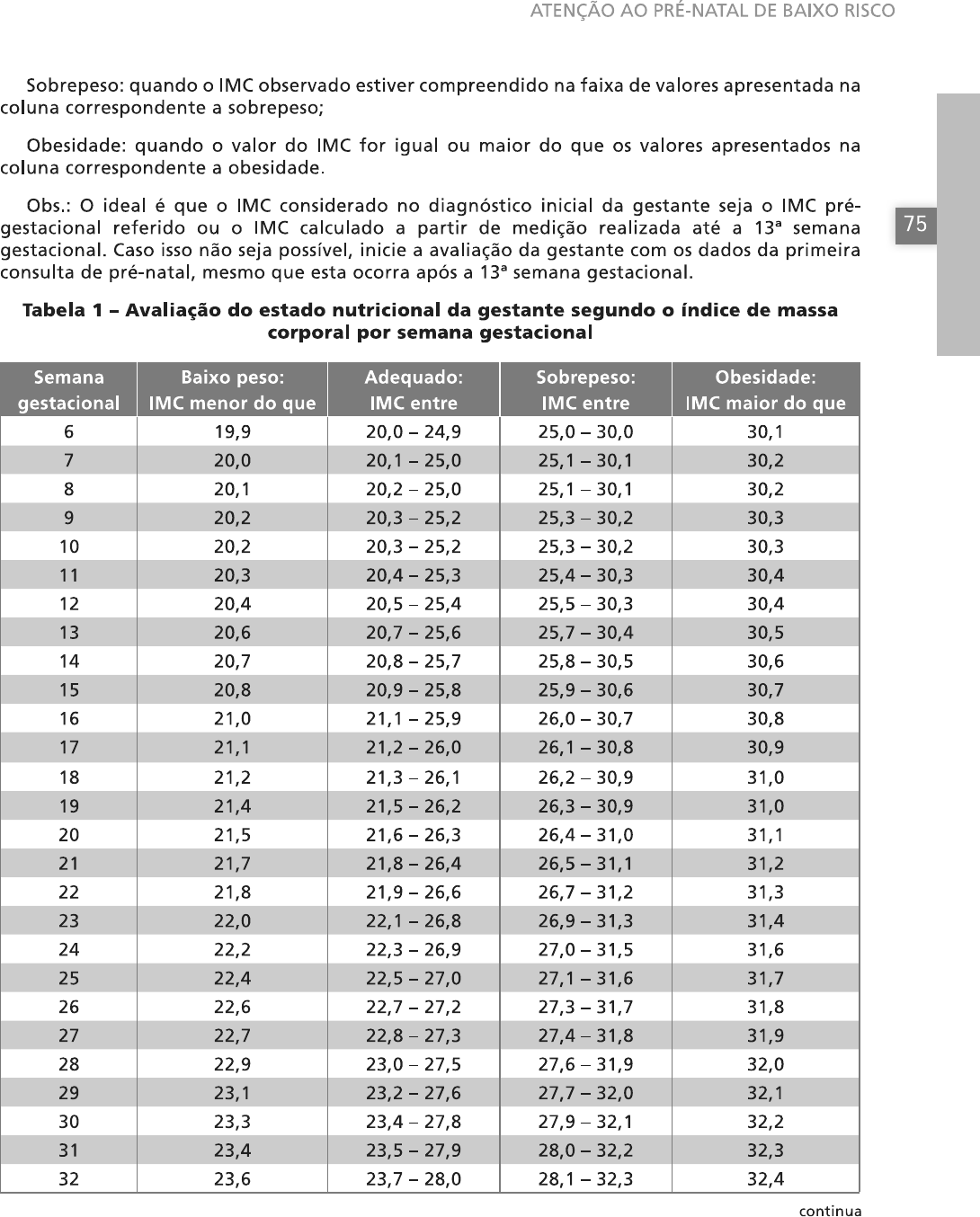 <p>ATENÇÃO AO PRÉ-NATAL DE BAIXO RISCO Sobrepeso: quando o IMC observado estiver compreendido na faixa de valores apresentada na coluna correspondente a sobrepeso; Obesidade: quando o valor do IMC for igual ou maior do que os valores apresentados na coluna correspondente a obesidade. Obs.: ideal é que o IMC considerado no diagnóstico inicial da gestante seja o IMC pré- gestacional referido ou o IMC calculado a partir de medição realizada até a semana 75 gestacional. Caso isso não seja possível, inicie a avaliação da gestante com os dados da primeira consulta de pré-natal, mesmo que esta ocorra após a semana gestacional. Tabela 1 - Avaliação do estado nutricional da gestante segundo o índice de massa corporal por semana gestacional Semana Baixo peso: Adequado: Sobrepeso: Obesidade: gestacional IMC menor do que IMC entre IMC entre IMC maior do que 6 19,9 30,1 7 20,0 20,1 25,0 25,1 30,1 30,2 8 20,1 20,2 25,0 25,1 30,1 30,2 9 20,2 20,3 25,2 25,3 30,2 30,3 10 20,2 20,3 - 25,2 25,3 30,2 30,3 11 20,3 20,4 - 25,3 25,4 30,3 30,4 12 20,4 20,5 25,4 25,5 30,3 30,4 13 20,6 20,7 - 25,6 25,7 30,4 30,5 14 20,7 20,8 25,7 25,8 30,5 30,6 15 20,8 20,9 25,8 25,9 30,6 30,7 16 21,0 21,1 25,9 26,0 30,7 30,8 17 21,1 21,2 26,0 26,1 30,8 30,9 18 21,2 21,3 26,1 26,2 30,9 31,0 19 21,4 21,5 26,2 26,3 30,9 31,0 20 21,5 21,6 26,3 26,4 31,0 31,1 21 21,7 21,8 26,4 26,5 31,1 31,2 22 21,8 21,9 26,6 26,7 31,2 31,3 23 22,0 22,1 26,8 26,9 31,3 31,4 24 22,2 22,3 26,9 27,0 31,5 31,6 25 22,4 22,5 27,0 27,1 31,6 31,7 26 22,6 22,7 27,2 27,3 31,7 31,8 27 22,7 22,8 27,3 27,4 31,8 31,9 28 22,9 23,0 27,5 27,6 31,9 32,0 29 23,1 23,2 27,6 27,7 32,0 32,1 30 23,3 23,4 27,8 27,9 32,1 32,2 31 23,4 23,5 27,9 28,0 32,2 32,3 32 23,6 23,7 28,0 28,1 32,3 32,4 continua</p><p>Ministério da Saúde Secretaria de Atenção à Saúde Departamento de Atenção Básica continuação Semana Baixo peso: Adequado: Sobrepeso: Obesidade: gestacional IMC menor do que IMC entre IMC entre IMC maior do que 33 23,8 23,9 - 28,1 32,5 34 23,9 24,0 28,3 28,4 32,5 32,6 35 24,1 24,2 28,4 28,5 32,6 32,7 76 36 24,2 24,3 28,5 28,6 32,7 32,8 37 24,4 24,5 28,7 28,8 32,8 32,9 38 24,5 24,6 28,8 28,9 - 32,9 33,0 39 24,7 24,8 28,9 29,0 33,0 33,1 40 24,9 25,0 29,1 29,2 - 33,1 33,2 41 25,0 25,1 29,2 29,3 33,2 33,3 42 25,0 25,1 29,2 29,3 - 33,2 33,3 Fonte: (ATALAH et al., 1997, p. 1429-1436). Condutas conforme o diagnóstico nutricional realizado: Baixo peso (BP): investigue a história alimentar, a hiperêmese gravídica, as infecções, as parasitoses, as anemias e as doenças debilitantes. Dê a orientação nutricional, visando à promoção do peso adequado e de hábitos alimentares saudáveis. Remarque a consulta em intervalo menor do que o fixado no calendário habitual. Caso necessário, é interessante discutir caso com os profissionais do Núcleo de Apoio à Saúde da Família (Nasf). Adequado (A): siga o calendário habitual. Explique à gestante que seu peso está adequado para a idade gestacional. Dê-lhe orientação nutricional, visando à manutenção do peso adequado e à promoção de hábitos alimentares saudáveis; Sobrepeso e obesidade (S e O): investigue a obesidade pré-gestacional, casos de edema, polidrâmnio, macrossomia e gravidez múltipla. Dê orientação nutricional à gestante, visando à promoção do peso adequado e de hábitos alimentares saudáveis, ressaltando que, no período gestacional, não se deve perder peso, pois é desejável mantê-lo. Remarque a consulta em intervalo menor do que o fixado no calendário habitual. Caso necessário, é interessante discutir o caso com os profissionais do Nasf. Sabe-se que a obesidade está associada a uma frequência mais alta de distócias, diabetes e hipertensão e a um risco maior de cesariana. Por outro lado, na gestante com baixo peso há um risco maior de parto prematuro. Estimativa do ganho de peso para as gestantes durante a gestação: Em função do estado nutricional pré-gestacional ou no início do pré-natal (tabela 1), estime o ganho de peso total até o fim da gestação (tabela 2). Para cada situação nutricional inicial (baixo peso, adequado, sobrepeso ou obesidade) há uma faixa de ganho de peso recomendada. Para o primeiro trimestre, o ganho foi agrupado para todo o período, enquanto que, para o segundo e o terceiro trimestre, o ganho é previsto por semana. Portanto, já na primeira consulta, deve-se estimar quantos gramas a gestante deverá ganhar no primeiro trimestre, assim como o ganho por semana até o fim da gestação. Esta informação deve ser fornecida à gestante.</p><p>ATENÇÃO AO PRÉ-NATAL DE BAIXO RISCO Tabela 2 Ganho de peso recomendado (em kg) na gestação segundo estado nutricional inicial Recomendação de ganho de Recomendação de ganho de peso (kg) semanal médio peso (kg) total Estado nutricional inicial (IMC) no 2° e 3° trimestres* na gestação 77 Baixo peso (< 0,5 12,5 18,0 Adequado (18,5 0,4 (0,35 0,50) 11,5 16,0 Sobrepeso (25,0 0,3 (0,23 0,33) 7,0 11,5 Obesidade 0,2 (0,17 0,27) 5,0 9,0 Fonte: (INSTITUTE... 1990; WHO, 1995b). * Ganho de peso no primeiro trimestre entre 0,5 2,0kg Observe que as gestantes deverão ter ganhos de peso distintos, de acordo com seu IMC inicial. Para a previsão do ganho, faz-se necessário calcular quanto a gestante já ganhou de peso e quanto ainda deve ganhar até o fim da gestação em função da avaliação clínica. Gestantes de baixo peso deverão ganhar entre 12,5 e 18,0kg durante toda a gestação, sendo este ganho, em média, de 2,3kg no primeiro trimestre da gestação (até a semana) e de 0,5kg por semana no segundo e terceiro trimestres de gestação. Essa variabilidade de ganho recomendado deve-se ao entendimento de que gestantes com BP acentuado (ou seja, aquelas muito distantes da faixa de normalidade) devem ganhar mais peso (até 18,0kg) do que aquelas situadas em área próxima à faixa de normalidade, cujo ganho deve situar-se em torno de 12,5kg. Da mesma forma, gestantes com IMC adequ