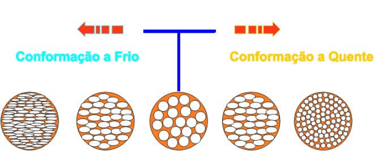 <p>22 .</p><p>II - PROCESSOS METALÚRGICOS DE CONFORMAÇÃO</p><p>1.Introdução</p><p>Nem sempre a estrutura de um metal obtido por fundição é adequado para determinadas aplicações</p><p>que exigem altas resistências à tração e ductilidade, como é o caso, por exemplo, de perfis</p><p>estruturais, chapas que serão conformadas, fios, cabos, etc.</p><p>Para obtenção de propriedades mais compatíveis com estes tipos de aplicação, os metais passam</p><p>por outros tipos de processamento, que se caracterizam por trabalharem o metal através da</p><p>aplicação de pressão ou choque.</p><p>Este trabalho visa duas coisas: obtenção do metal na forma desejada e melhoria de suas</p><p>propriedades mecânicas, o que é obtido com o rompimento e refino da estrutura dendrítica presente</p><p>nos metais fundidos.</p><p>Embora, de forma geral esses processos produzam produtos classificados como primários, tais como</p><p>chapas, barras e perfis, eles podem dar origem, também, a produtos acabados, tais como trilhos,</p><p>arames, tubos, etc.</p><p>Os processos metalúrgicos de conformação são: A laminação, a trefilação, o forjamento e a extrusão.</p><p>2. Conformação a Quente e a Frio</p><p>Dependendo do processo, o metal pode ser trabalhado a quente ou a frio:</p><p>Podemos definir como trabalho a quente aquele feito acima da temperatura de recristalização do</p><p>metal e trabalho a frio como aquele realizado abaixo desta temperatura, ou seja, na maioria dos</p><p>casos, à temperatura ambiente. Vide o esquema da figura 29.</p><p>(-)</p><p>Material se</p><p>2.1. Características do</p><p>• Grãos deformados duran</p><p>• Nesta mudança os grã</p><p>aumenta a tenacidade do</p><p>• O metal aumenta sua re</p><p>existentes são segregada</p><p>• O trabalho a quente é</p><p>realização, porém que re</p><p>• O metal pode ser deform</p><p>dos cristais elimina ruptu</p><p>que no trabalho a frio.</p><p>• A temperatura de trabal</p><p>evitar a formação de gran</p><p>• As temperaturas altas ox</p><p>podem ser mantidas.</p><p>2.2. Características do</p><p>Prof. Fernando Penteado</p><p>Temperatura deRecristalização</p><p>(+)</p><p>encrua Material se recristaliza</p><p>Figura 29</p><p>Trabalho a Quente:</p><p>te o processo, logo mudam para novos grãos não deformados.</p><p>os podem ser afinados através de rompimento e reformação, o que</p><p>metal.</p><p>sistência à tração em determinada direção, uma vez que as impurezas</p><p>s em fibras com orientação definida.</p><p>mais fácil e rápido, exigindo máquinas de potência menor para sua</p><p>sistam às altas temperaturas do processo.</p><p>ado em formas extremas quando quente, porque a reformação contínua</p><p>ras e trincas. Conseqüentemente as deformações são mais profundas</p><p>ho deve ser acima da de recristalização, mas não muito elevada para</p><p>ulometria grosseira.</p><p>idam e formam carepa na superfície do metal e tolerâncias rigorosas não</p><p>Trabalho a Frio:</p><p>23</p><p>• O trabalho a frio é normalmente precedido do trabalho a quente, remoção de carepa, limpeza da</p><p>superfície e possivelmente decapagem.</p><p>• Com este tipo de trabalho obtêm-se tolerâncias rigorosas, bom acabamento superficial e boas</p><p>propriedades mecânicas.</p><p>• O trabalho a frio deve ser efetuado acima do limite de escoamento do material para que a</p><p>deformação seja permanente.</p><p>• Quando um metal é trabalhado a frio os seus cristais são internamente deformados, provocando</p><p>aumento de dureza e da resistência mecânica, perda de ductilidade e aumento das tensões</p><p>residuais que, muitas vezes, poderão levar à ruptura da peça. Vide a figura 30.</p><p>• Isso pode ser evitado através de um tratamento térmico de recozimento ou normalização que faz</p><p>o metal retornar às suas condições originais ou próximo delas.</p><p>• As máquinas para execução de trabalhos a frio devem poder exercer forças muito maiores do que</p><p>as projetadas para trabalhos a quente, portanto devem ser mais robustas.</p><p>Figura 30</p><p>2.3. Noções sobre a Fabricação de Aços</p><p>A principal matéria-prima para fabricação do aço é o gusa líquido que consiste em ferro líquido</p><p>contendo, em solução, carbono, silício, manganês, fósforo e enxofre. Outro material usado é a sucata</p><p>proveniente das linhas de laminação e também da própria aciaria.</p><p>O gusa líquido proveniente do alto-forno e a sucata são misturados no forno conversor, onde são</p><p>convertidos em aço.</p><p>O processo de conversão consiste na oxidação dos elementos dissolvidos no ferro líquido com a</p><p>conseqüente formação de óxidos que constituirão a escória, juntamente com a cal e a fluorita</p><p>adicionadas. Para que isto ocorra, oxigênio é soprado no banho. O grau de oxidação e a</p><p>conseqüente eliminação ou redução de determinados elementos químicos é função do tempo de</p><p>sopro.</p><p>Após o sopro é retirada amostra do banho e da escória para efetuar-se a análise preliminar. Com</p><p>base nesta análise são efetuadas as adições à panela, durante o vazamento do aço, para controlar a</p><p>oxidação do ferro e para colocar a composição química do mesmo, dentro da especificação</p><p>solicitada.</p><p>O oxigênio dissolvido no banho mais o oxigênio do ar reagem com as adições, formando óxidos.</p><p>Parte dos óxidos (de alumínio, de silício, de manganês e de ferro), sendo partículas sólidas imersas</p><p>no ferro líquido, sofrem, empuxo, deslocando-se para a superfície na panela e formando uma crosta.</p><p>Outra parte não tem tempo ou condições de emergir e ficará retida no interior do aço solidificado.</p><p>O aço líquido é vazado da panela para as lingoteiras onde se inicia o processo de solidificação do</p><p>mesmo.</p><p>O nível de oxigênio do banho, associado à técnica de d