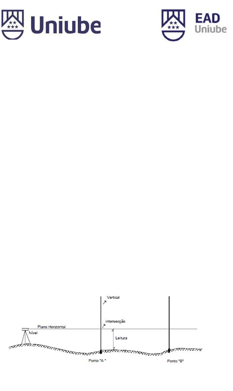 <p>ROTEIRO DE PRÁTICA LABORATORIAL Nº 918015-4</p><p>1. Componente curricular: Geomática</p><p>2. Título do roteiro de aula prática:</p><p>NIVELAMENTO GEOMÉTRICO SIMPLES E COMPOSTO</p><p>3. Tempo previsto: 3 horas-aula</p><p>4. Objetivos</p><p>· Capacitar o aluno a identificar e utilizar o método de nivelamento geométrico simples e composto, bem como efetuar sua aplicação nas atividades cotidianas da engenharia civil.</p><p>5. Referencial teórico</p><p>5.1. Nivelamento Geométrico</p><p>Neste tipo de nivelamento, os dados são colhidos através de viradas horizontais. Consiste, portanto, em criar um plano horizontal e determinar as interseções deste plano com uma série de verticais levantadas nos pontos a nivelar para, em seguida, obter a distância vertical desses pontos até o plano de referência.</p><p>Figura 1 – Nivelamento geométrico</p><p>5.1.1. Nivelamento Geométrico Simples</p><p>Através de uma única estação do instrumento, determinam-se as DN dos pontos a nivelar. Se o instrumento ficar equidistante dos extremos, então evitará os erros de curvatura terrestre e refração atmosférica, pelo fato da anulação. Na prática, a distância ideal é de, no máximo, 50m para cada lado.</p><p>Figura 2 – Nivelamento geométrico simples</p><p>5.1.2. Nivelamento Geométrico Composto</p><p>Devido aos desníveis acentuados e à extensão dos pontos a nivelar, torna-se necessário estacionar o aparelho em mais de uma posição, para se nivelar o local em estudo. Então, decompõe-se o trecho a nivelar em trechos menores e realiza-se uma sucessão de nivelamentos geométricos simples.</p><p>Figura 3 – Nivelamento geométrico simples</p><p>5.2. Sistemas e instrumentos de medidas</p><p>Em geral, nos levantamentos de áreas em geomática, são utilizadas distâncias no sistema métrico decimal e medidas angulares no sistema sexagesimal (grau, minuto e segundo). Para que se obtenha uma maior precisão nos cálculos, não é aconselhável que sejam feitos arredondamentos de valores. Deve-se utilizar o valor numérico total e, somente no final, é feito o arredondamento utilizando duas casas decimais.</p><p>Os principais instrumentos de medida utilizados para esses tipos de trabalho são: trena, mira graduada, teodolito e bússola.</p><p>6. Equipamentos necessários</p><p>Tabela 1 – Relação de equipamentos utilizados na aula prática</p><p>Item</p><p>Quant.</p><p>Descrição</p><p>1</p><p>1 *</p><p>Nível ótico (nível de engenheiro)</p><p>2</p><p>1 *</p><p>Tripé para teodolito</p><p>3</p><p>1 *</p><p>Mira graduada em centímetros</p><p>4</p><p>1</p><p>Prumo de centro</p><p>5</p><p>1</p><p>Bússola de mão</p><p>6</p><p>1</p><p>Trena de fibra de vidro de 50 metros</p><p>7</p><p>1</p><p>Marreta 2 Kilogramas</p><p>8</p><p>10 *</p><p>Estacas de madeira</p><p>(*) Quantidade necessária para cada grupo de até 6 alunos, segundo diretriz institucional.</p><p>Figura 4 – Equipamentos utilizados na aula prática</p><p>2</p><p>1</p><p>5</p><p>8</p><p>4</p><p>3</p><p>6</p><p>7</p><p>7. Insumos necessários</p><p>Neste experimento, não são necessários insumos.</p><p>8. Procedimentos experimentais</p><p>8.1. Procedimentos para demarcação da área de estudo</p><p>Escolher uma área de estudo que contenha um talude (plano inclinado, rampa, barranco, etc.) com uma boa inclinação, a fim de permitir a execução do nivelamento. Cada grupo de alunos (até 6 componentes) deve fixar estacas alinhadas no sentido de inclinação e equidistantes a cada 2 ou 5 metros. Escolher um ponto que permita a visada do máximo possível de pontos.</p><p>Figura 5 – Fixação das estacas em área inclinada</p><p>8.2 Procedimentos para levantamento planimétrico da área de estudo</p><p>Estacionar o equipamento no ponto determinado (na Figura 5, ponto C). Escolher uma cota arbitrária para esse ponto (por exemplo 650). Depois, medir a altura do instrumento e efetuar a leitura de todos os pontos possíveis (A, B, D, e E). Preencher a caderneta de campo (Tabela 2).</p><p>No caso do exemplo (Figura 5), não será possível efetuar todas as leituras com a estação estacionada em um único ponto. Portanto, assim que efetuar a leitura do ponto E, deve-se estacionar o equipamento no ponto F, fazer uma ré no ponto E, logo depois efetuar leitura de vante nos pontos G e H.</p><p>Tabela 2 – Caderneta de campo</p><p>CADERNETA DE CAMPO</p><p>Estação</p><p>Ponto visado</p><p>Altura instrumento</p><p>Leitura fio médio</p><p>Cota</p><p>C</p><p>A</p><p>C</p><p>B</p><p>C</p><p>D</p><p>C</p><p>E</p><p>F</p><p>E</p><p>F</p><p>G</p><p>F</p><p>H</p><p>9. Cálculos e análises de resultados</p><p>Agora, mantendo os mesmos grupos, os alunos devem fazer os cálculos necessários e preencher as cotas dos pontos visados (coluna 5 da Tabela 2).</p><p>FÓRMULAS:</p><p>Cota no ponto = Cota estação + altura instrumento – Fio médio no ponto (vante)</p><p>Cota estação = Cota último ponto + ré – altura instrumento na nova estação</p><p>Ré = Fio médio lido com o equipamento na nova estação e mira no último ponto conhecido</p><p>10. Referências</p><p>ESPARTEL, Lelis. Caderneta de campo.10.ed. Porto Alegre (RS): Globo, 1977. 655 p, il.</p><p>GHILANI, C.D., WOLF, P.R. Geomática. São Paulo: Pearson Education do Brasil, 2013.</p><p>SOARES, L. S. Z. R. et al. Topografia e conforto ambiental. Uberaba: Uniube 2013.</p><p>Elaboração do roteiro: Prof. Me. Julio Cesar Martins Deamo Data: 18/10/2017</p><p>Revisão: Prof. Me. Plauto Riccioppo Filho Data: 07/12/2017</p><p>Organização: Prof. Me. Plauto Riccioppo Filho Data: 07/12/2017</p><p>image3.png</p><p>image4.jpeg</p><p>image5.jpeg</p><p>image6.jpeg</p><p>image7.jpeg</p><p>image8.jpg</p><p>image9.jpeg</p><p>image10.jpeg</p><p>image11.jpeg</p><p>image12.emf</p><p>image1.png</p><p>image2.png</p><p>image13.emf</p><p>image14.jpeg</p>