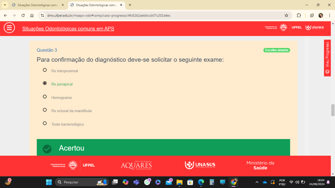 <p>Situações Odontológicas comu Situações Odontológicas comu + - de Situações Odontológicas comuns em APS Medicine Social UFPEL UNA-SUS Questão 3 Escolha simples Para confirmação do diagnóstico deve-se solicitar o seguinte exame: Rx interproximal O Rx periapical Hemograma Rx oclusal da mandíbula Teste bacteriológico Acertou GRUPO DE PESQUISA Departamento de Medicina Social UFPEL AQUARES UNASUS Ministério da Saúde POR 18:04 Pesquisar T + PTB2 24/08/2024</p>