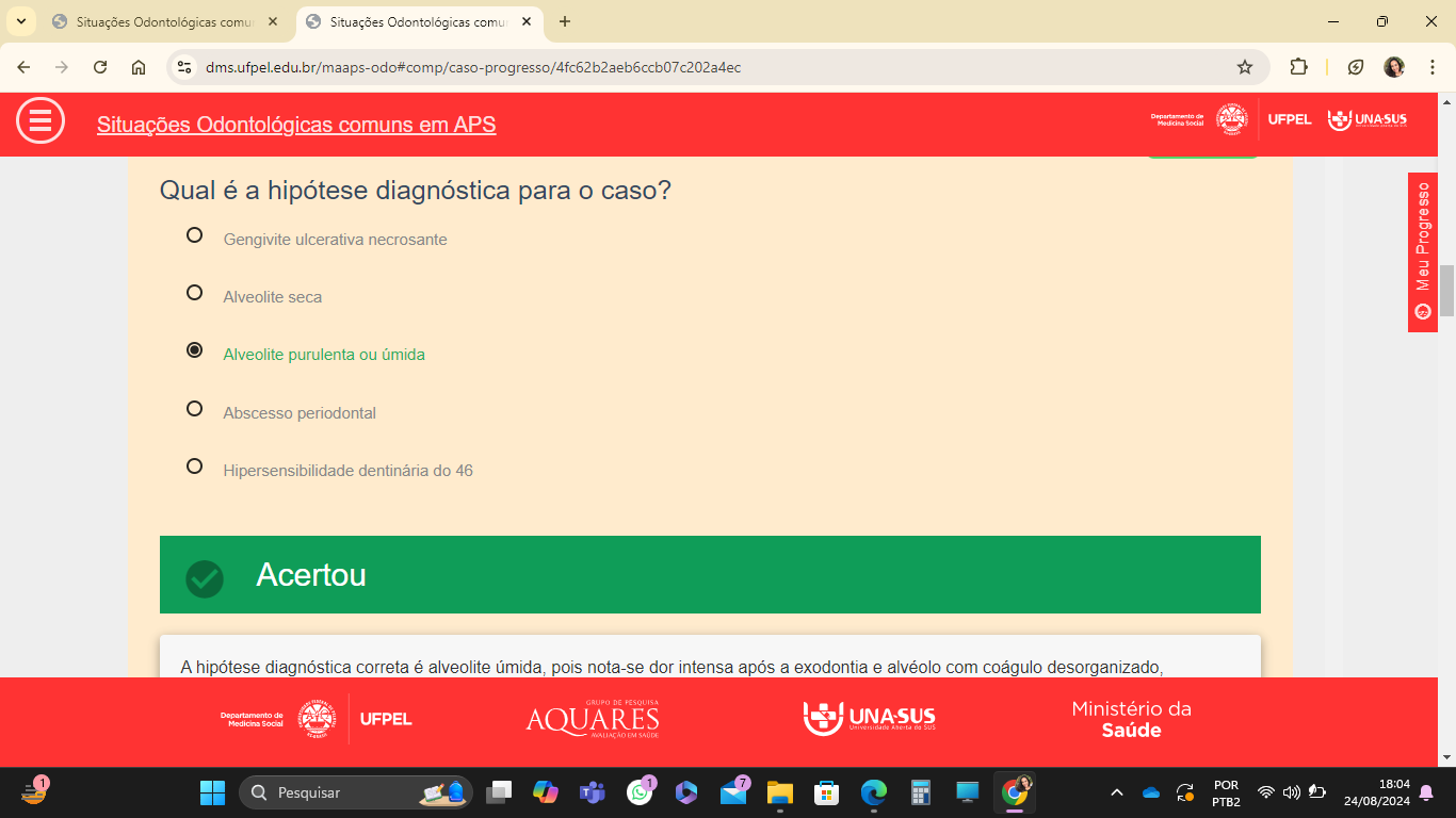 <p>Situações Odontológicas comu Situações Odontológicas comu + - 4 Departament de Situações Odontológicas comuns em APS Social UFPEL Qual é a hipótese diagnóstica para o caso? Gengivite ulcerativa necrosante Alveolite seca O Alveolite purulenta ou úmida Abscesso periodontal Hipersensibilidade dentinária do 46 Acertou A hipótese diagnóstica correta é alveolite úmida, pois nota-se dor intensa após a exodontia e alvéolo com coágulo desorganizado, GRUPO DE Departamento de Medicina Social UFPEL AQUARES Ministério da Saúde - POR 18:04 Pesquisar T C PTB2 24/08/2024</p>