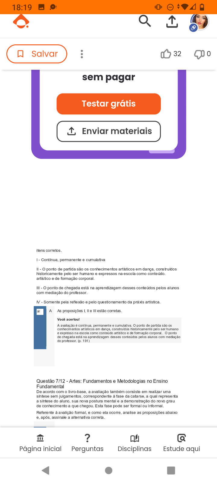 <p>18:19 Salvar 32 0 sem pagar Testar grátis Enviar itens - permanente e cumulativa II ponto de partida são os conhecimentos artísticos em dança, construídos historicamente pelo ser humano e expressos na escola como e de formação III ponto de chegada está na aprendizagem desses conteúdos pelos alunos com mediação do professor. M - Somente pela reflexão e pelo questionamento da práxis A As proposições III estão Você acertou! A avaliação é continua, permanente e cumulativa ponto de partida são os conhecimentos em dança, historicamente pelo ser humano e expresso na escola como e de formação ponto de chegada está na aprendizagem desses conteúdos pelos alunos com mediação do professor. (p. 191) Questão 7/12 - Artes: Fundamentos e Metodologias no Ensino Fundamental De acordo com a avaliação também consiste em realizar uma sintese sem julgamentos, correspondente à fase da a qual representa a sintese do sua nova postura mental e a demonstração do novo grau de conhecimento a que chegou. Esta fase pode ser formal ou Referente à avalição e como ela ocorre, analise as proposições abaixo após, assinale a alternativa ? Q Página inicial Perguntas Disciplinas Estude aqui</p>