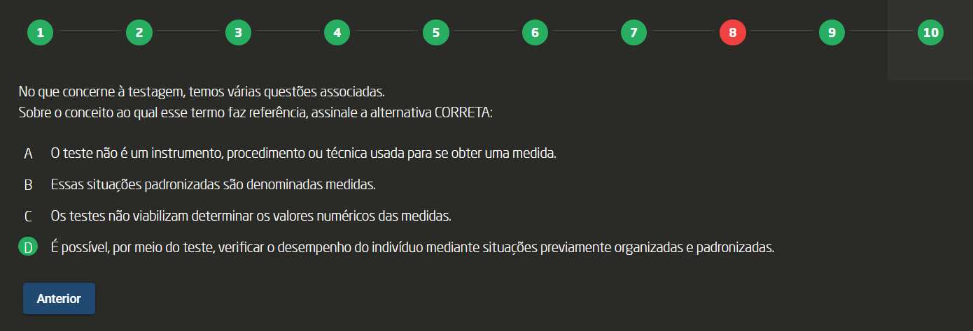 <p>1 2 3 4 5 6 7 8 9 10 No que concerne à testagem, temos várias questões associadas. Sobre conceito ao qual esse termo faz referência, assinale a alternativa CORRETA: A teste não é um instrumento, procedimento ou técnica usada para se obter uma medida. B Essas situações padronizadas são denominadas medidas. Os testes não viabilizam determinar os valores numéricos das medidas. D É possível, por meio do teste, verificar desempenho do indivíduo mediante situações previamente organizadas e padronizadas. Anterior</p>