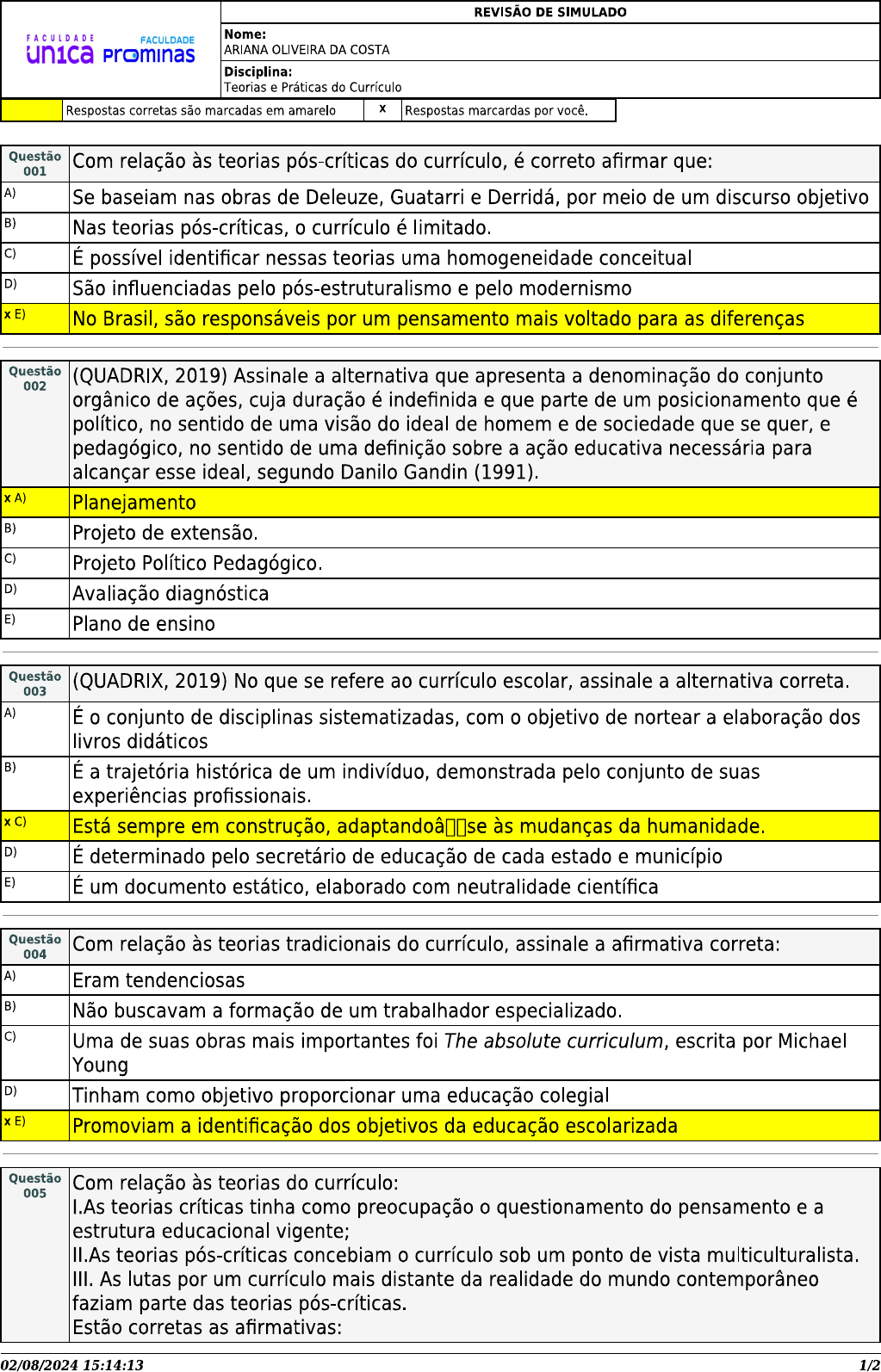 <p>REVISÃO DE SIMULADO FACULDADE Nome: FACULDADE unica prominas ARIANA OLIVEIRA DA COSTA Disciplina: Teorias e Práticas do Currículo Respostas corretas são marcadas em amarelo X Respostas marcardas por você. Questão Com relação às teorias pós-críticas do currículo, é correto afirmar que: 001 A) Se baseiam nas obras de Deleuze, Guatarri e Derridá, por meio de um discurso objetivo B) Nas teorias pós-críticas, o currículo é limitado. C) É possível identificar nessas teorias uma homogeneidade conceitual D) São influenciadas pelo pós-estruturalismo e pelo modernismo x E) No Brasil, são responsáveis por um pensamento mais voltado para as diferenças Questão (QUADRIX, 2019) Assinale a alternativa que apresenta a denominação do conjunto 002 orgânico de ações, cuja duração é indefinida e que parte de um posicionamento que é político, no sentido de uma visão do ideal de homem e de sociedade que se quer, e pedagógico, no sentido de uma definição sobre a ação educativa necessária para alcançar esse ideal, segundo Danilo Gandin (1991). x A) Planejamento B) Projeto de extensão. C) Projeto Político Pedagógico. D) Avaliação diagnóstica E) Plano de ensino Questão (QUADRIX, 2019) No que se refere ao currículo escolar, assinale a alternativa correta. 003 A) É o conjunto de disciplinas sistematizadas, com o objetivo de nortear a elaboração dos livros didáticos B) É a trajetória histórica de um indivíduo, demonstrada pelo conjunto de suas experiências profissionais. Está sempre em construção, às mudanças da humanidade. D) É determinado pelo secretário de educação de cada estado e município E) É um documento estático, elaborado com neutralidade científica Questão Com relação às teorias tradicionais do currículo, assinale a afirmativa correta: 004 A) Eram tendenciosas B) Não buscavam a formação de um trabalhador especializado. C) Uma de suas obras mais importantes foi The absolute curriculum, escrita por Michael Young D) Tinham como objetivo proporcionar uma educação colegial x E) Promoviam a identificação dos objetivos da educação escolarizada Questão Com relação às teorias do currículo: 005 I.As teorias críticas tinha como preocupação o questionamento do pensamento e a estrutura educacional vigente; II.As teorias pós-críticas concebiam o currículo sob um ponto de vista multiculturalista. III. As lutas por um currículo mais distante da realidade do mundo contemporâneo faziam parte das teorias pós-críticas. Estão corretas as afirmativas: 02/08/2024 15:14:13 1/2</p><p>A) I e III B) Todas estão corretas C) apenas x D) I e Il apenas E) e III apenas. Questão QUADRIX, 2019) A respeito do planejamento escolar, assinale a alternativa correta. 006 A) É o processo de planejamento da atividade docente voltada para a manutenção do status quo social. B) É o processo de seleção dos conteúdos que deverão ser ministrados em uma aula C) É um momento de reflexão sobre as temáticas curriculares necessárias à progressão dos alunos nos níveis de ensino x D) É estruturado e articulado nos níveis escolar, curricular e de aula. E) É o conjunto de formulários que devem ser preenchidos pela equipe diretiva da escola, a fim de manter o controle administrativo. Questão (FUNIVERSA, 2015) No campo de estudo do currículo, existem diversas teorias que 007 podem ser obtidas para buscar seus diferentes significados em diferentes contextos. Sobre as teorias do currículo, selecione uma alternativa correta. A) Para uma teoria crítica, questões técnicas são mais importantes que o conteúdo propriamente dito. Preocupa-se com a transmissão dos conteúdos B) A teoria pós-crítica preocupa-se com questões relacionadas à organização curricular, e não com sua aplicação prática C) Nas teorias críticas e pós-críticas, uma prática docente não é levada em conta para análise e compreensão do conceito de currículo x D) As teorias tradicionais valorizam as teorias neutras ou científicas que estejam a serviço de verdade E) Nas teorias tradicionais, uma reflexão dá-se a partir das relações entre saber, identidade e poder Questão (AOCP, 2018) A avaliação em uma perspectiva crítica de currículo pressupõe 008 A) um foco na produtividade, ou seja, na aprendizagem do aluno x B) ser um meio de obter informações sobre o desenvolvimento da prática pedagógica, para a dessa prática e dos processos de aprendizagem. C) que os conteúdos prevalecem sobre os aspectos relacionados ao desenvolvimento. D) uma preponderância dos aspectos quantitativos sobre os qualitativos do ensino E) a memorização como forma de desenvolvimento das habilidades psicológicas superiores. 02/08/2024 15:14:13 2/2</p>
