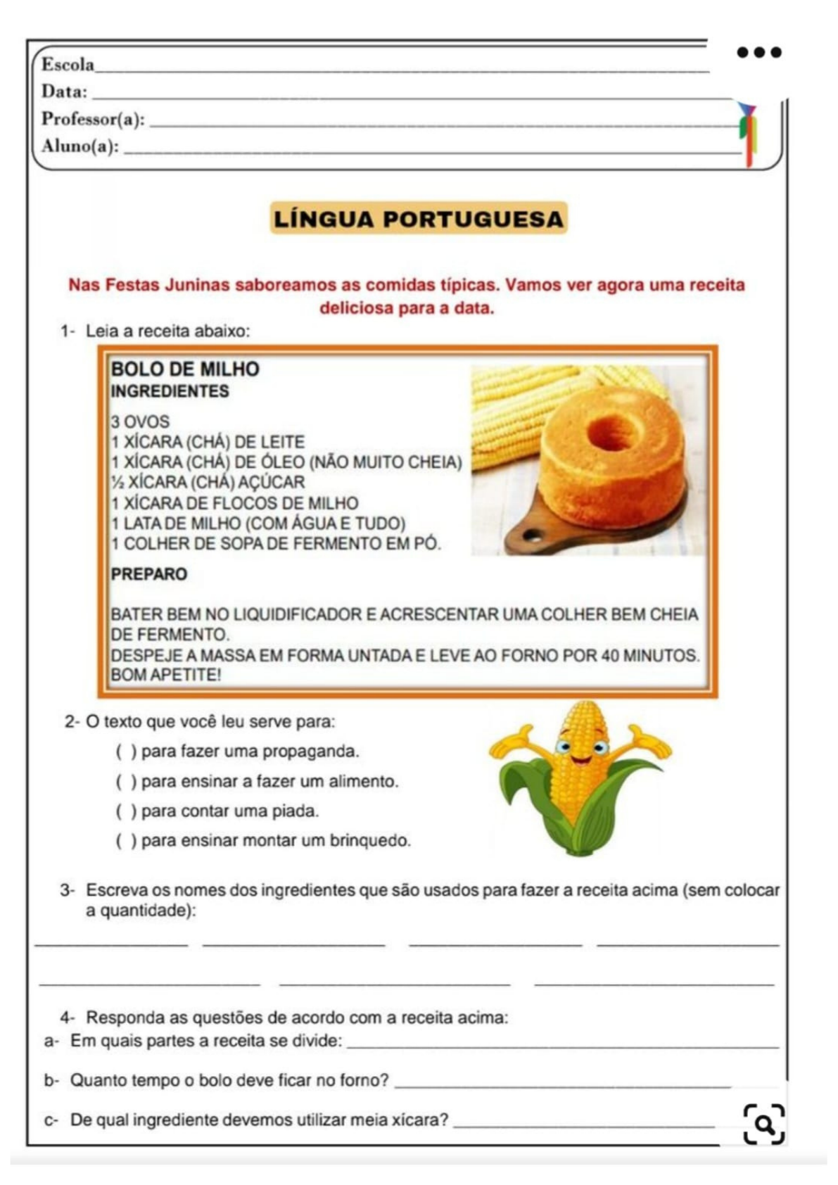 <p>Escola Data: Professor(a): Aluno(a): LÍNGUA PORTUGUESA Nas Festas Juninas saboreamos as comidas típicas. Vamos ver agora uma receita deliciosa para a data. 1- Leia a receita abaixo: BOLO DE MILHO INGREDIENTES 3 ovos 1 XICARA (CHÁ) DE LEITE 1 XICARA DE ÓLEO (NÃO MUITO CHEIA) 1/2 XICARA (CHA) AÇÚCAR 1 XICARA DE FLOCOS DE MILHO 1 LATA DE MILHO (COM ÁGUA E TUDO) 1 COLHER DE SOPA DE FERMENTO EM PÓ. PREPARO BATER BEM NO LIQUIDIFICADOR E ACRESCENTAR UMA COLHER BEM CHEIA DE FERMENTO. DESPEJE A MASSA EM FORMA UNTADA E LEVE AO FORNO POR 40 MINUTOS. BOM APETITE! 2- o texto que você leu serve para: ( ) para fazer uma propaganda. para ensinar a fazer um alimento. ) para contar uma piada. para ensinar montar um brinquedo. 3- Escreva os nomes dos ingredientes que são usados para fazer a receita acima (sem colocar a quantidade): 4- Responda as questões de acordo com a receita acima: a- Em quais partes a receita se divide: b- Quanto tempo o bolo deve ficar no forno? C- De qual ingrediente devemos utilizar meia xicara? (a)</p>
