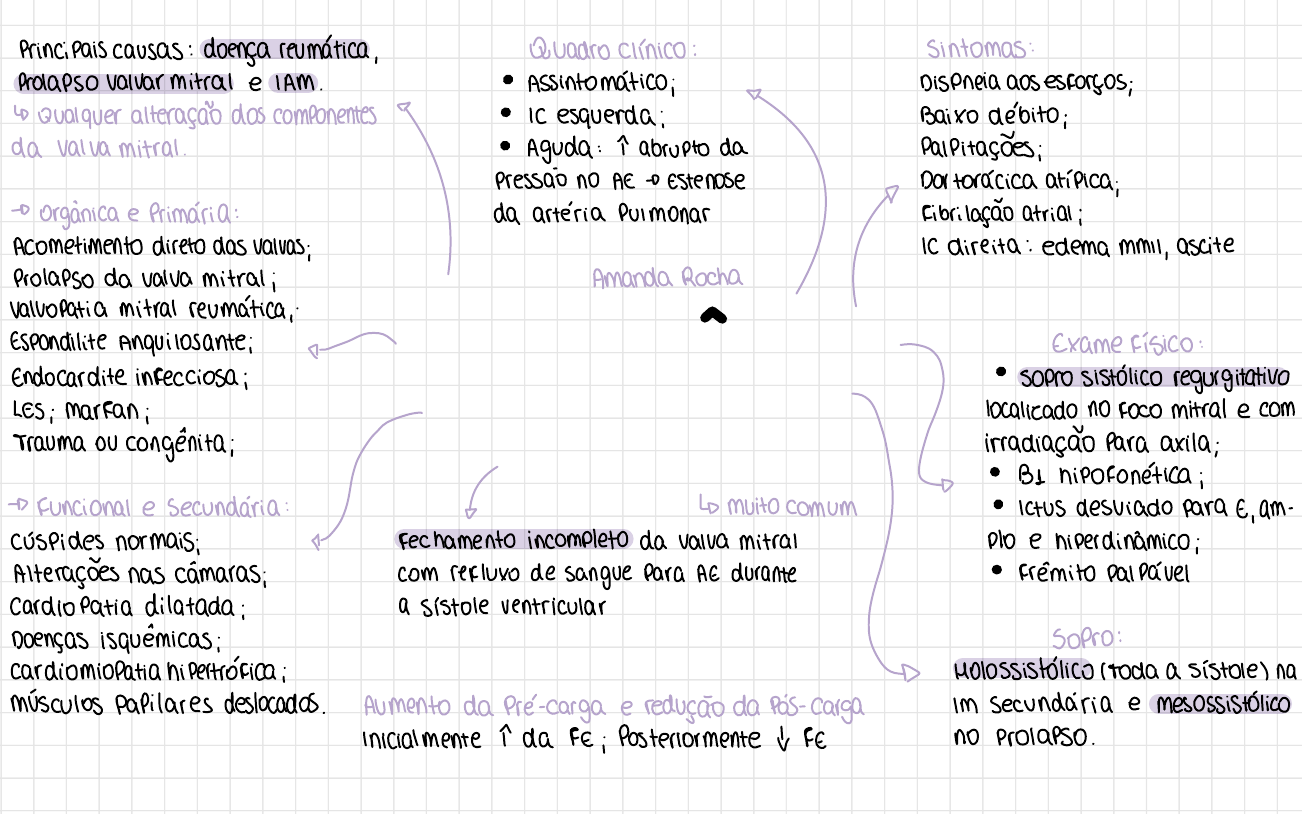 <p>Insuficiencia</p><p>Mitral</p><p>principais causas:doença reumática, Quadro clínico: Sintomas:</p><p>Prolapso Valvar mitral e IAM. ·Assintomático;</p><p>T</p><p>Dispneia aosesporços;</p><p>↳ Qualquer alteração dos componentes T ·iesquerda; Baixo débito;</p><p>da valva mitral. ·Aguda:I abrupto da palpitações;</p><p>pressão no Ae - estenose</p><p>-> orgânica e Primária: da artéria pulmonar</p><p>yDoutorasicaatipae</p><p>Acometimento direto das valvas; IC direita:edemammil, ascite</p><p>Prolapso da valva mitral; Amanda Rocha</p><p>valvopatia mitral reumática,</p><p>espondilite Anquilosante; - exame rísico:</p><p>Endocardite infecciosa; sopro sistólico regurgitativo</p><p>Trauma ou congênita; 2 irradiaçãopara axila;</p><p>Les;Markan;</p><p>I !</p><p>localizado no poco mitral e com</p><p>·B1 hipoponética;</p><p>-> puncional e secundária: t</p><p>↳muito comum · ictus desviado para E, am-</p><p>cuspides normais; Rechamento incompleto da valva mitral plo e hiperdinâmico;</p><p>e</p><p>Alterações nas câmaras; com repluxo de sangue para Aedurante premito palpável</p><p>cardiopatia dilatada; a sistole ventricular</p><p>Doenças isquêmicas; SOPrO:</p><p>cardiomiopatia hipertrópica; molossistólico roda a sistolel na</p><p>músculos papilares deslocados.Aumento da Pré-carga e redução da Pós-carga Im secundária e mesossistólico</p><p>Inicialmenteida e;Posteriormente ! Pe no prolapso.</p>