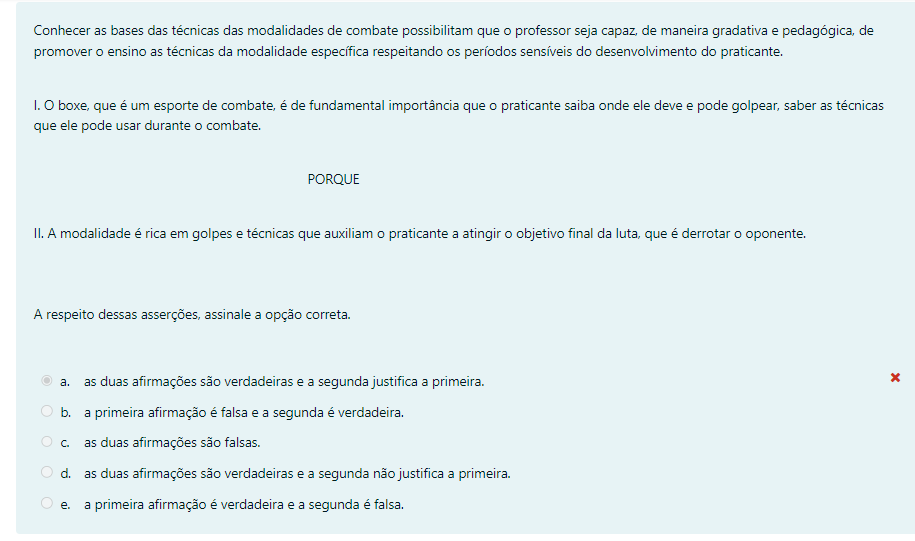 <p>Conhecer as bases das técnicas das modalidades de combate possibilitam que professor seja capaz, de maneira gradativa e de promover ensino as técnicas da modalidade específica respeitando os períodos sensíveis do desenvolvimento do praticante. I. boxe. que é um esporte de combate, é de fundamental importância que praticante saiba onde ele deve e pode golpear, saber as técnicas que ele pode usar durante combate. PORQUE II. A modalidade é rica em golpes e técnicas que auxiliam praticante a atingir objetivo final da luta, que é derrotar oponente. A respeito dessas asserções, assinale a opção correta. a. as duas afirmações são verdadeiras e a segunda justifica a primeira x b. a primeira afirmação é falsa e a segunda é verdadeira. as duas afirmações são falsas. d. as duas afirmações são verdadeiras e a segunda não justifica a primeira. e. a primeira afirmação é verdadeira e a segunda é falsa.</p>