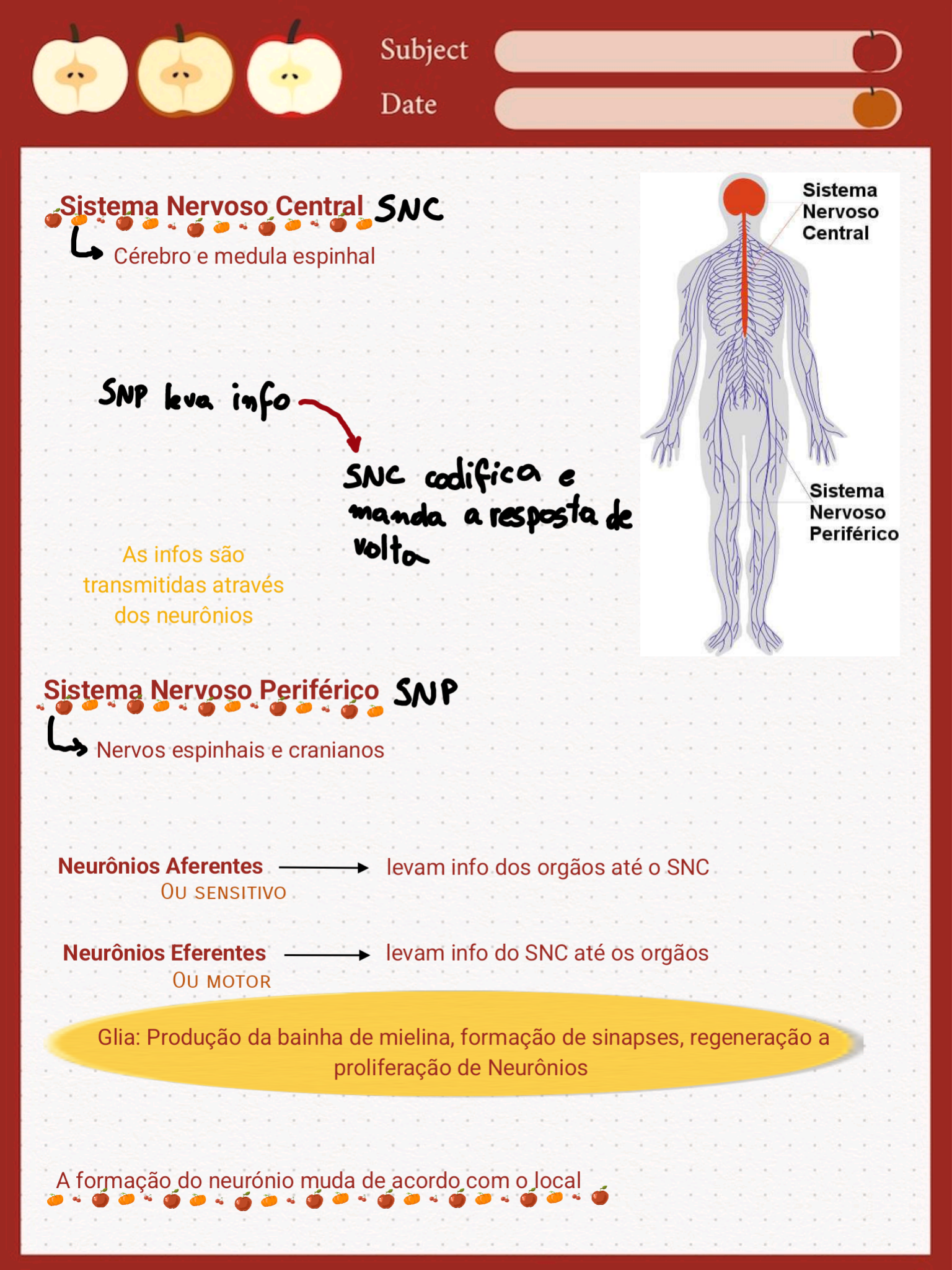 <p>Date Sistema Sistema Nervoso Central SNC Nervoso Central Cérebro e medula espinhal SNP kva info SNC codifica e Sistema a resposta Nervoso Periférico As infos são transmitidas através dos neurônios Sistema Nervoso Periférico SNP Nervos espinhais e cranianos Neurônios Aferentes levam info dos orgãos até o SNC Ou SENSITIVO Neurônios Eferentes levam info do SNC até os MOTOR Glia: Produção da bainha de mielina, formação de sinapses, regeneração a proliferação de Neurônios A formação do neurónio muda de acordo com o local</p><p>Date Cell body (soma) Axon Oligodendrocyte Via para Cell membrane enviar info Dendrite C recebe a info de outros neurônios Node of Ranvier No SNP a banha é formada pelas células de Schwann Myelin sheath Aumenta a velocidade da info no SNC a bainha é formada por Oligodendrócitos Synapse Terminal do Axônio Divisão anatômica ddo SNC: livia info para os outros celulas Medula espinhal Medula oblonga (bulbo) Ponte Tronco Cerebral Mesencéfalo Diencéfalo Divisões do Encéfalo Telencéfalo cérebro Anterior Recebe Info dos membros e passa para cerebral Medula espinhal Movimento de (executa) Transmissão Face e cabeça e normal, lenta membros Infomação direta Usada em momentos de Manda a resposta Cérebro anterior resposta rápida, fuga</p><p>Subject Date Medula espinhal medula oblonga Potencial de ação Potencial de ação Nervos cranianos Potencial de ação Sensores de pele, Articulação, cérebro e órgãos Suporte Básico da vida Cabeça e pescoço (cardiovascular, respiração, deglutição, paladar) Córtex cerebral Mesencéfalo Processa e transmite info visuais e auditivos Ponte Transmite a informação Nervos cranianos Diversas regiões do cérebro Movimento ocular, constrição Cerebelo da pupila, e reflexos oculares específicos Função: Controlar o movimento coordenado, preciso e uniforme e realizar o aprendizado motor Diencéfalo hipotálamo Tálamo Regula o sistema nervoso autônomo, Modula e transmite controla a secreção hormonal da glândula info para o córtex hipófise e fas controle da Homeostasia (temperaura, pressão, alimentação...)</p><p>Subject Date Telencéfalo Córtex Cerebral Composto por Hipocampo Gânglios Basais Integração sensorial, percepção Memória e sensorial e execução de aprendizado espacial sensorial de movimento voluntário Modulam as funções motoras do Córtex cerebral Como essas informações são transmitidas? Através do potencial de ação que manda essas infos pra sinapse! A sinapse é a comunicação entre dois neurônios (o neuronio pré-sinaptico e do neurononio pós sinaptico) MECANISMOS DA NEUROTRANSMISSÃO QUÍMICA 1 1. Chegada do impulso nervoso ao terminal Ca++ PA Acetilcolina 2. Abertura de Canais de Ca++ 2 Voltagem dependentes Enzima Ca++ 3. Influxo de Ca++ mensageiro) inativa 3 Enzima Ativa 4. Exocitose dos NT 4 EXOCITOSE 5 5. Interação NT-receptor pós- sináptico causando abertura de Receptor canais NT dependentes 6. Os NT são degradados por Acetilcolinesterase enzimas (acetilcolinesterase, MAO. COMT)</p><p>Subject Date 1 Quais são as 2 principais divisões do sistema nervoso? Sistema nervoso central e sistema nervoso periférico 2 Faça a divisão anatômica do SNC Medula espinhal as cinco divisões dos encéfalo (Medula oblonga, ponte, mesencéfalo, diencéfalo e telencéfalo 3 - Explique os caminhos dos sinais enviados da medula e do tronco cerebral? A medula recebe a informação dos membros e passa para o tronco cerebral, o tronco envia para o cérebro anterior que manda a respost de volta para o tronco cerebral, que por sua vez manda a informação para a medula que executa a ação. Em casos de resposta rapida, o cérebro anterior manda a resposta direto para a medula! 4 Quais são as divisões dos neurônios e a função de cada parte deles Bainha de mielina Aumenta a velocidade da informação Axônio Via para enviar informação Dentritos Recebe a informação de outros neurônios Terminal do axônio envia a informção para outros neurônios Nódulo de Ranvier promove a transmissão saltatória do impulso nervoso Corpo celular possui as organelas 5 - o que é uma sinapse e onde ela ocorre? A sinapse é a comunicação entre dois neurônios (o neuronio pré-sinaptico e do neurononio pós sinaptico). Ocorre entre o dentrito do neurônio pós-sináptico e o terminal do axônio do pré-sináptico 6 Qual a diferença do neurônio aferente para o eferente? Neurônios Aferentes levam info dos orgãos até o SNC Neurônios Eferentes levam info do SNC até os orgãos 7 Qual a função das seguintes partes do sistema nervoso central: medula oblonga, ponte, mesencéfalo, diencéfalo e telencéfalo A medula oblonga participa do suporte básico da vida, a ponte faz a conexão entre o córtex cerebral e o cerebelo, o mesencéfalo processa e transmite informações auditivas, visuais e também participa dos movimentos o diencéfalo regula o sistema controla a secreção hormonal da glândula hipófise e faz controle da homeostasia, o telencéfalo faz integração sensorial, percepção sensorial, execução de sensorial de movimento voluntário, memória e aprendizado espacial</p><p>Subject Date TIPOS DE NEURONIO LESÕES NO TECIDO NEURAL ALGUNS TECIDOS DO CORPO ESTÃO CONSTANTEMENTE SE Isso É DIFERENTE NO SISTEMA NERVOSO Neurônio pseudounipolar SNP: SE OCORRER LESÃO NO AXÔNIO, MAS o CORPO CELULAR CONTINUAR ILESO, ELE PODE FAZER COM QUE UM NOVO AXÔNIO APAREÇA (ESSE PROCESSO PODE LEVAR MESES) SE NÃO OCORRER CORRETAMENTE, o PACIENTE PODE TER DOR FANTASMA E PARESTESIA (SENSAÇÃO Neurônio bipolar ANORMAL) SNC: Os ATRÓCITOS E MICRÓGLIAS INVADEM LESÃO E IMPEDEM o CRESCIMENTO DE UM NOVO AXÔNIO APESAR DE NÃO SER POSSÍVEL CRESCER NOVAS PARTES, os CIRCUITOS PODEM SE REORGANIZAR Neurônio multipolar PARTE ELÉTRICA POTENCIAL DE AÇÃO: DIFERENÇA DE CARGAS ELETRICAS ENTRE DOIS LOCAIS INTRACELULAR EXTRACELULAR QUANDO A CÉLULA TÁ EM REPOUSO, TEM MAIS POTÁSSIO DENTRO