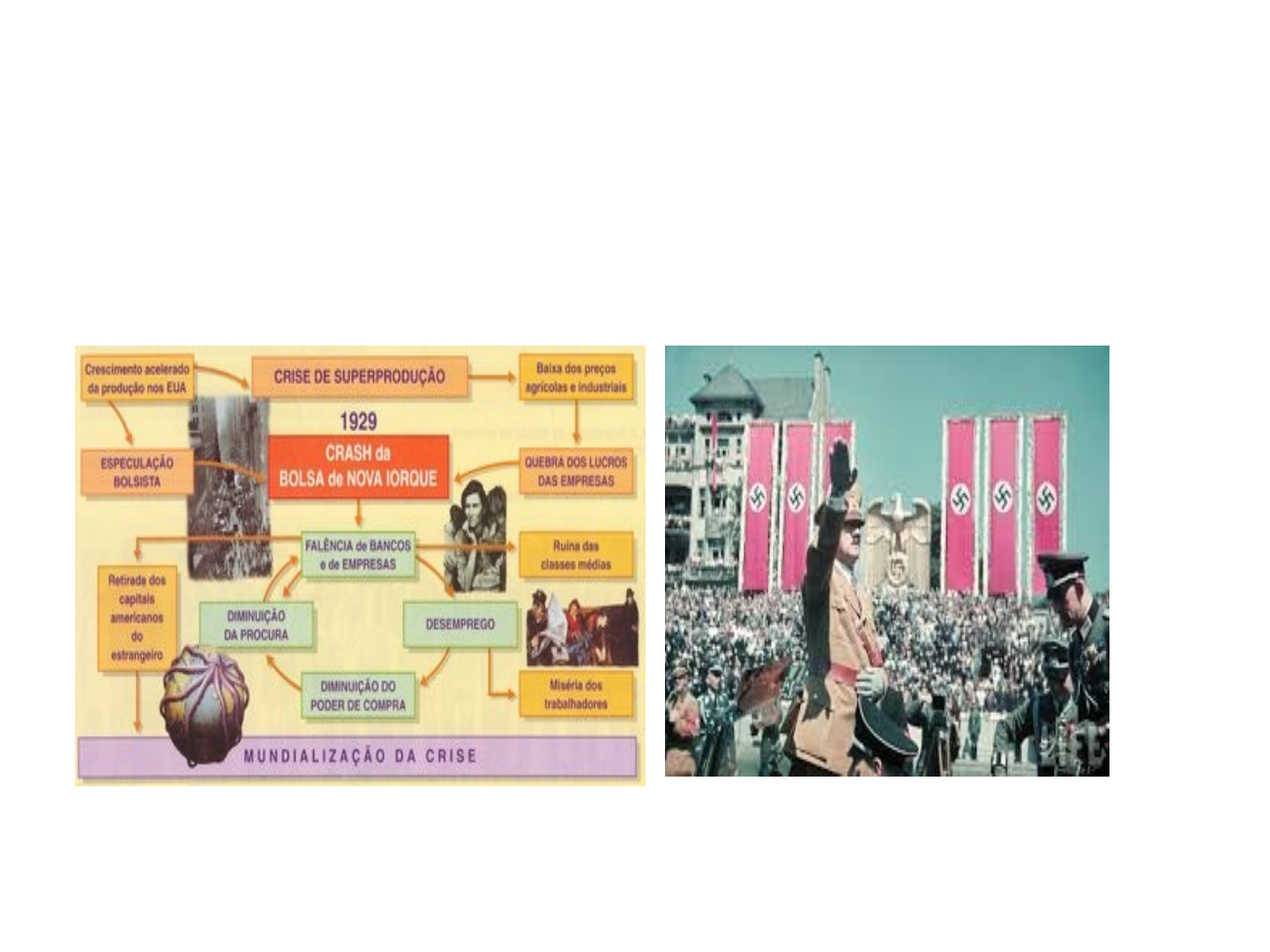 <p>A Crise de 1929 e o nazifascismo</p><p>1. Introdução:</p><p>a) Definição:</p><p>- Momento marcado pela quebra da Bolsa de valores de Nova Iorque, generalização de uma crise econômica mundial e de questionamentos ao liberalismo, ascensão de regimes antiliberais (nazifascismo e comunismo).</p><p>Efeitos da crise:</p><p>- As ações da bolsa se desvalorizaram fortemente em poucos dias. Pessoas muitos ricas, passaram, da noite para o dia, para a classe pobre. O número de falências de empresas foi enorme e o desemprego atingiu quase 30% dos trabalhadores.</p><p>- Como nesta época, diversos países do mundo mantinham relações comerciais com os EUA, a crise acabou se espalhando por quase todos os continentes.</p><p>New Deal: a solução (1933)</p><p>No governo de Franklin Delano Roosevelt, presidente dos EUA, foi colocado em prática o plano conhecido como New Deal:</p><p>controle de preços e da produção das indústrias e das fazendas. Evitando a inflação e a formação de estoques.</p><p>Grandes investimentos em obras públicas (estradas, aeroportos, ferrovias, energia elétrica etc), conseguindo diminuir significativamente o desemprego.</p><p>Na década de 1940 a economia norte-americana já estava funcionando normalmente.</p><p>Nazifascismo:</p><p>Conceito: Modelo de governo (TOTALITÁRIO) característico de alguns países no período entre guerras (1918 – 1939). Ditadura onde o Estado controla a sociedade e o indivíduo é submisso ao Estado.</p><p>ITÁLIA, ALEMANHA, PORTUGAL , ESPANHA.</p><p>Características básicas:</p><p>– Ultranacionalismo (xenófobo).</p><p>– Totalitarismo.</p><p>– Militarismo.</p><p>– Anticomunismo.</p><p>– Antiliberalismo.</p><p>– Unipartidarismo.</p><p>– Culto ao líder.</p><p>– Propaganda governamental</p><p>– Educação dirigida.</p><p>– Racismo (Nazismo).</p><p>– Expansionismo territorial (Nazi)</p><p>– Corporativismo (Fascismo).</p><p>Fascismo Italiano:</p><p>Surgimento dos “Fascio de Combate” (1919): Grupo de combatentes liderados por Benito Mussolini,. Reprimia movimentos populares sociais com extrema violência.</p><p>Formavam tropas fardadas de preto, tendo o apelido de “Camisas Negras”.</p><p>Eram apoiados e financiados por grupos burgueses. (medo do comunismo)</p><p>Transformado no início da década de 20 no Partido Nacional Fascista.</p><p>PROPAGANDA FASCISTA</p><p>–1922: Marcha sobre Roma - 50 mil camisas negras marcham exigindo a colocação de Mussolini no poder.</p><p>–Mussolini assume o poder e implanta ditadura. É chamado de “Duce”.</p><p>–1929: Tratado de Latrão – criação do Estado do Vaticano, que dá ao governo de Mussolini o reconhecimento e apoio da Igreja Católica.</p><p>–Perseguição de opositores (especialmente comunistas), fechamento de partidos, controle do ensino e comunicações, ênfase no patriotismo , criação de obras públicas, incentivo a agricultura e indústria bélica.</p><p>–1936: Reforço do neocolonialismo – invasão da Etiópia.</p><p>Culto à Mussolini</p><p>Nazismo alemão</p><p>A Alemanha após 1ª Guerra Mundial organiza a República de Weimar (presidencialismo-parlamentarista), que enfrenta vários problemas:</p><p>-Tratado de Versalhes. (Humilhação)</p><p>-Dívidas de guerra.</p><p>-Necessidade de reconstrução.</p><p>-Crise econômica.</p><p>- Fome, miséria, desemprego. -Hiperinflação (chegando a 32400% ao mês!).</p><p>-Crescimento dos grupos comunistas nas eleições.</p><p>1919: surgimento do PNSTA (NAZI)</p><p>Grupo semelhante aos fascistas da Itália.</p><p>-Combate a manifestações de comunistas na Alemanha.</p><p>-SA (Seções de Assalto):conhecidos como “Camisas Pardas”- perseguições a opositores,</p><p>Apoio da burguesia ( medo do comunismo)</p><p>-1923: PUTSCH DE MUNIQUE – golpe fracassado dos nazistas.</p><p>-Hitler é preso</p><p>–1932: Devido a crise de 29, os nazistas se fortalecem, e conquistam 1/3 do parlamento alemão (Reichstag).</p><p>–1933: Hitler é nomeado 1º ministro.</p><p>-“Mein Kampf” (Minha Luta): - -</p><p>- superioridade racial, anti-semitismo, espaço vital, não cumprimento do Tratado de Versalhhes.</p><p>–Reichstag é incendiado pelos nazistas – pretexto para seu fechamento bem como o cancelamento de eleições e todos os partidos políticos. Culpa é atribuída aos comunistas que são severamente perseguidos, presos e mortos;</p><p>–1934: Hitler é nomeado “Führer” (guia do povo) e proclama o 3º Reich (Império).</p><p>– Criação das SS (Seções de Segurança – polícia política) e GESTAPO (polícia secreta), ambos para perseguir opositores ou “ameaças” ao regime.</p><p>– 1935: Leis de Nuremberg (início das perseguições aos Judeus)</p><p>ürestrição da cidadania e direitos aos judeus.</p><p>- 1938: Noite dos cristais - 5700 estabelecimentos judaicos (entre eles 267 sinagogas) depredados, como num prenúncio do posterior holocausto.</p><p>As idéias nazistas foram difundidas graças ao talento oratório de Hitler , uma propaganda grandiosa difundindo o nacionalismo, o militarismo, a superioridade ariana, o antissemitismo, o expansionismo. Uso de meios espetaculares para influenciar a opinião pública e atrair o apoio da sociedade aos projetos de Hitler.</p><p>Propaganda sobre a superioridade do homem ariano (Goebbels: espécie ministro das comunicações)</p><p>Total controle da educação</p><p>Foto de crianças alemãs com um livro didático anti-semita chamado Der Giftpilz (O cogumelo venenoso). E o controle da Educação.</p><p>Propaganda do desenvolvimento econômico</p><p>Na cerimônia de acendimento da pira, a suástica apareceu mais do que o simbolo das Olimpíadas</p><p>Investimentos em esportes e espaços esportivos para o povo</p><p>Jesse Owens, norte-americano, ganha qutro medalhas de ouro e deixe Hitler contrariado.</p><p>Ações Nazistas</p><p>–Criação de obras públicas, investimentos na indústria bélica, controle dos trabalhadore